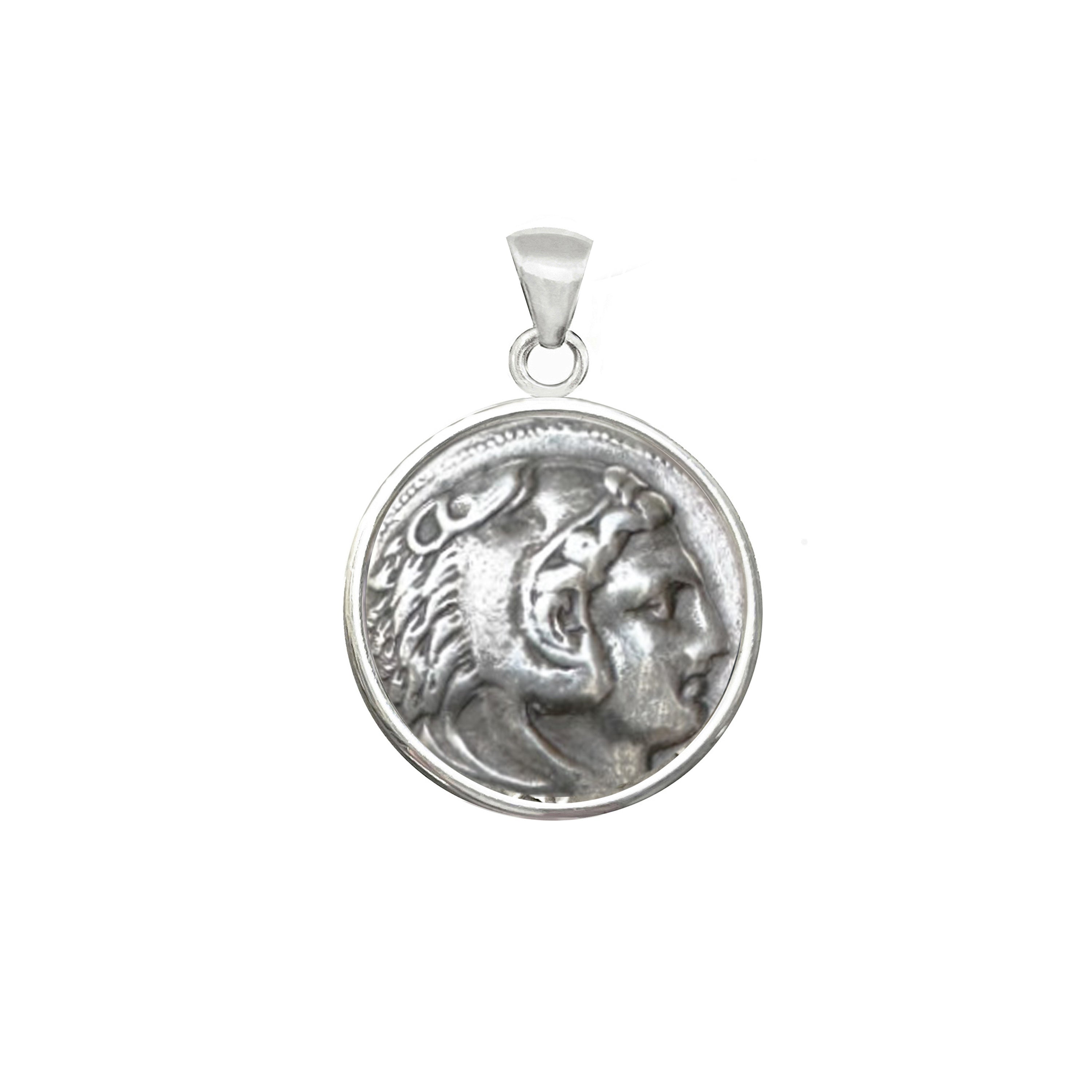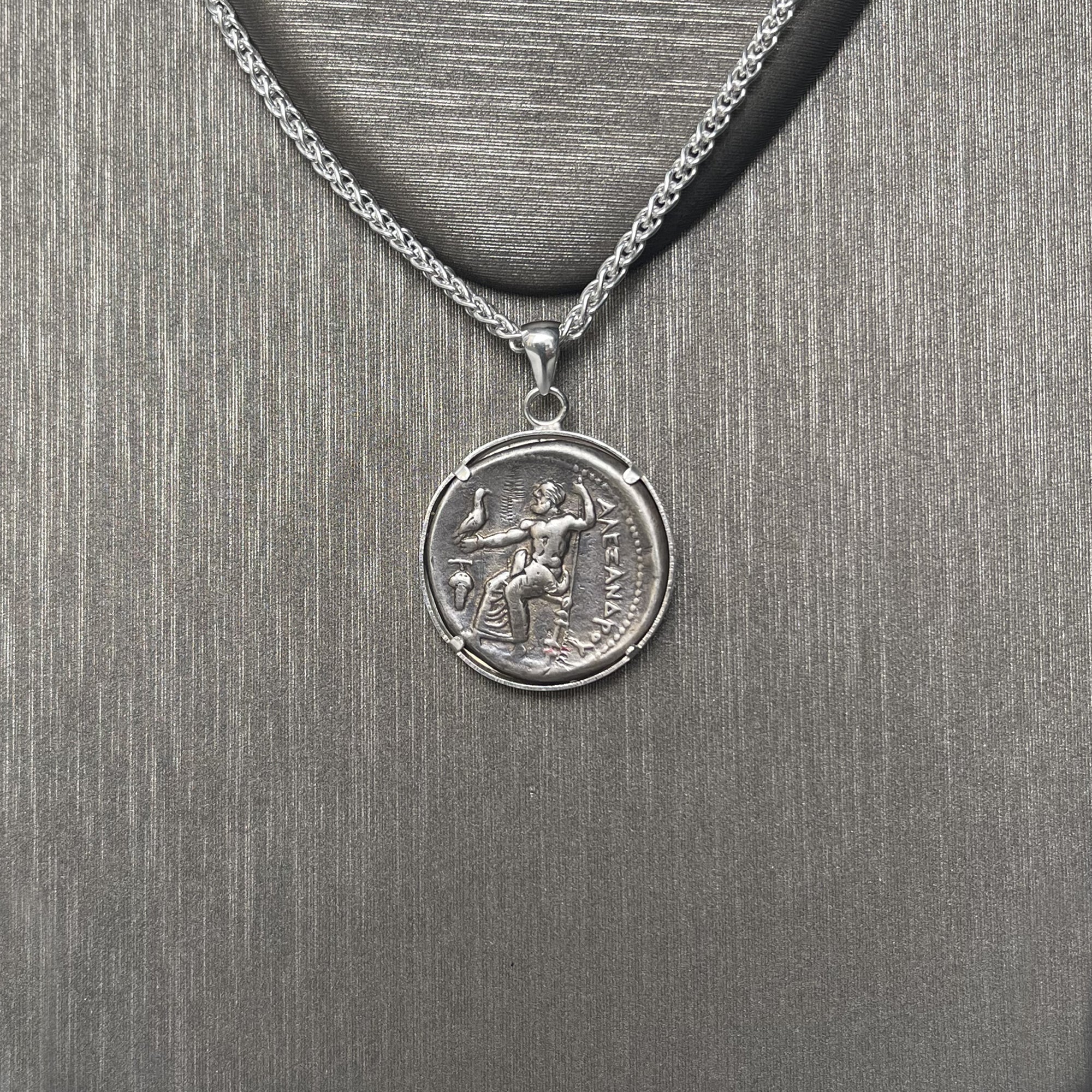 This pendant features a stunning 4th-century BC Greek silver coin minted by Alexander the Great. The coin depicts the legendary hero Heracles (known as Hercules in Roman mythology) wearing lion skin. On the reverse side, we can see Zeus seated on a throne, holding a scepter and accompanied by an eagle.