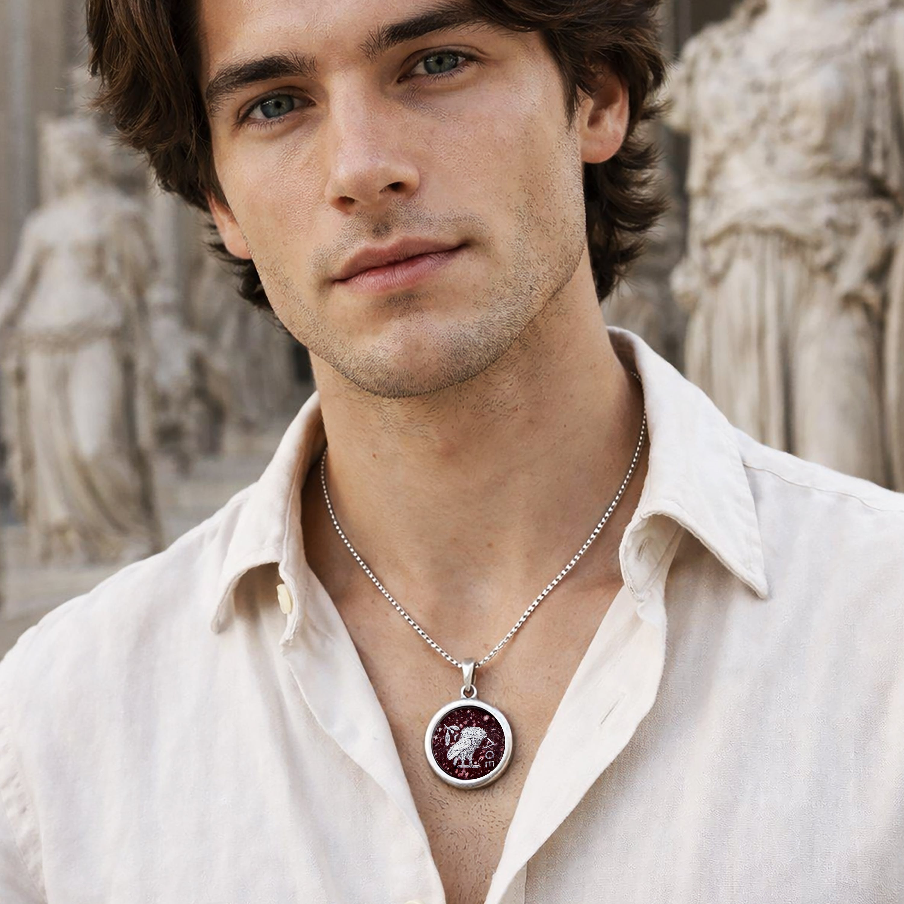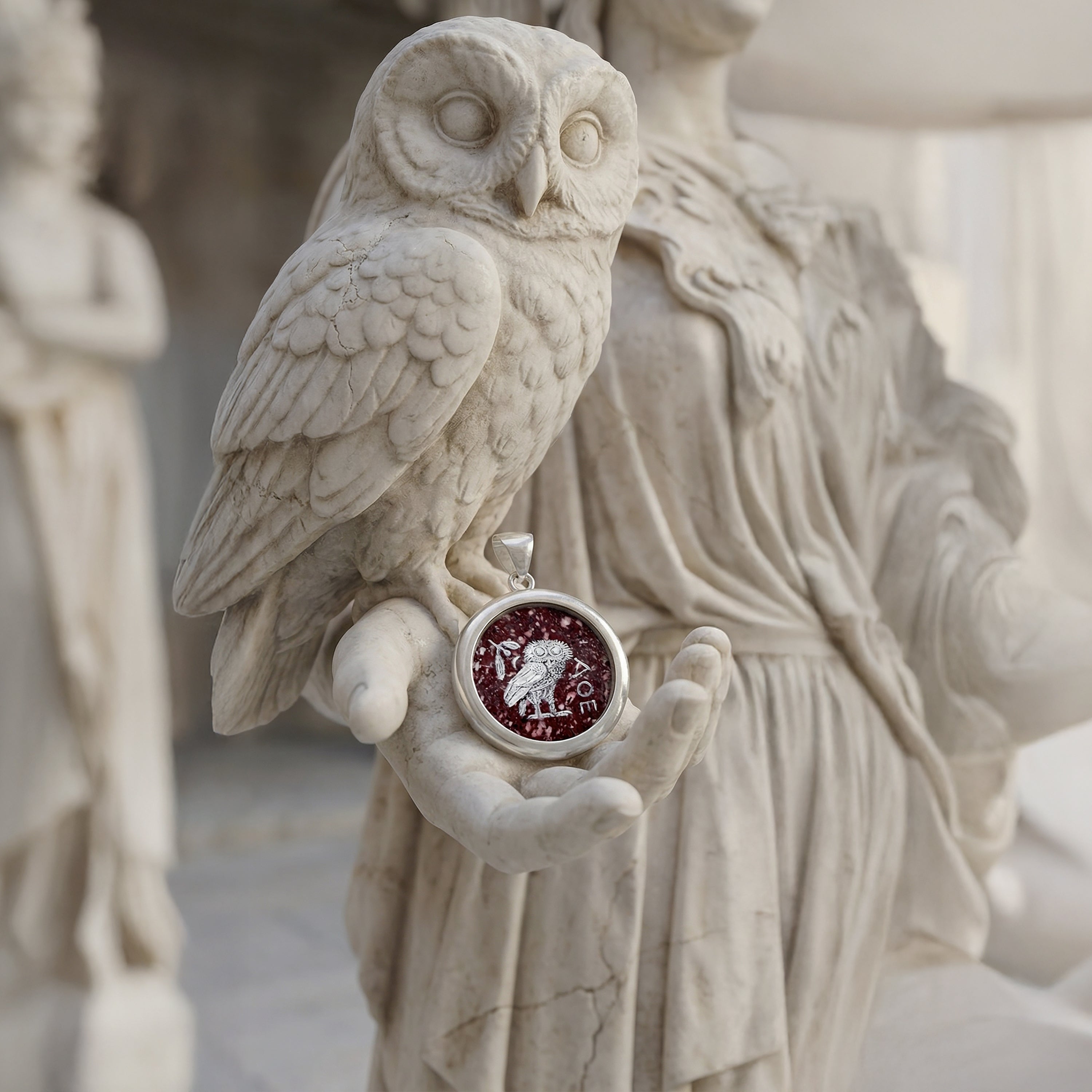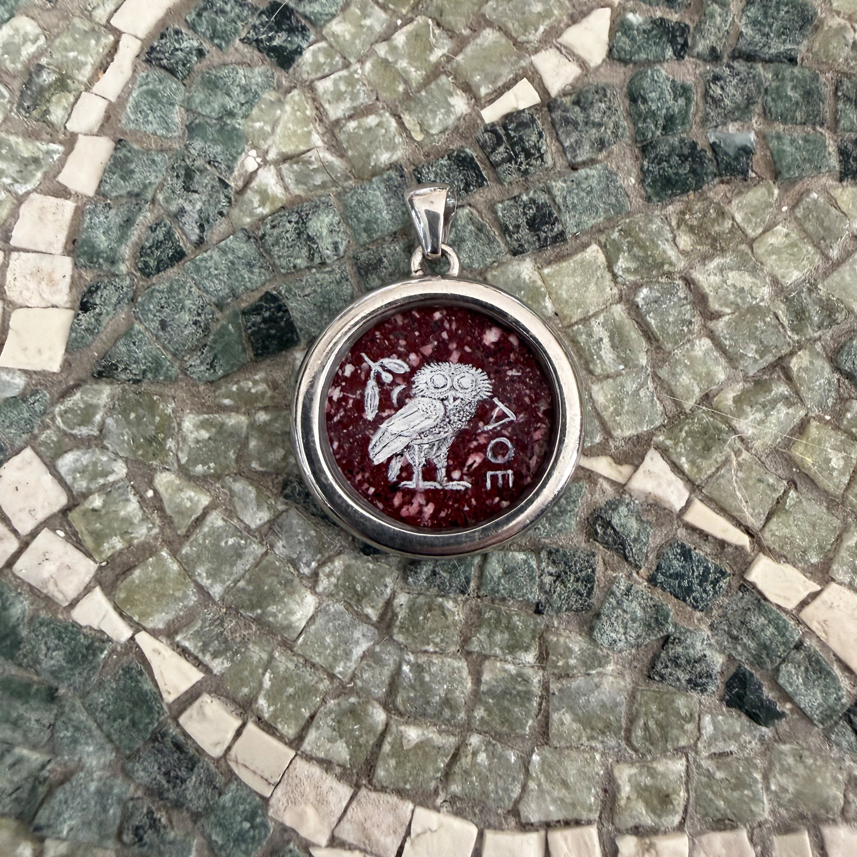 ATHENA'S OWL Hand-Painted Silver Pendant on Roman Red Porphyry