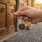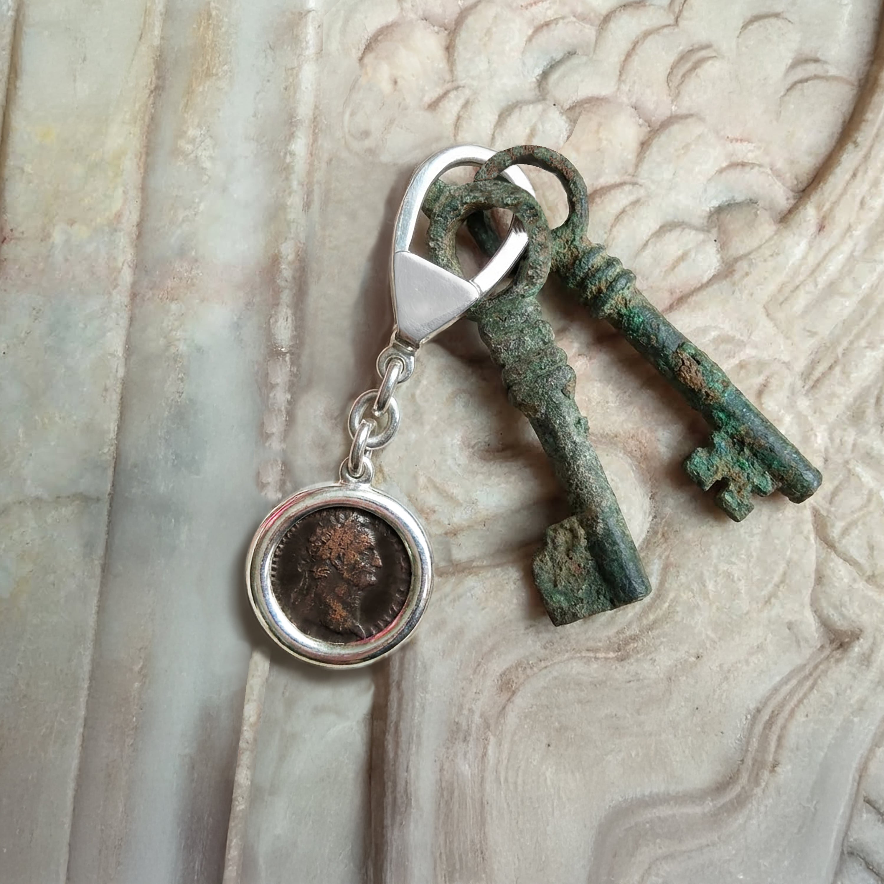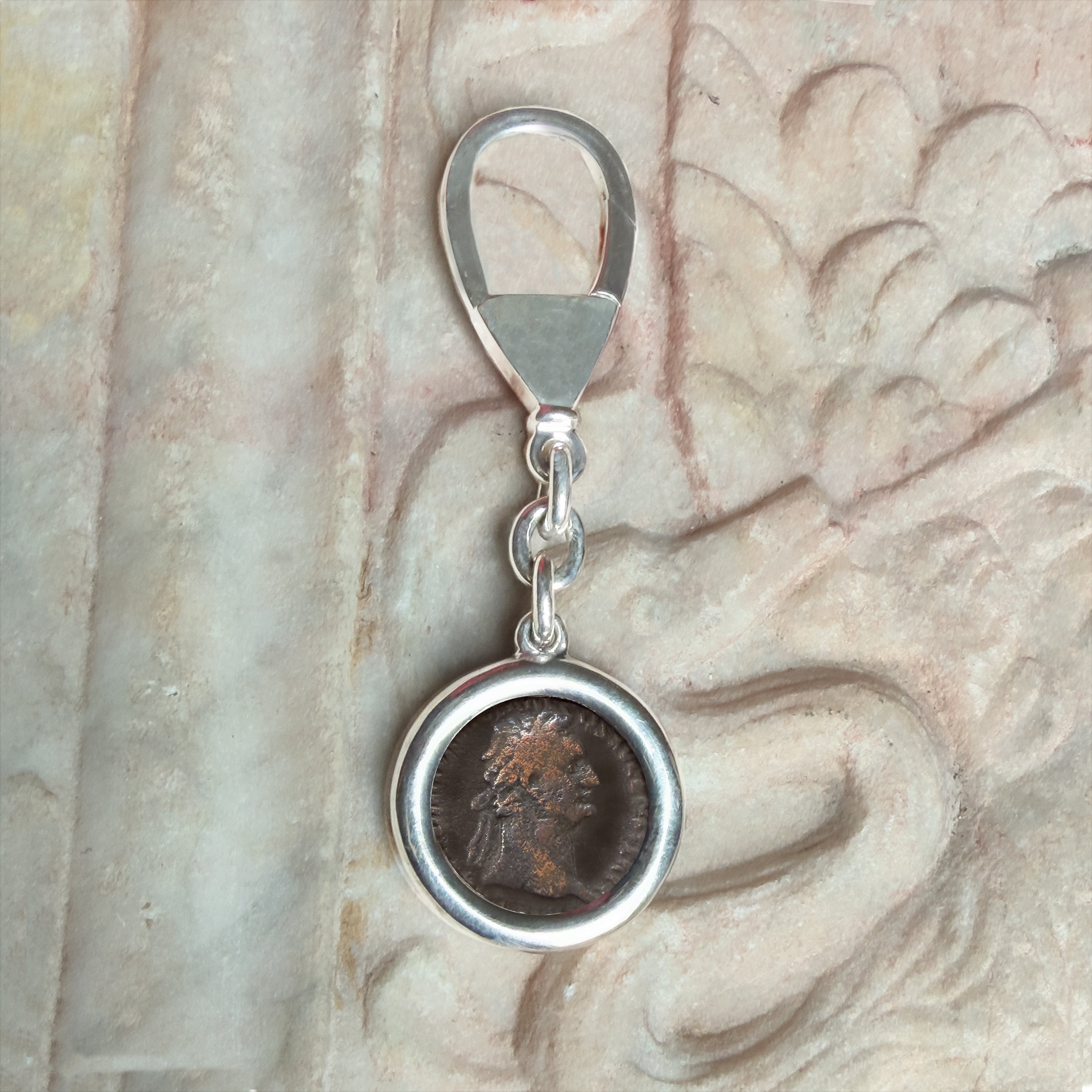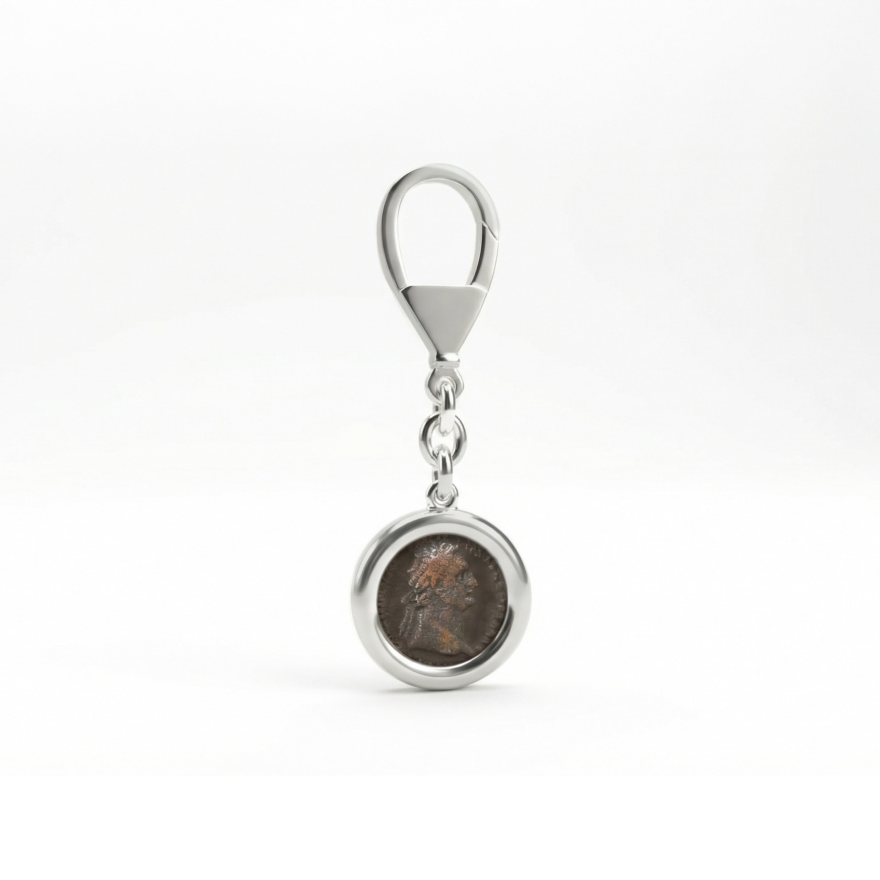 This sterling silver keychain proudly holds an authentic Roman bronze coin from the 1st century AD, featuring the likeness of Emperor Domitian. Adorning the reverse side of the coin is the image of the Goddess Fortuna, the divine personification of fortune and luck in Roman mythology. Fortuna was often depicted holding a cornucopia and a rudder, symbolizing abundance and the power to steer fate.