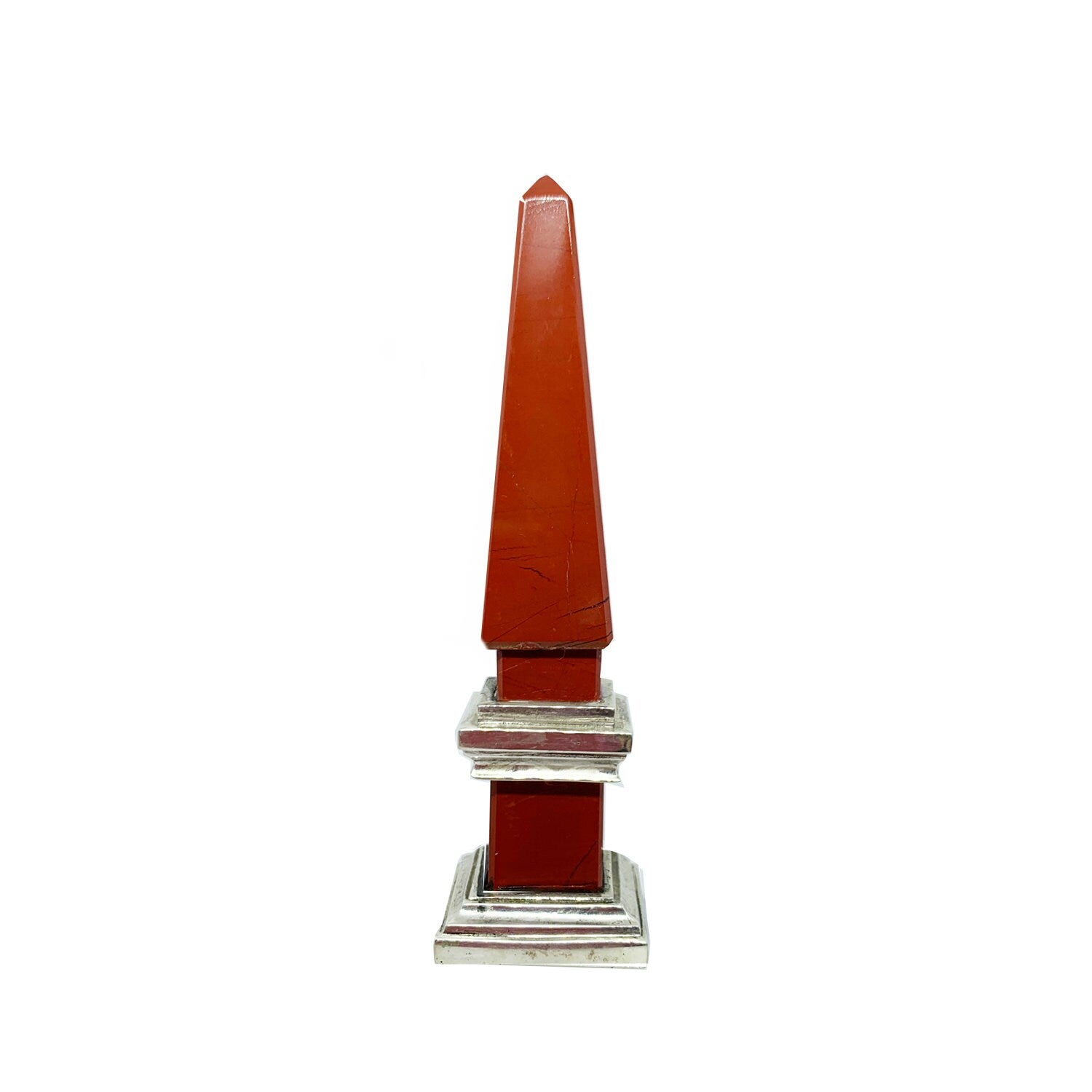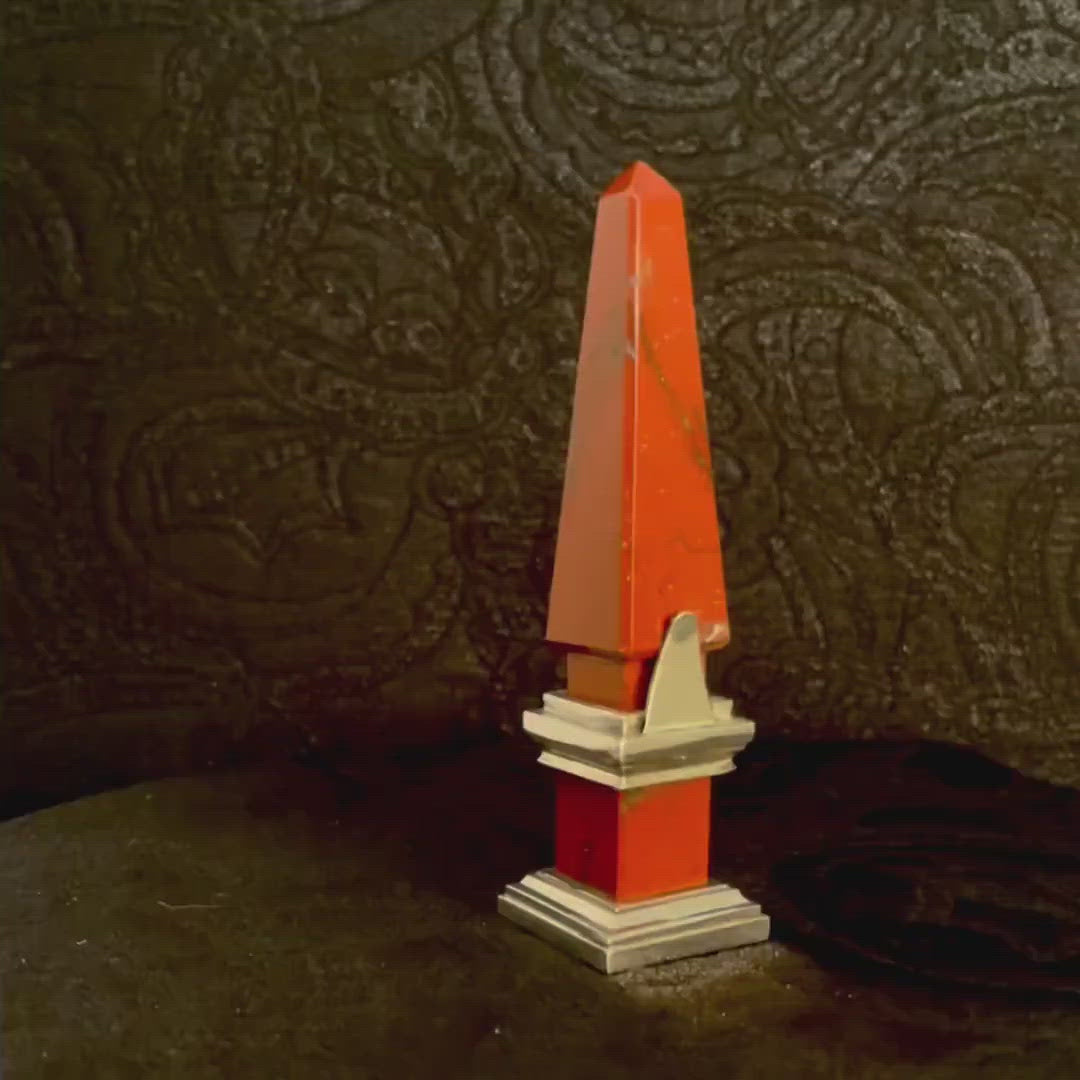 This sterling silver and red porphyry obelisk is one of a group of 12, which can also be purchased individually. They can be placed on the table as a placeholder, after writing the name of the various diners on a card that will be inserted behind the silver triangle