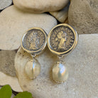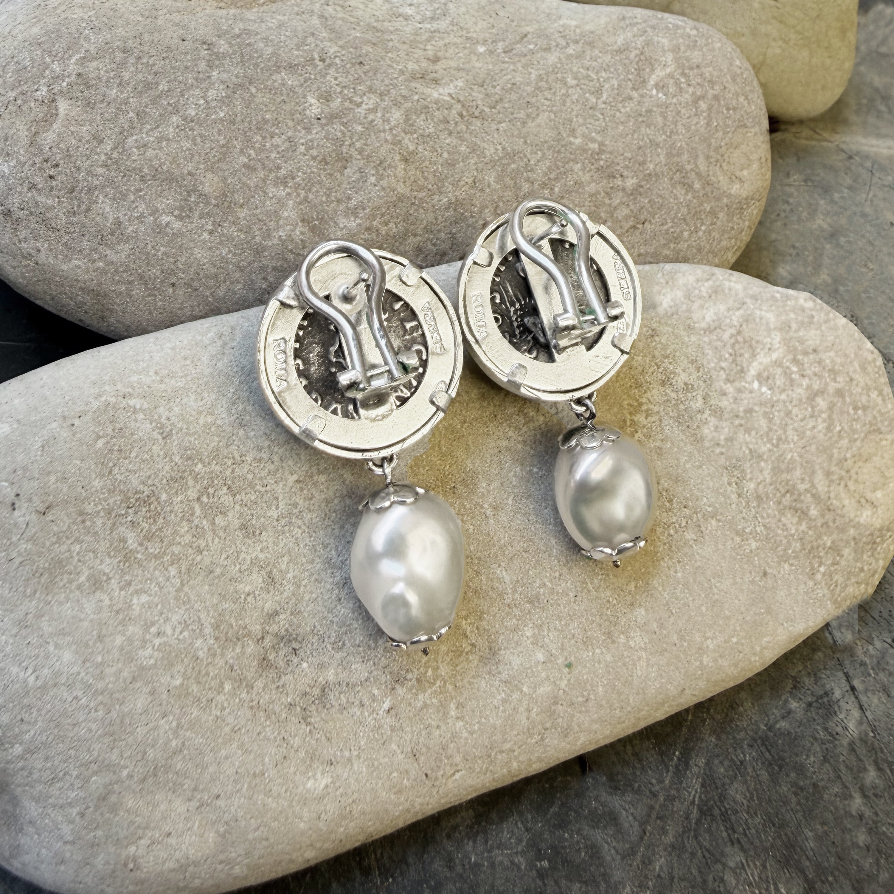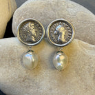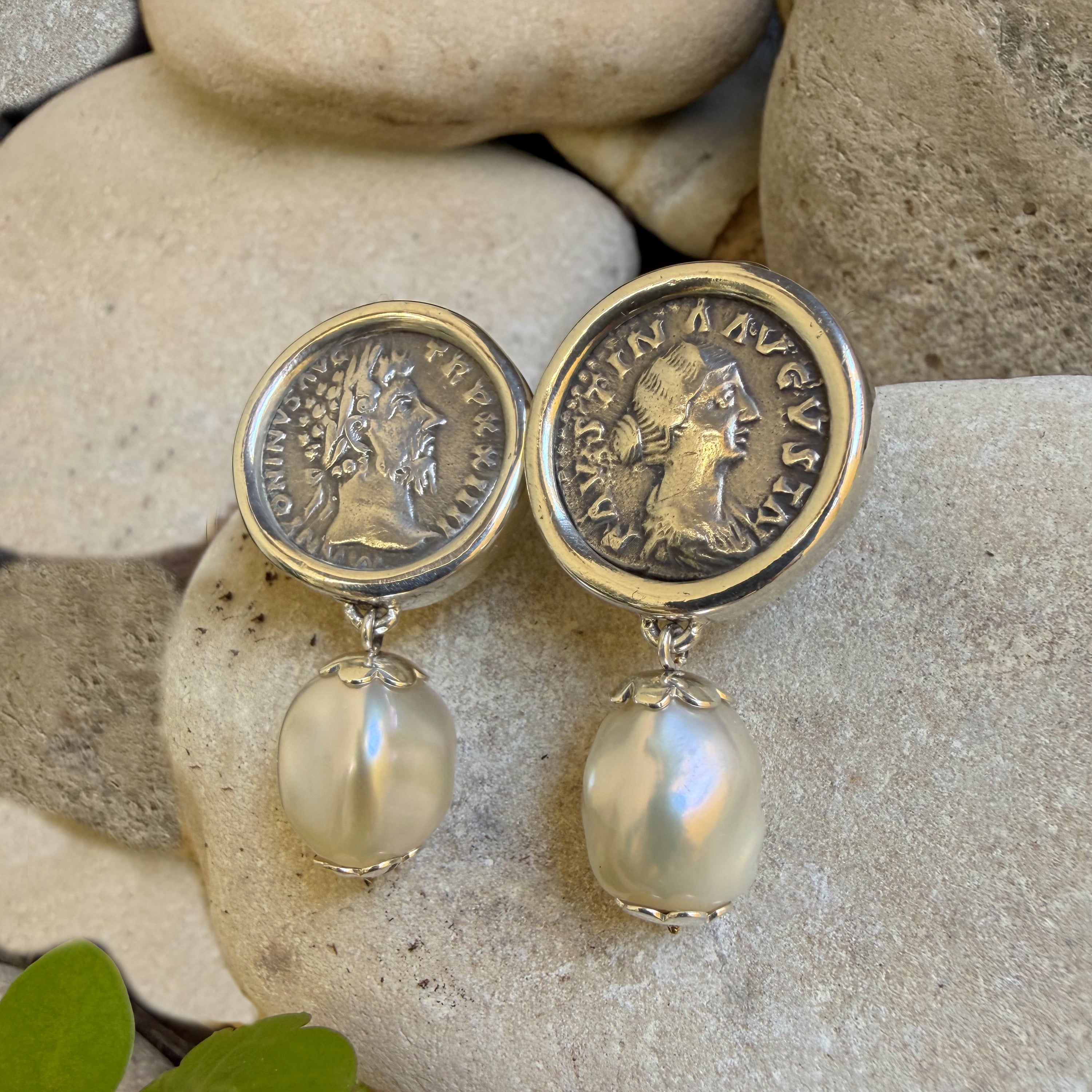 EMPEROR MARCUS AURELIUS AND HIS WIFE FAUSTINA Authentic Roman Coins 925 Silver Earrings with Keshi Pearls