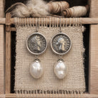 Each earring is crafted in 925 sterling silver and accented with a natural keshi pearl, whose organic form complements the ancient character of the coins.