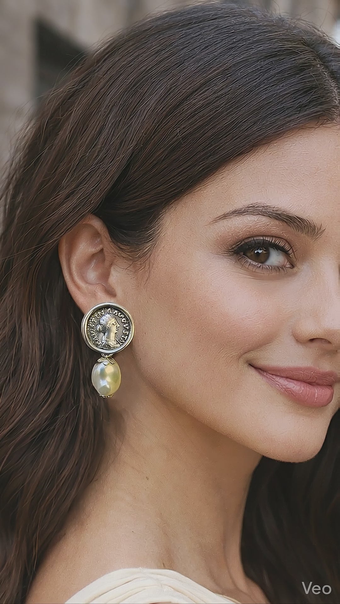 Keshi pearls are unique pearls formed without a nucleus, composed almost entirely of nacre. Known for their irregular shapes and exceptional luster, they develop naturally when an oyster rejects the implanted nucleus but continues producing nacre. Because of their organic beauty and rarity, keshi pearls are highly prized in contemporary jewelry design, adding a soft, luminous contrast to the historic Roman silver coins.