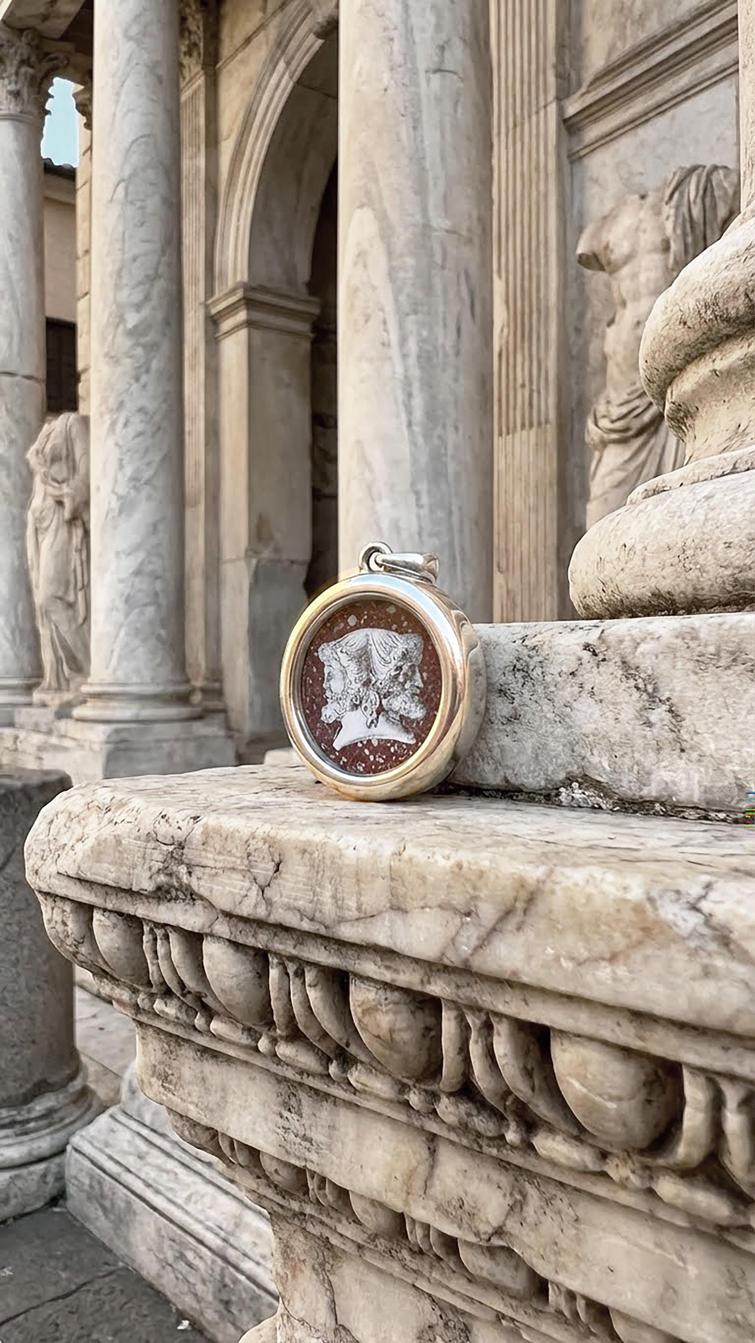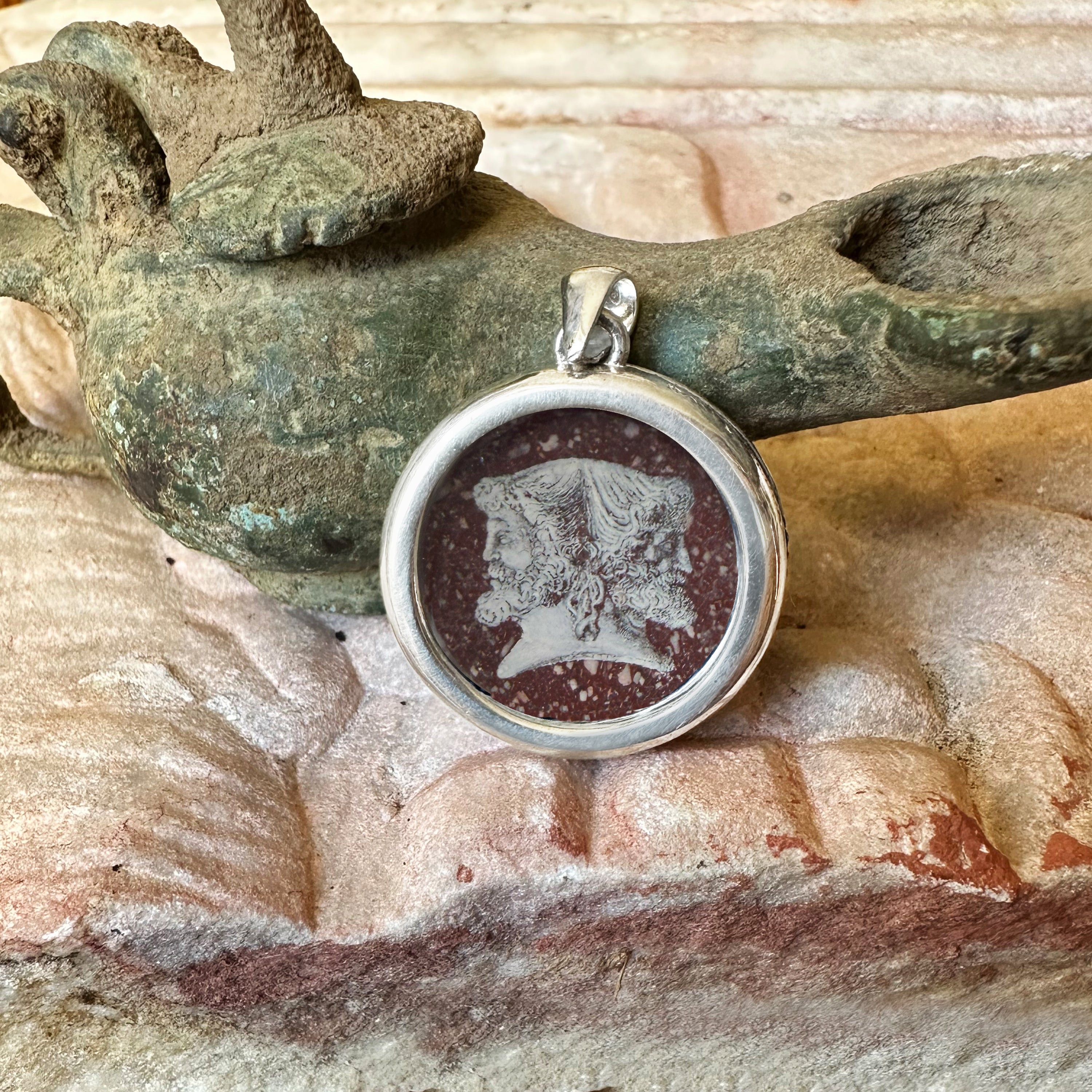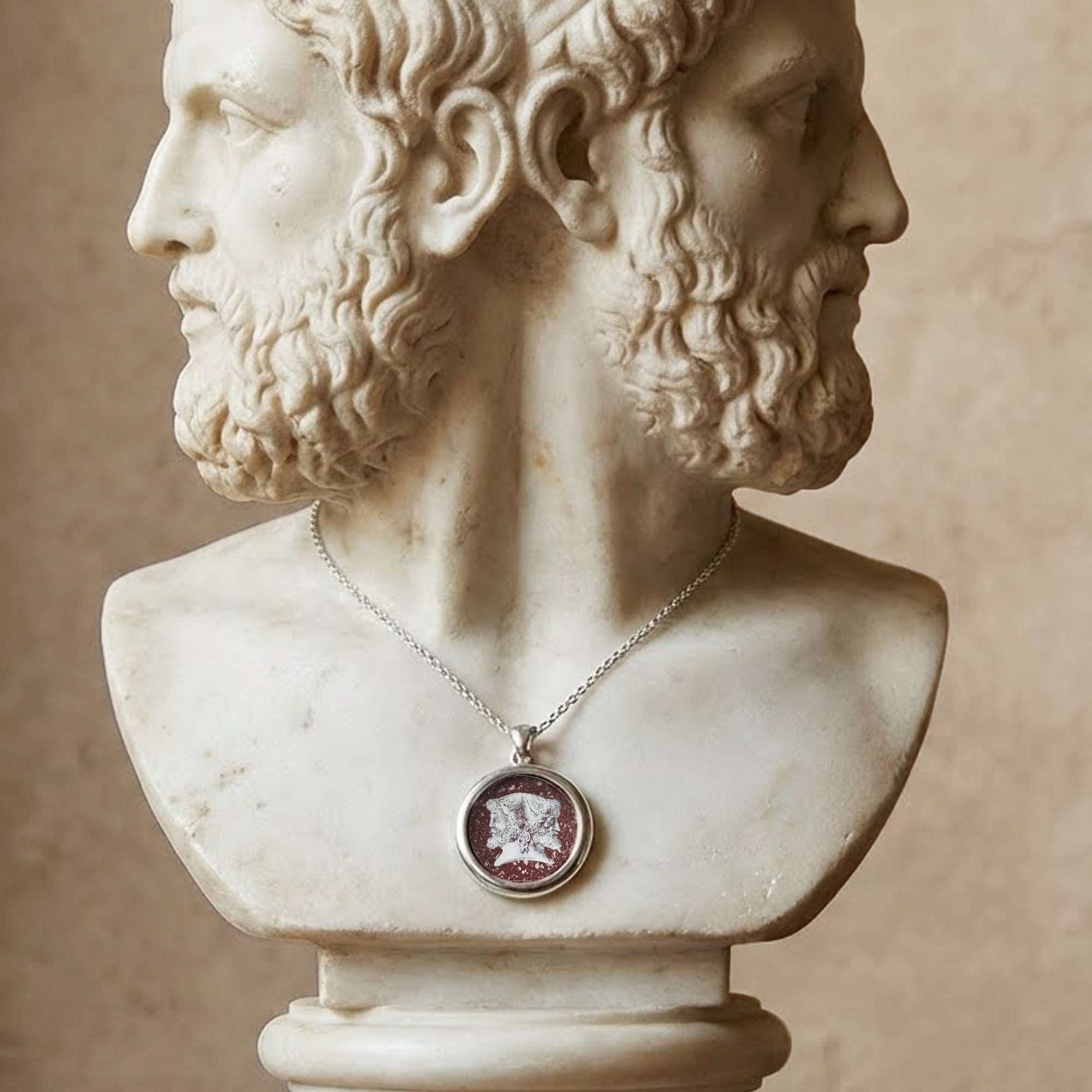 GOD JANUS Hand-Painted Silver Pendant on Red Porphyry