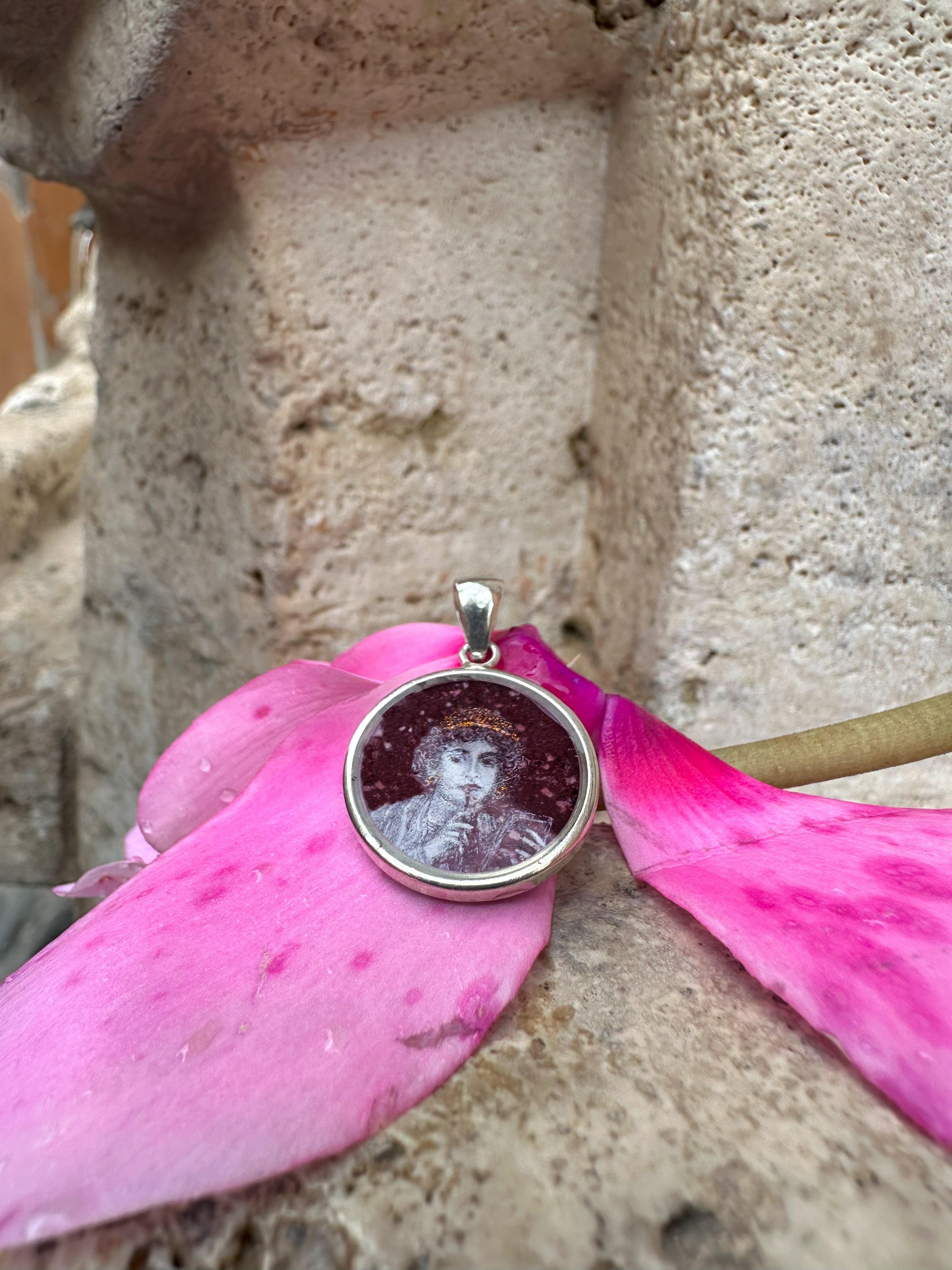 SAPPHO Hand-Painted Silver Pendant on Red Porphyry