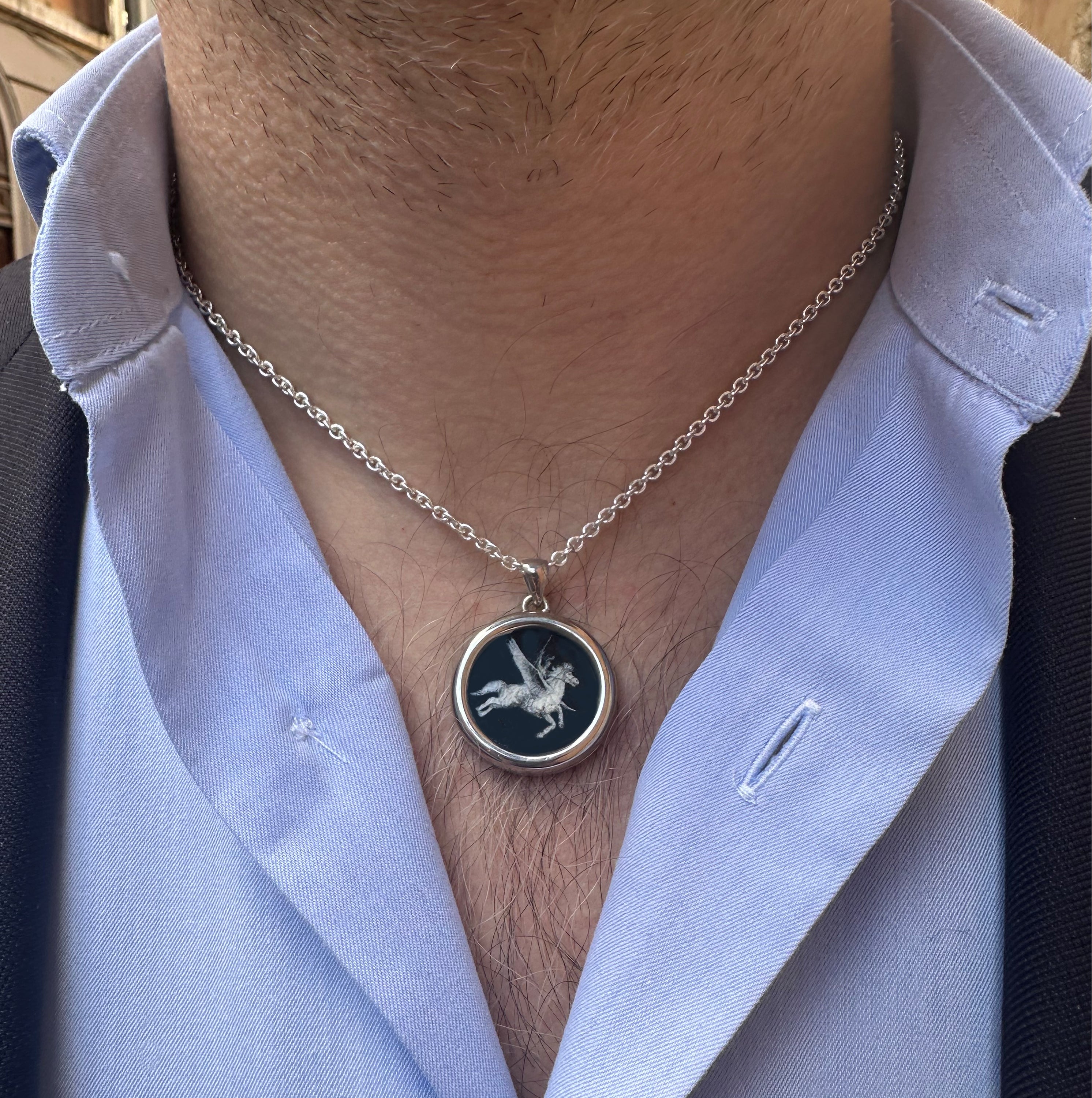 PEGASUS Hand-Painted Silver Pendant on Onyx