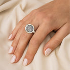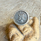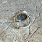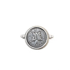 This sterling silver ring showcases an authentic Roman coin from the 2nd century B.C., featuring the two-faced God Janus. On the reverse side of the coin is an image of Rome standing tall, erecting a trophy. The ring is rotatable, allowing the coin to turn and display either side — a unique feature that highlights both faces of this ancient artifact.