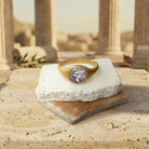 An authentic Greek coin (obol, 420–390 B.C.) is set in this elegant 18 kt gold ring. The obverse depicts Aphrodite—Venus to the Romans—who in Greek religion was the goddess of beauty, love, sexuality, fertility, prosperity, and victory. On the reverse appears the bearded head of Dionysus.