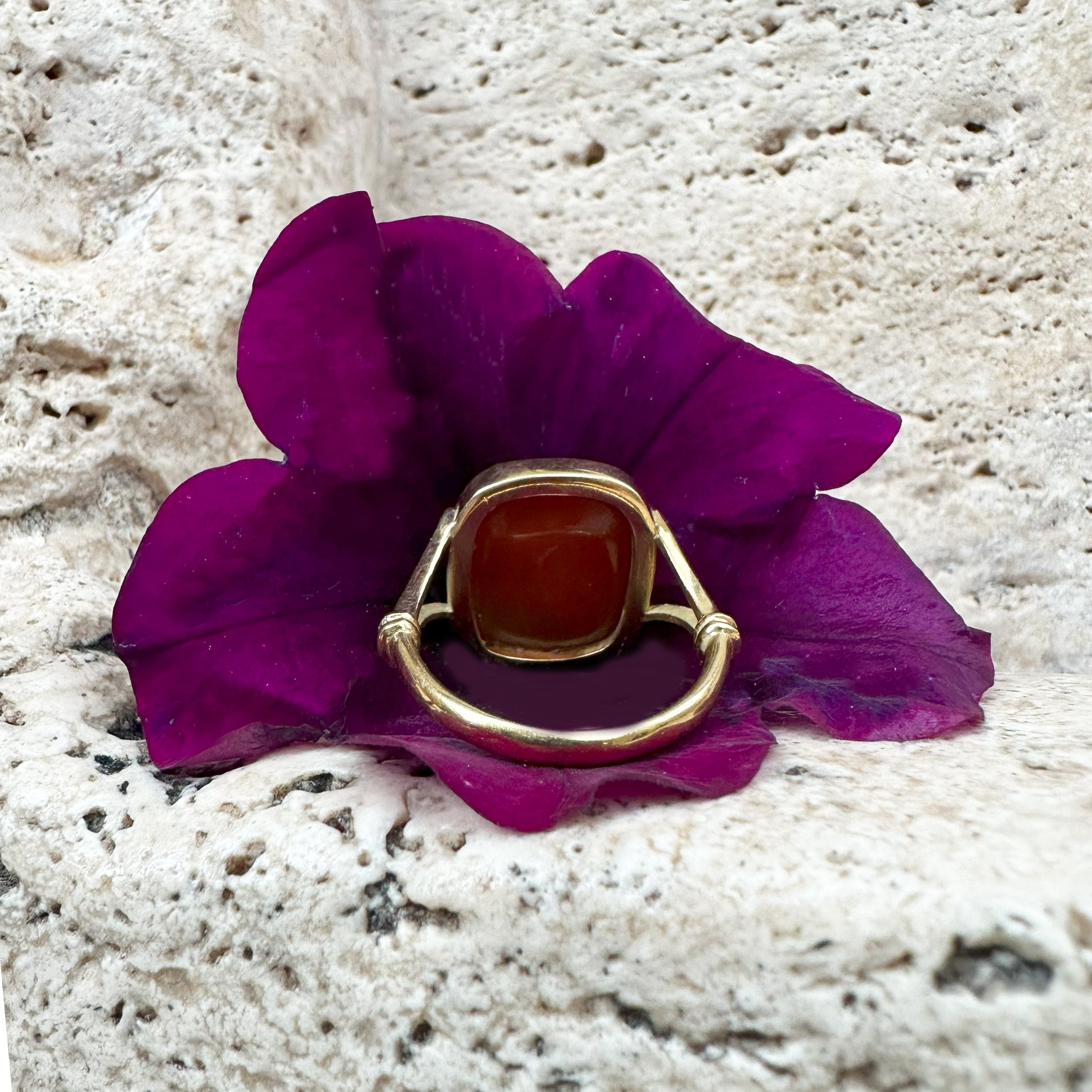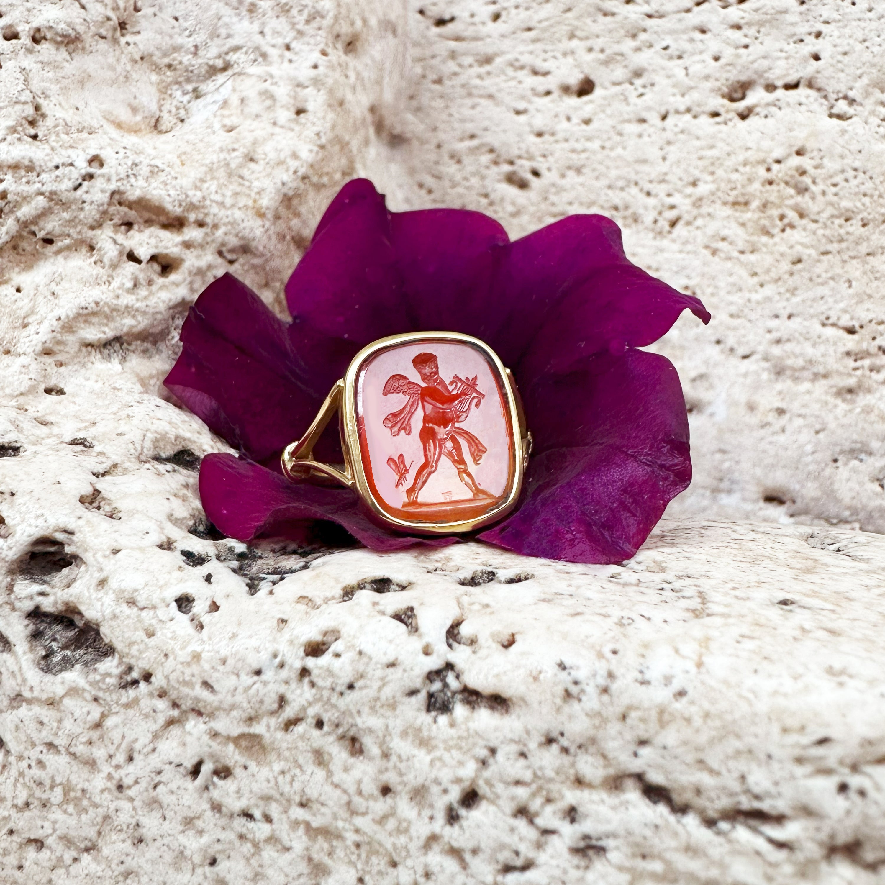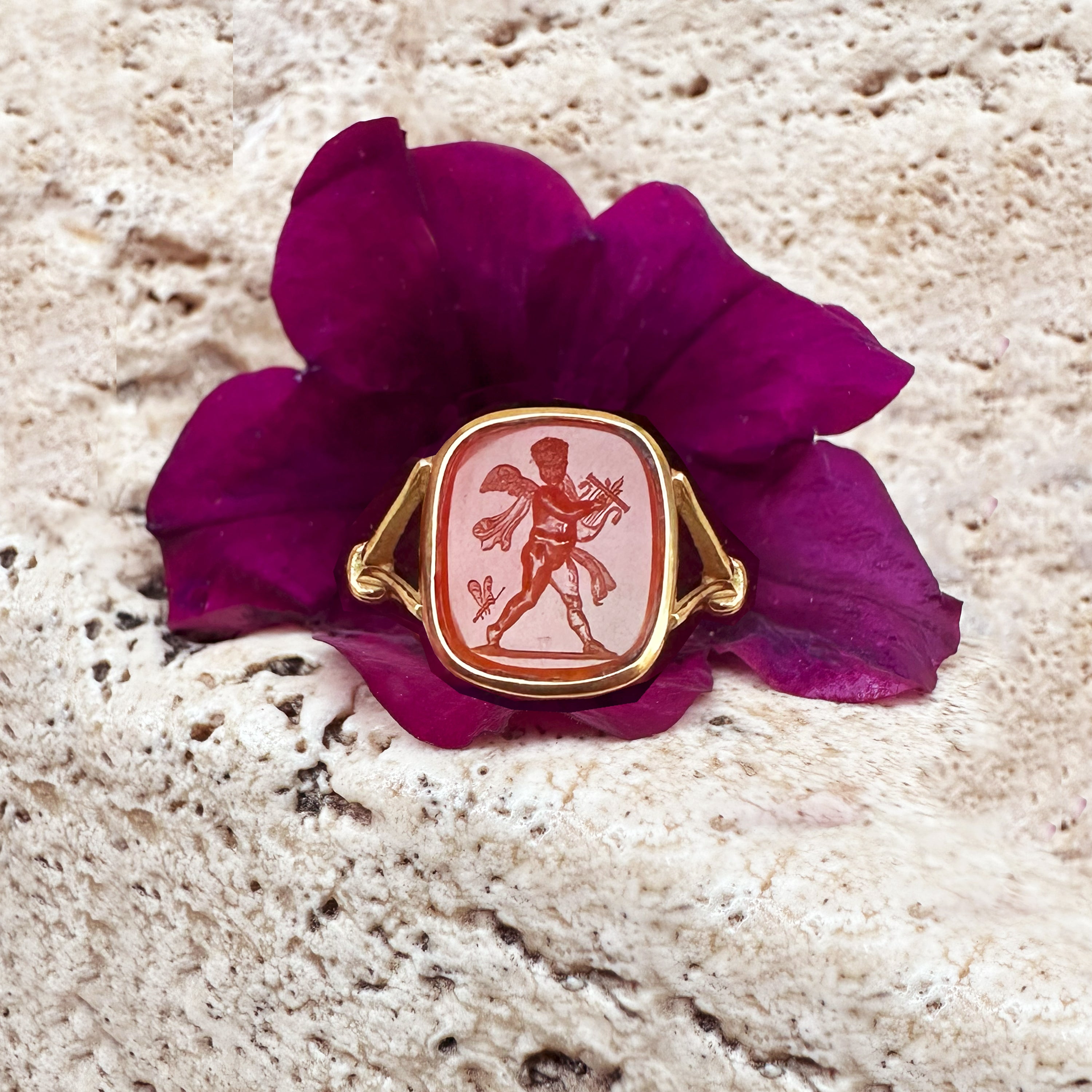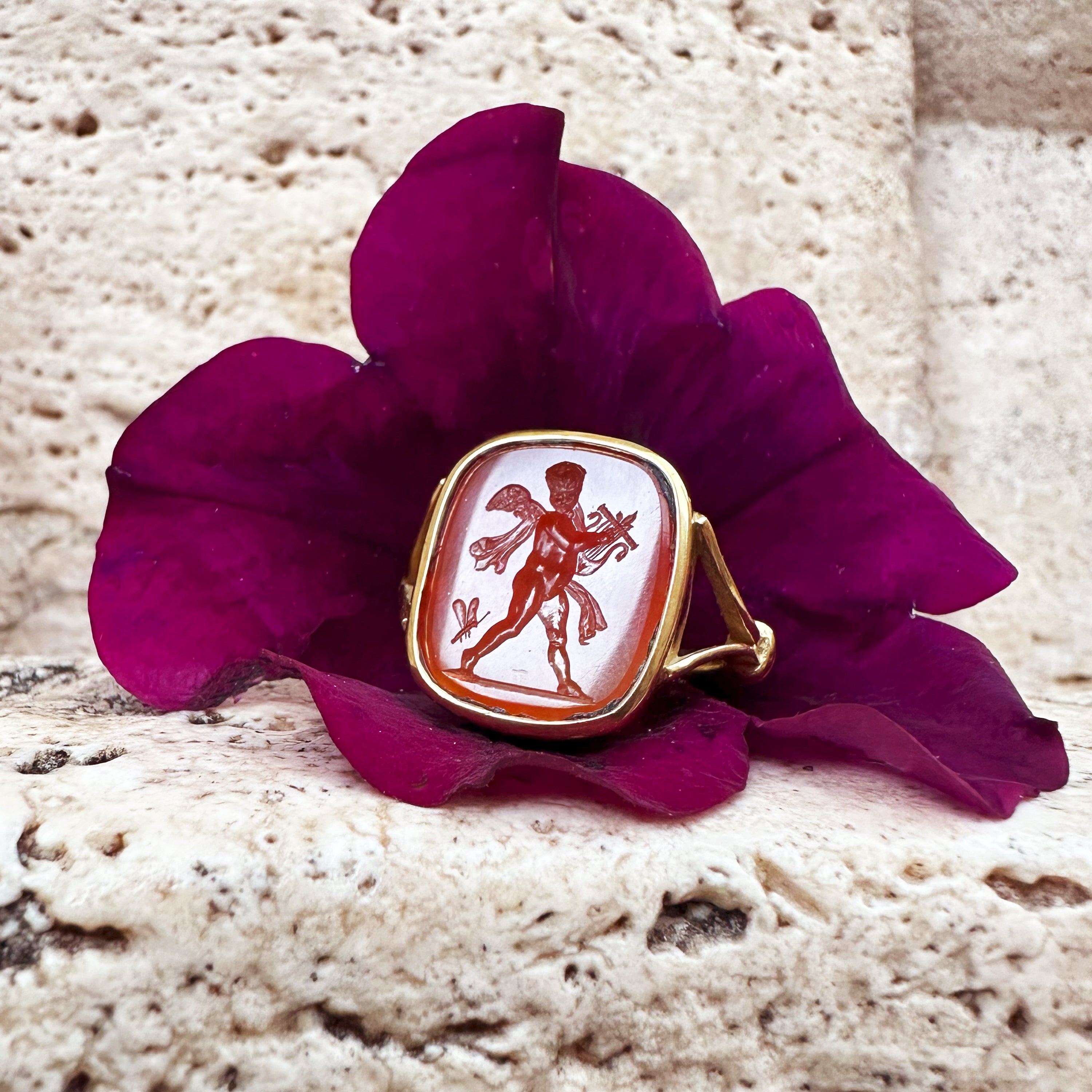 This exquisite 18kt Gold Ring showcases an authentic carnelian intaglio from the Victorian Age, engraved with a rare and deeply symbolic scene: Cupid playing music with a butterfly.