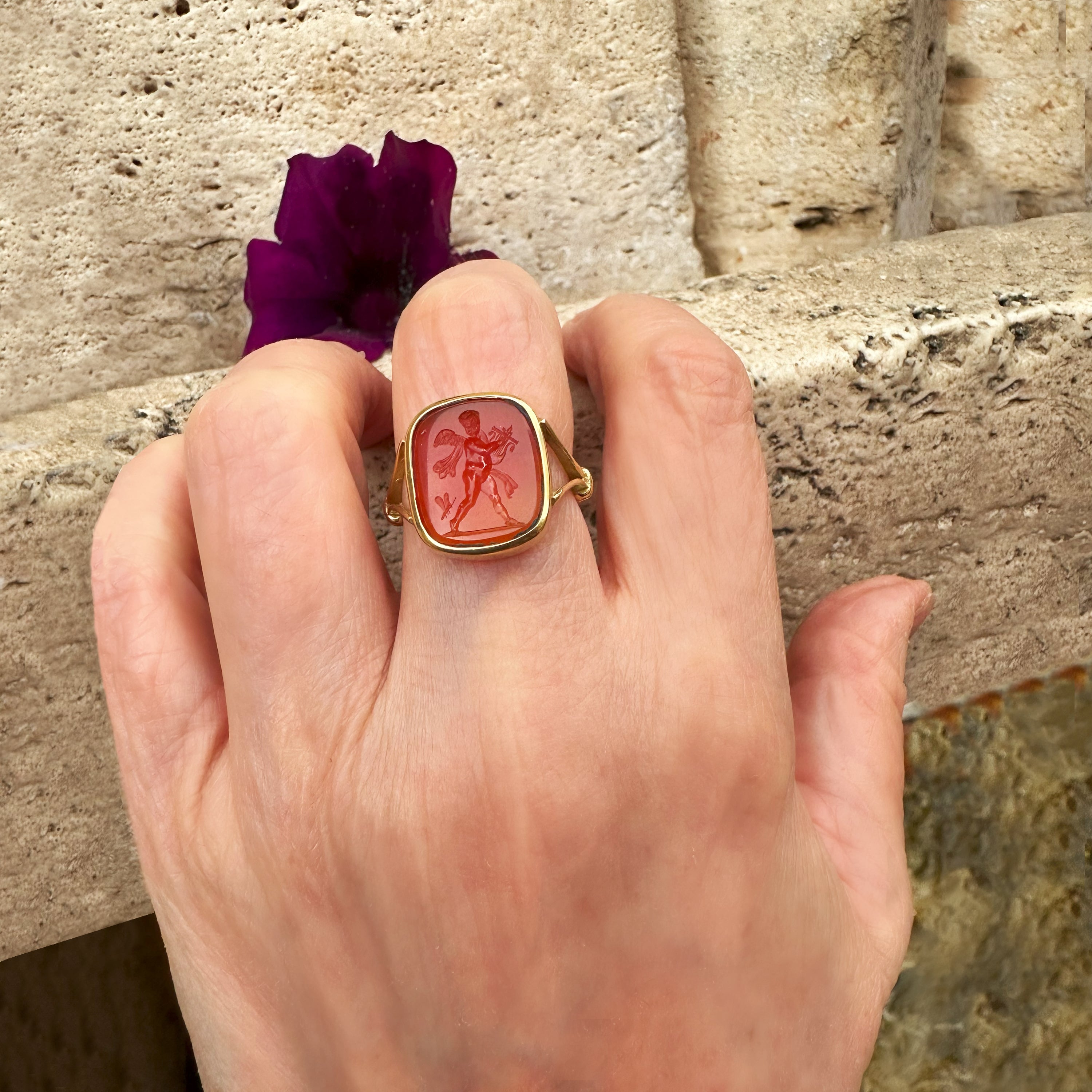 CUPID WITH BUTTERFLY Genuine Carnelian intaglio Victorian Age 18 Kt Gold Ring