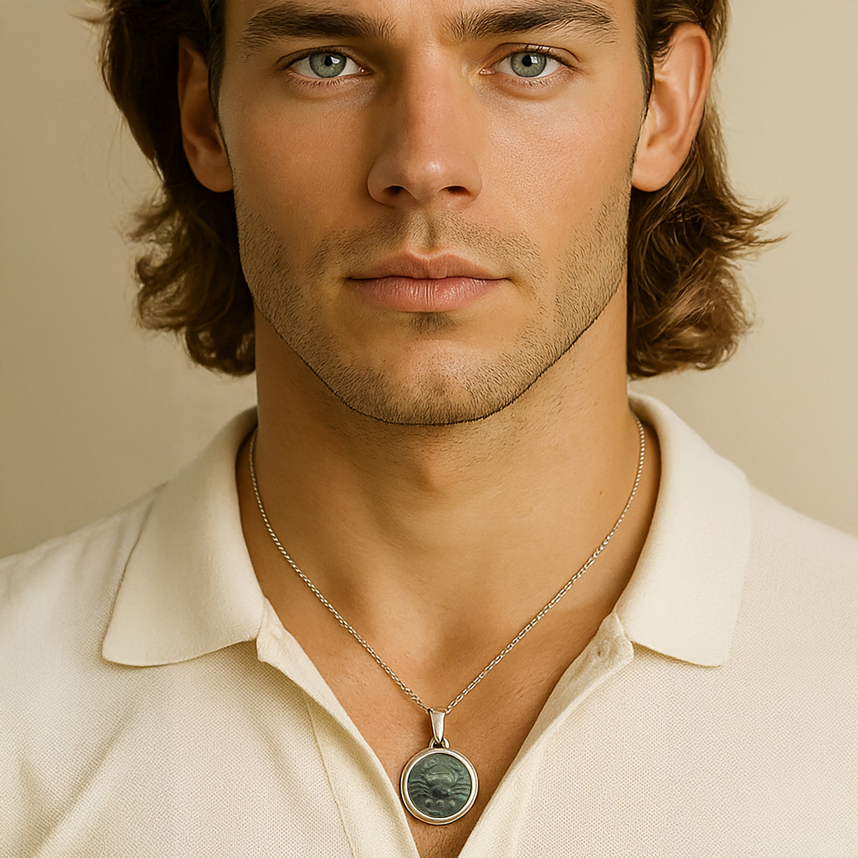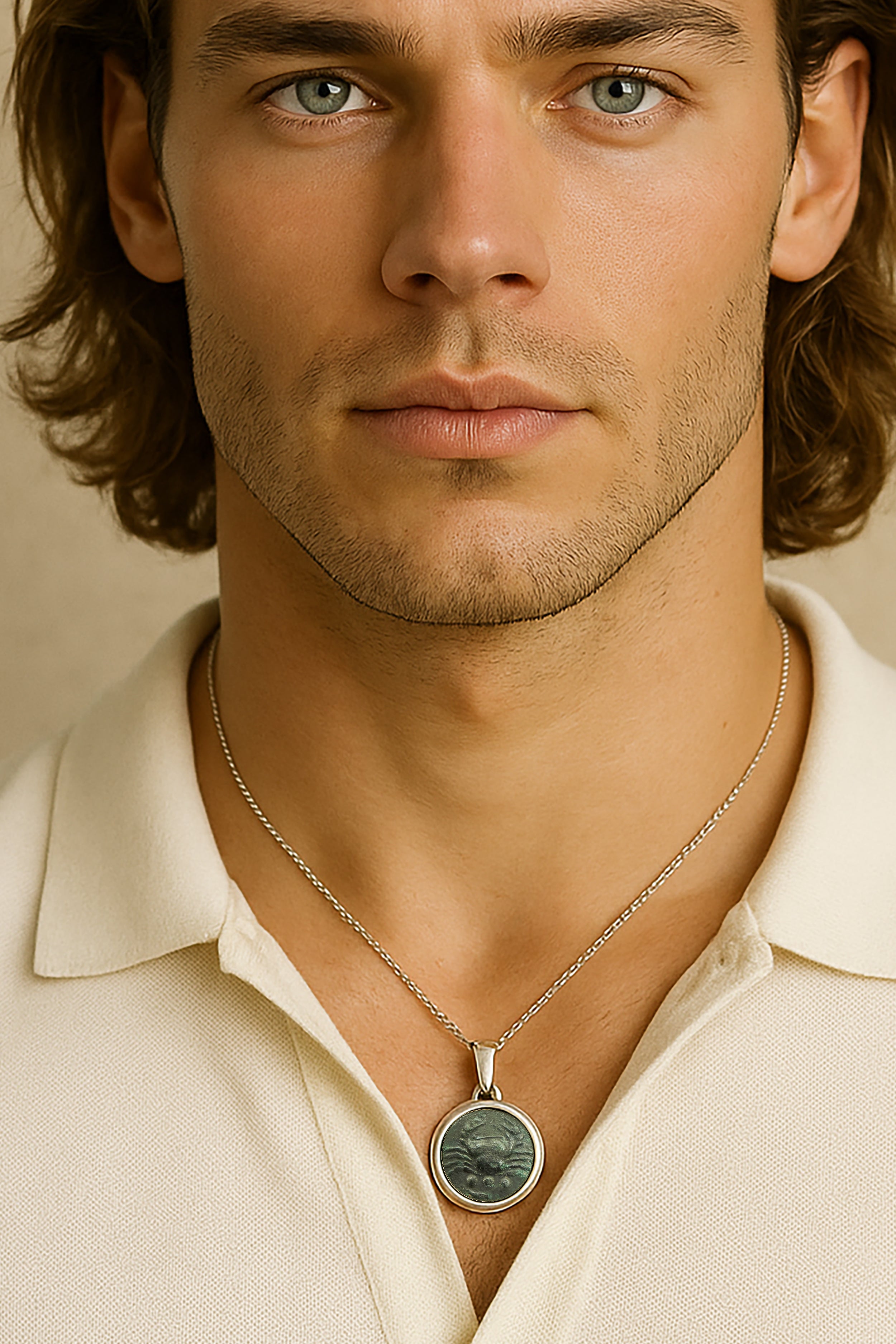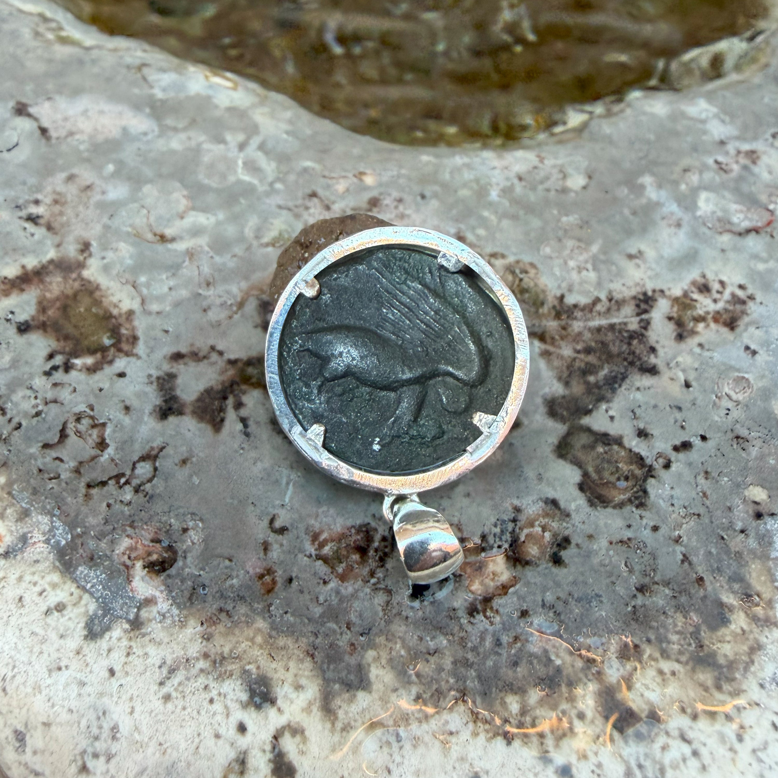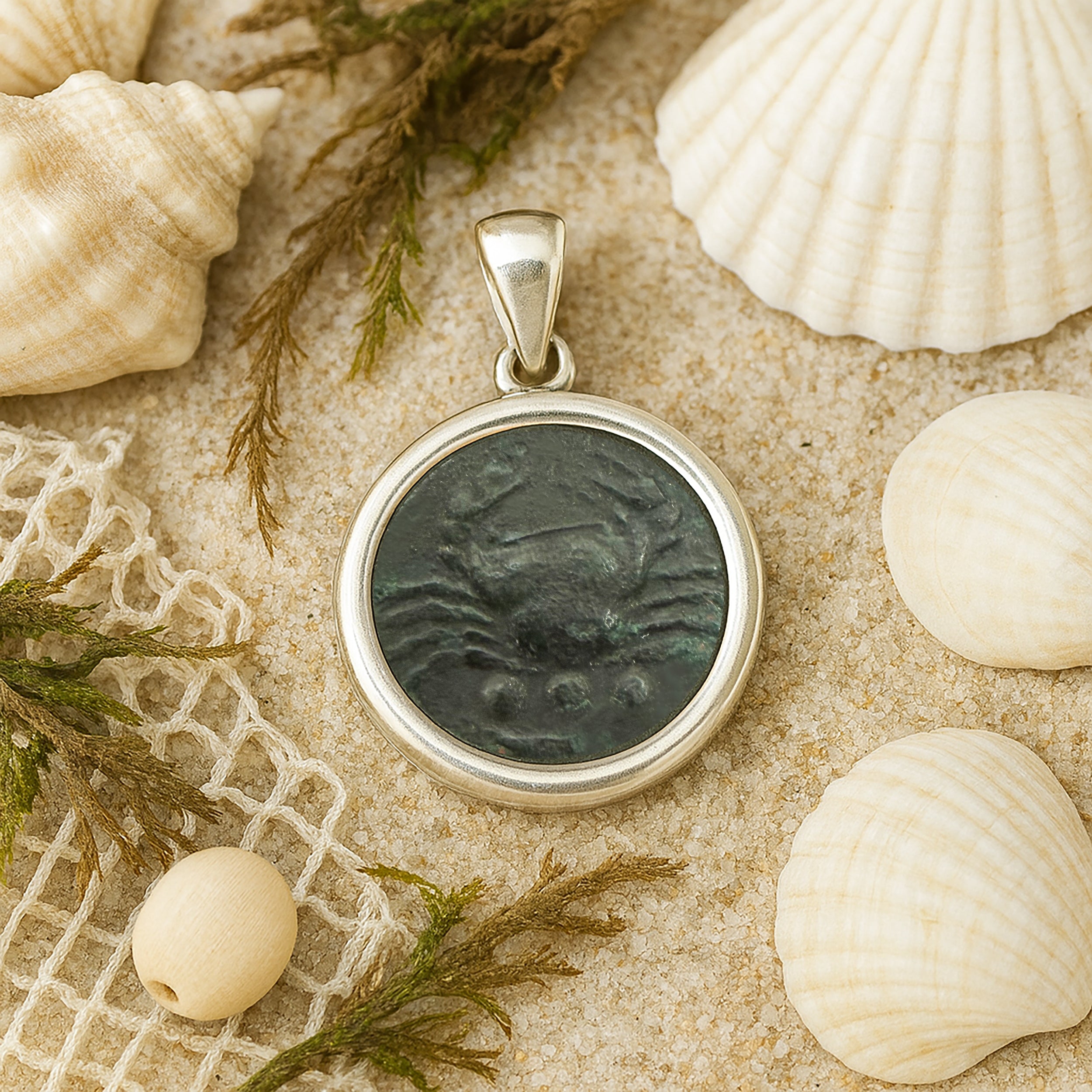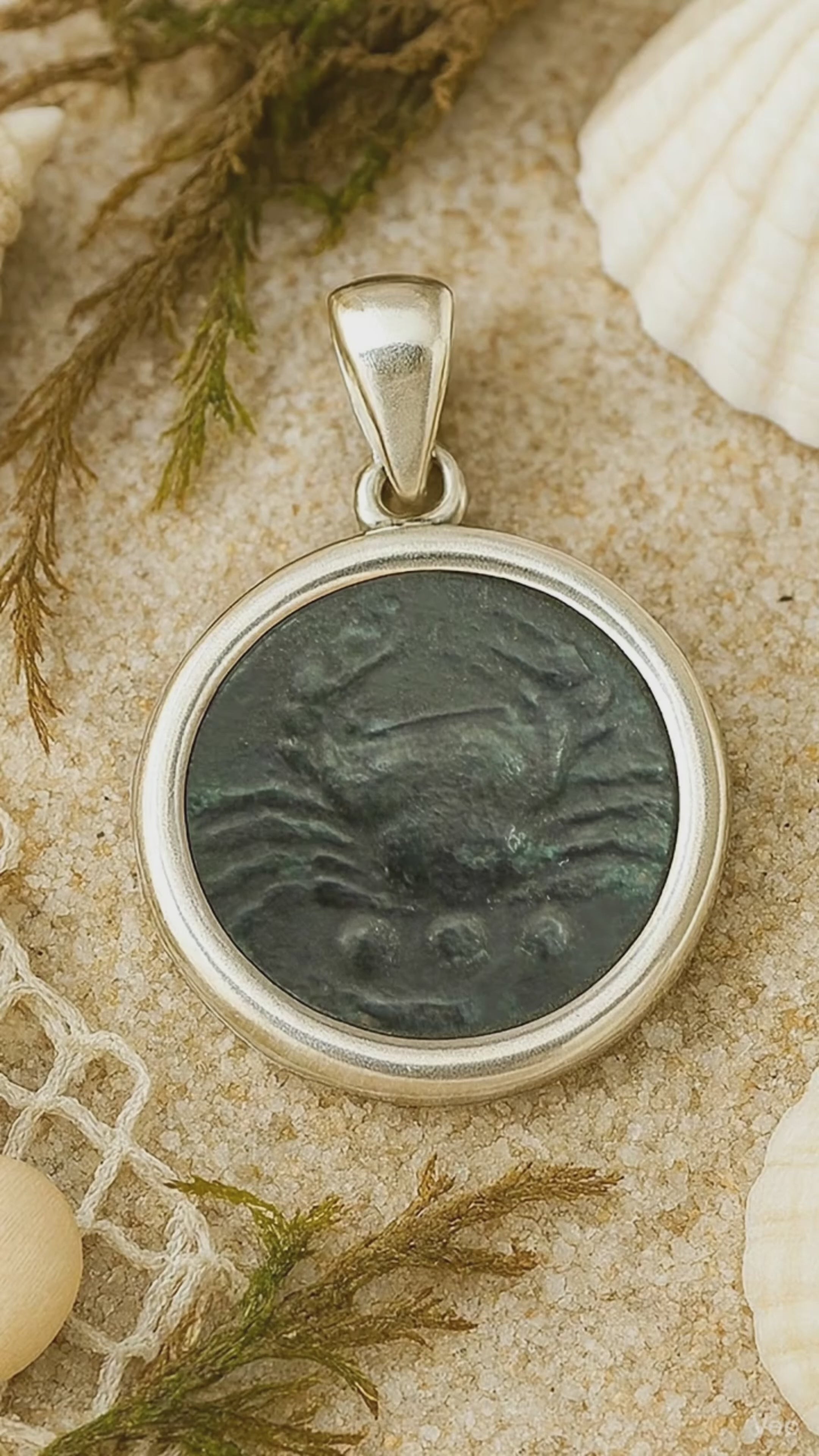 This bronze coin, dating to the 5th century BC and originating from Magna Graecia, Sicily, has been mounted as a pendant. The coin features a striking crab on one side, while the reverse depicts a sea eagle, a powerful maritime symbol.