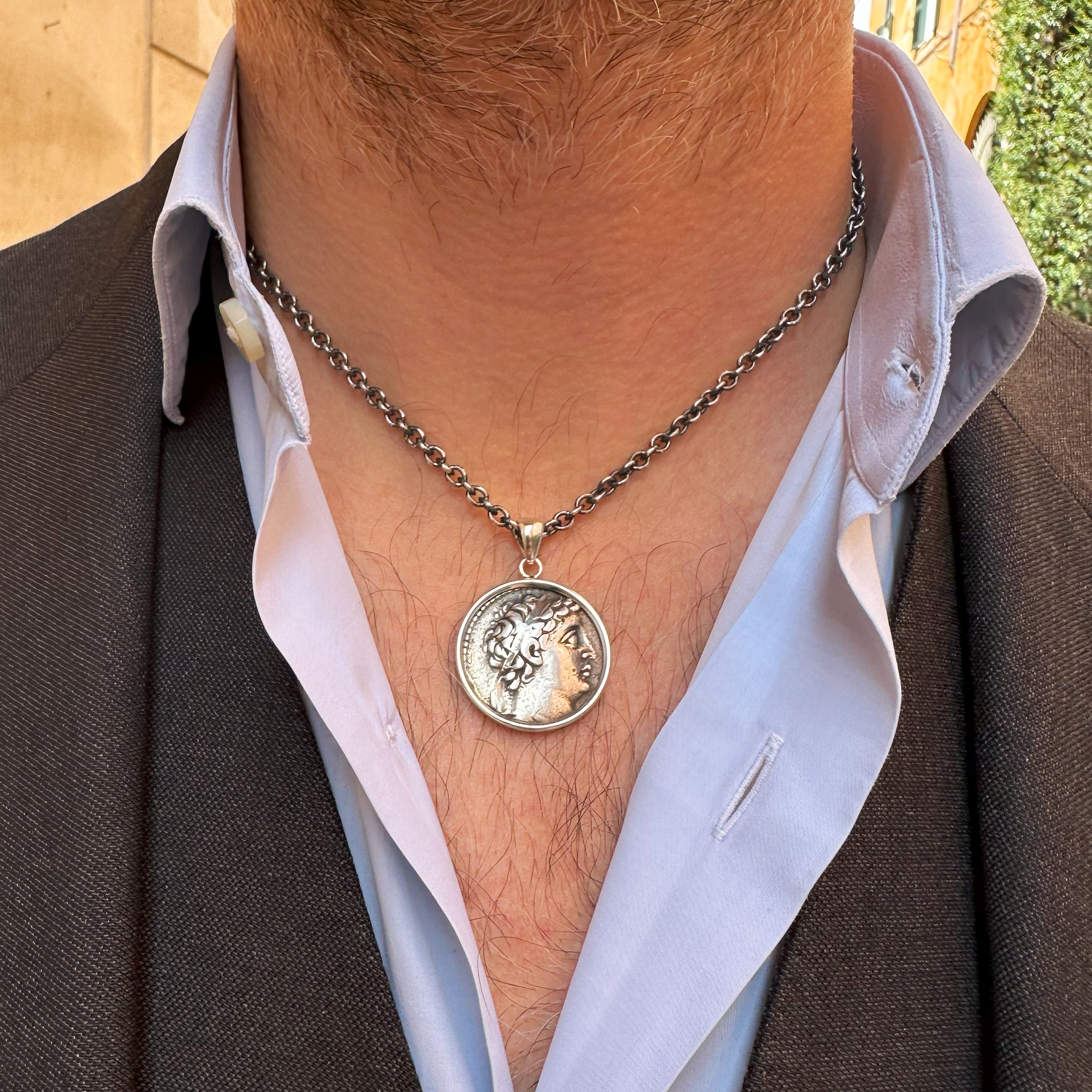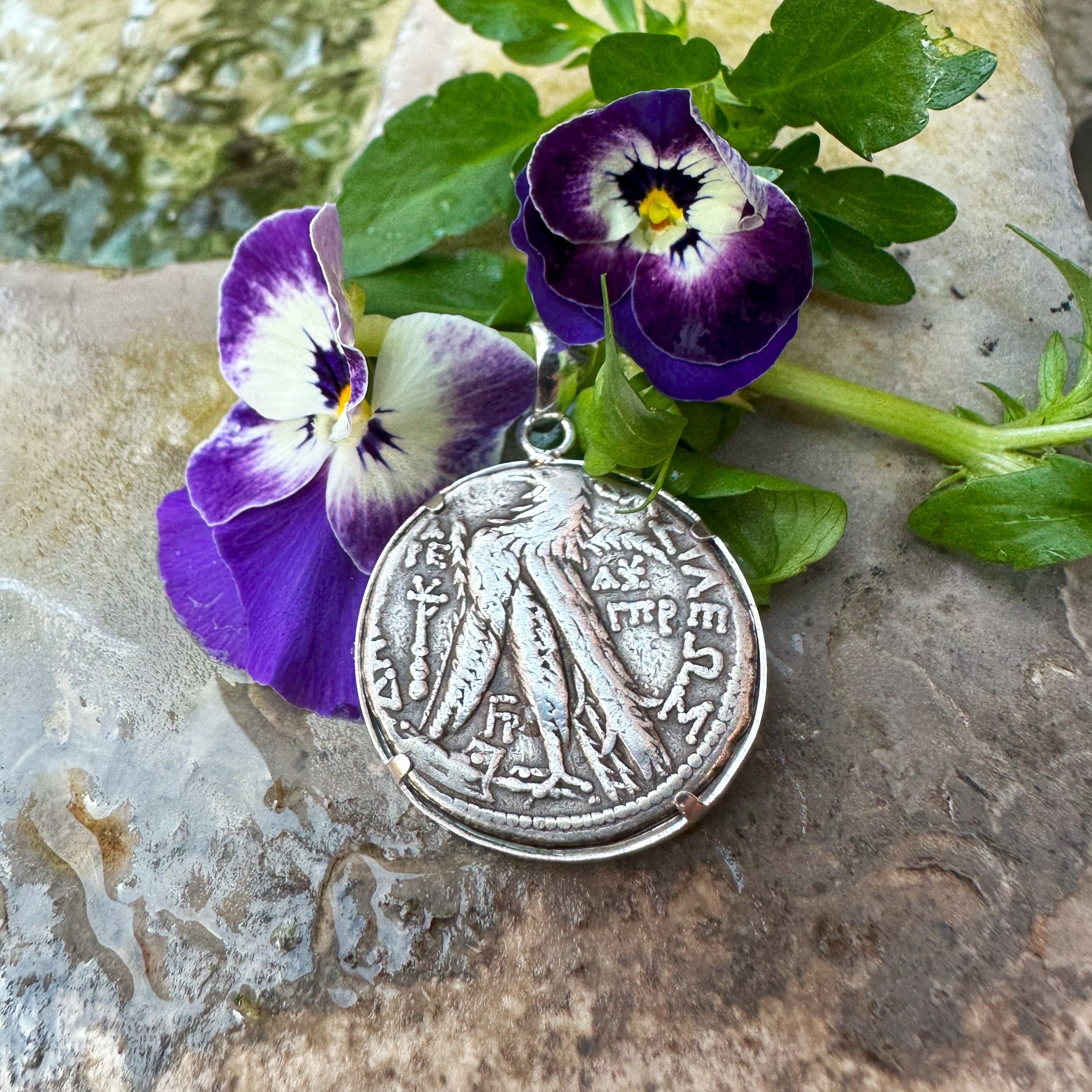 This stunning sterling silver pendant features a genuine greek coin from 145-125 BC, showcasing Demetrios II. The obverse side depicts the noble portrait of Demetrius II, a Hellenistic ruler known for his leadership in the Seleucid Empire. On the reverse, an eagle stands majestically on the beak of a galley, with a palm branch in the background, symbolizing victory and strength.