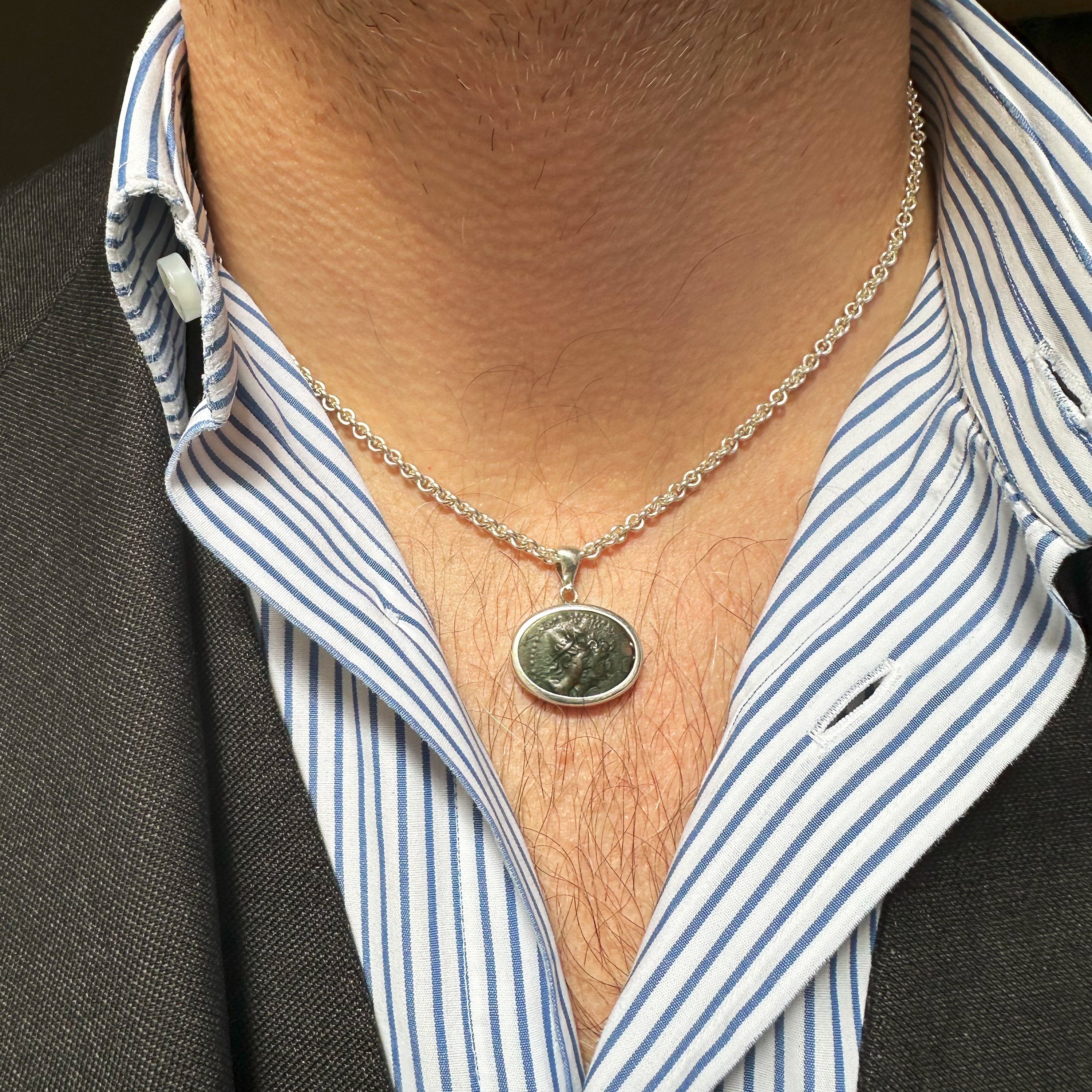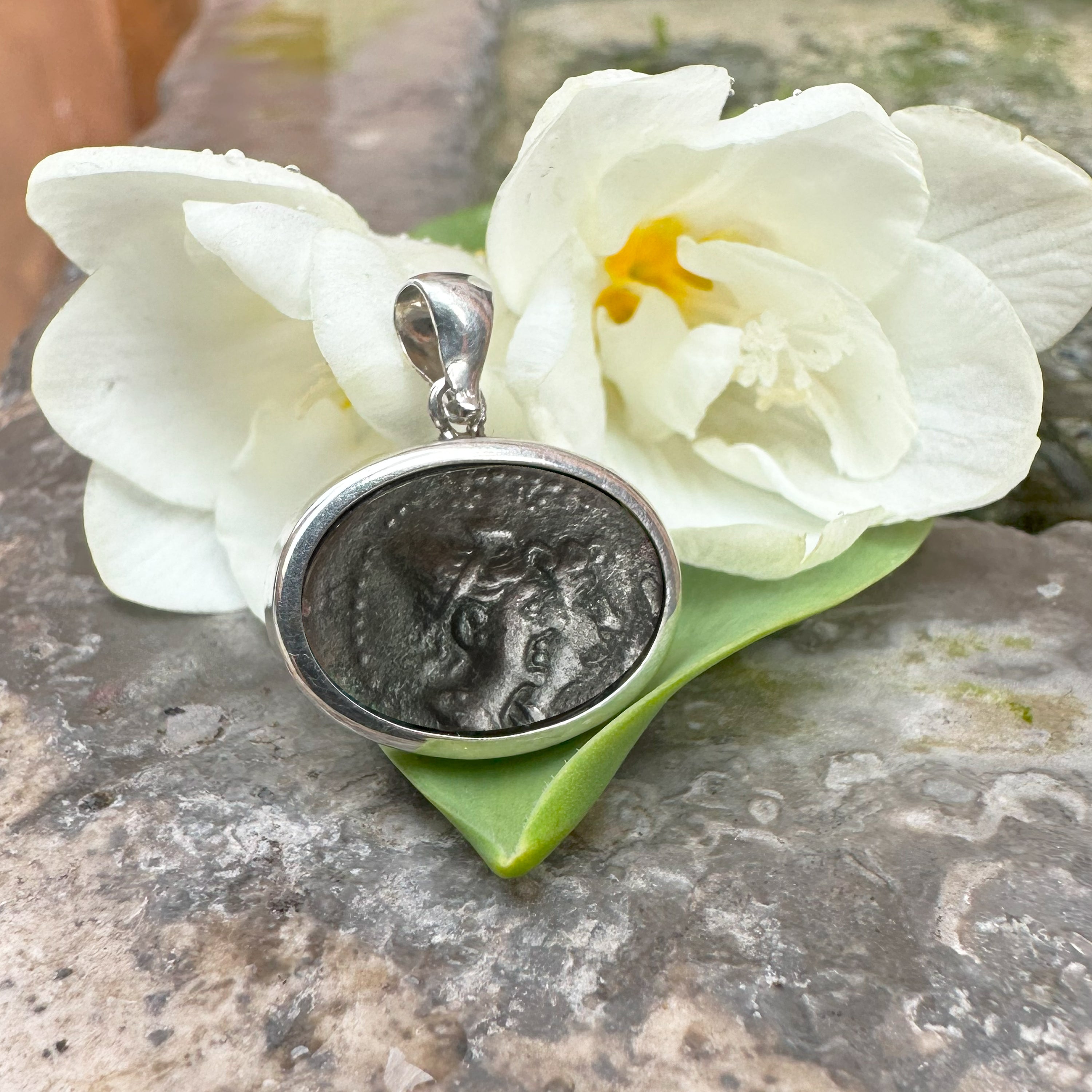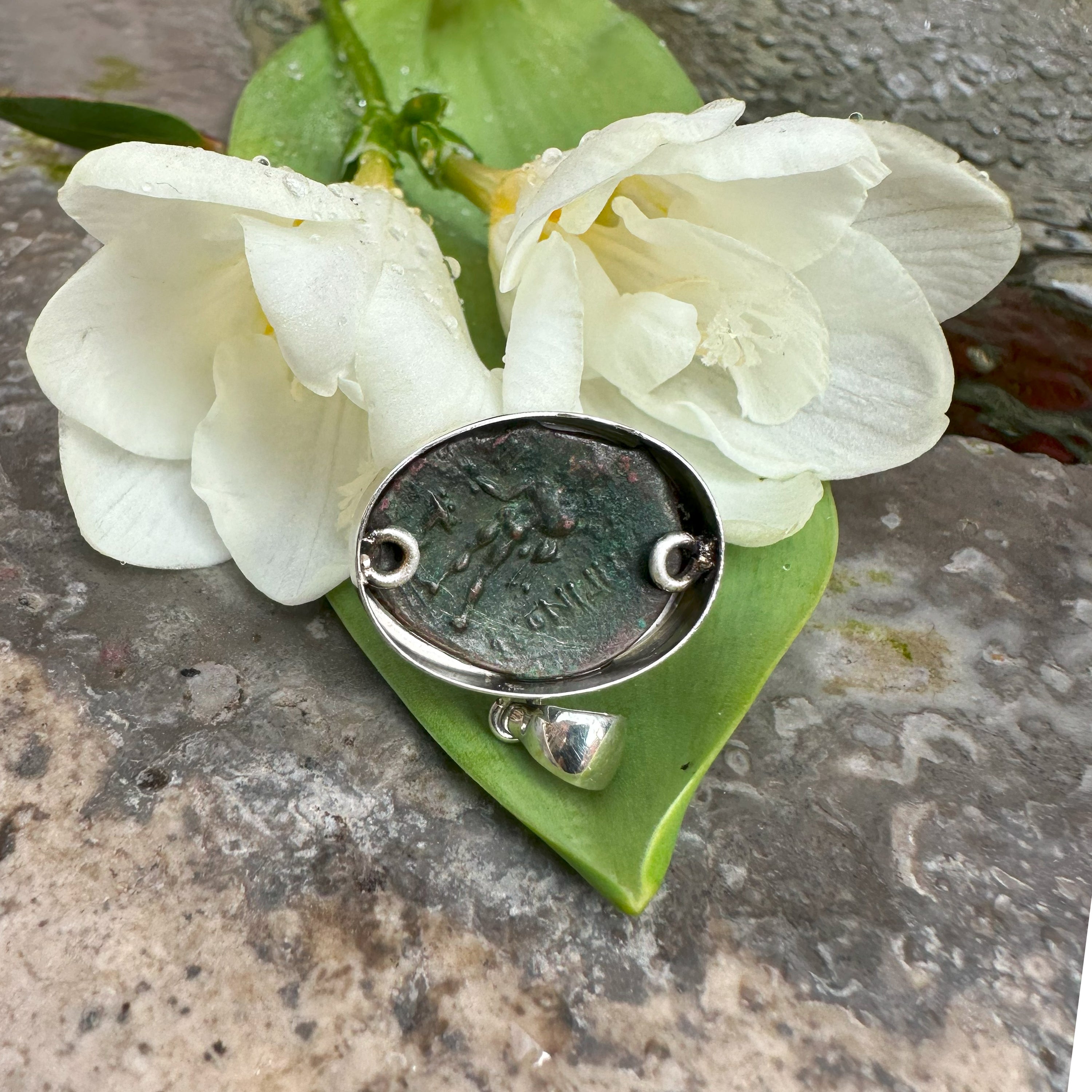 Set into this sterling silver pendant is an authentic bronze coin from Magna Graecia, dating to the 2nd century BC, depicting the Dioscuri, the twin horsemen Castor and Pollux, riding in unison. On the reverse of the coin stands Asclepius, god of healing and medicine, holding his serpent-entwined staff.