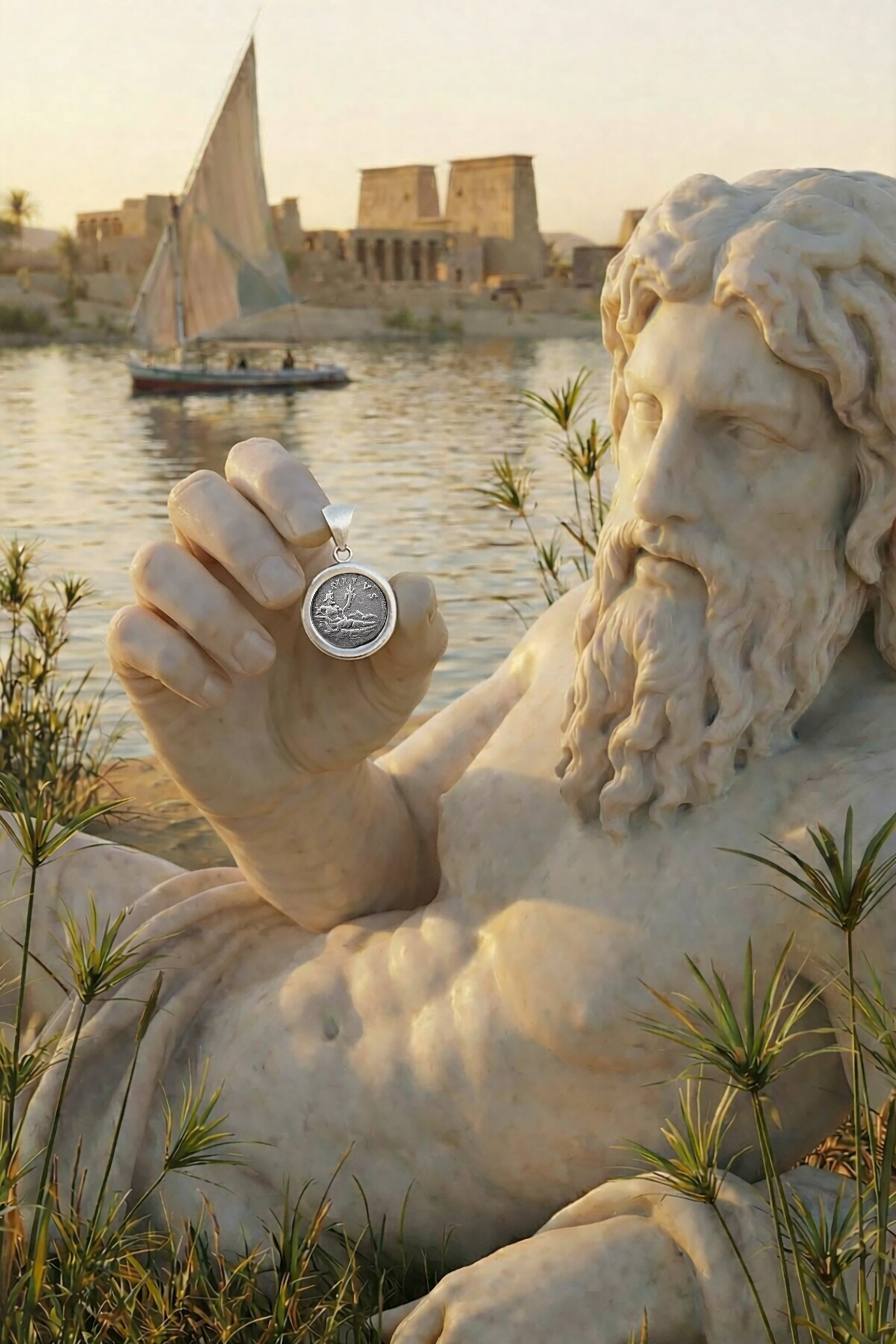 On the front (obverse) of the coin, the river god Nile is depicted, a powerful symbol of abundance, fertility, and the prosperity brought by Egypt to the Roman Empire. The Nile was often personified as a reclining male figure, representing the life-giving waters that sustained one of Rome’s most vital provinces.