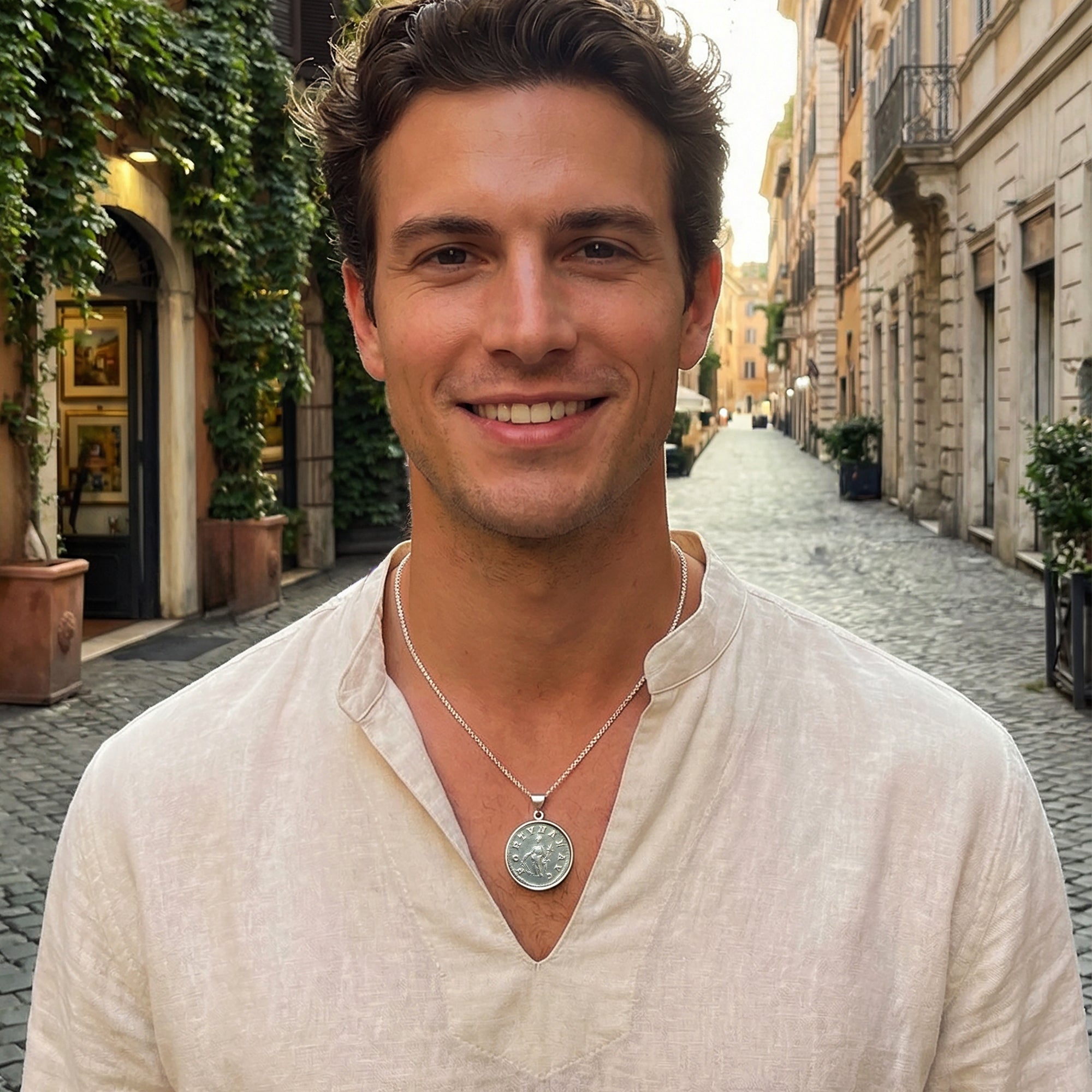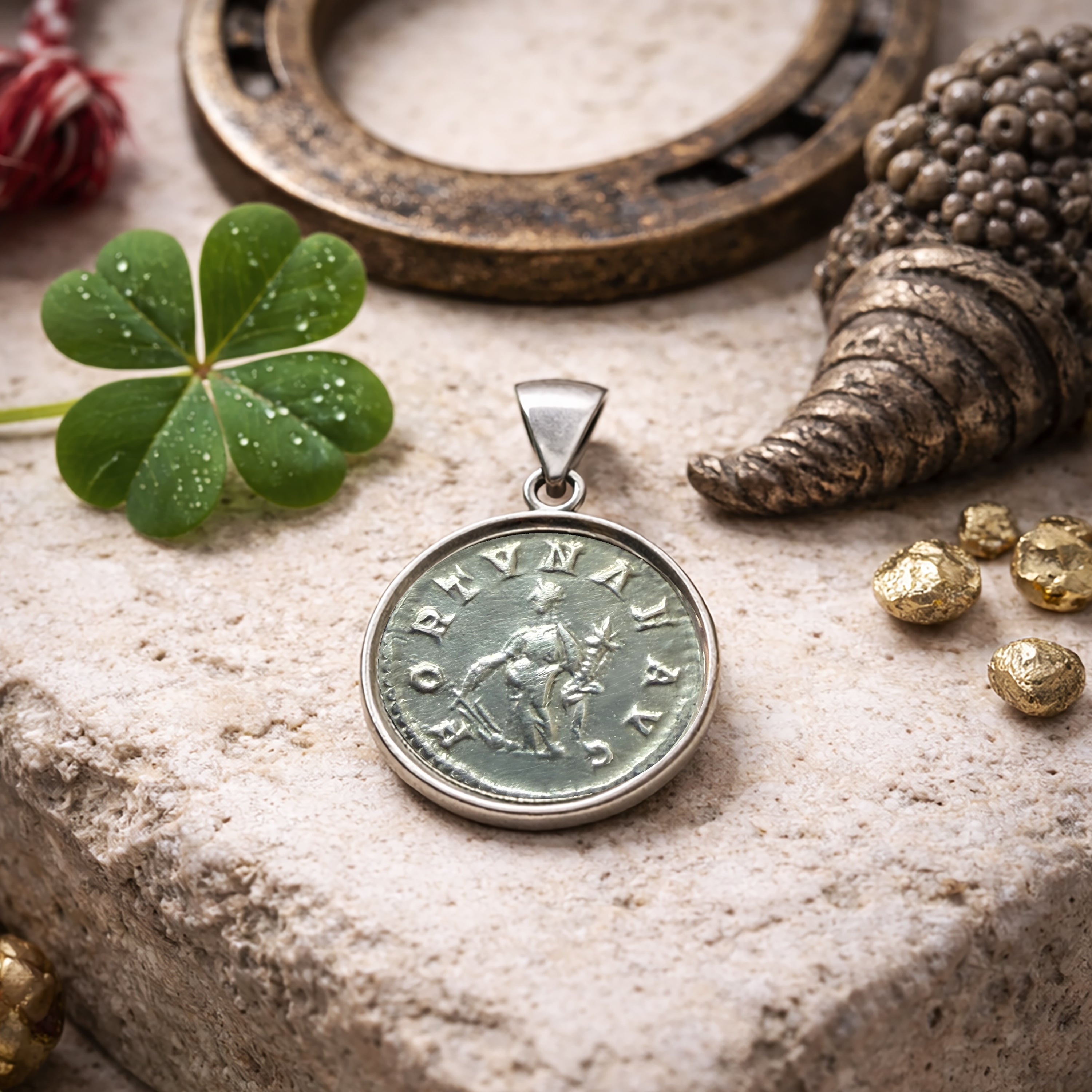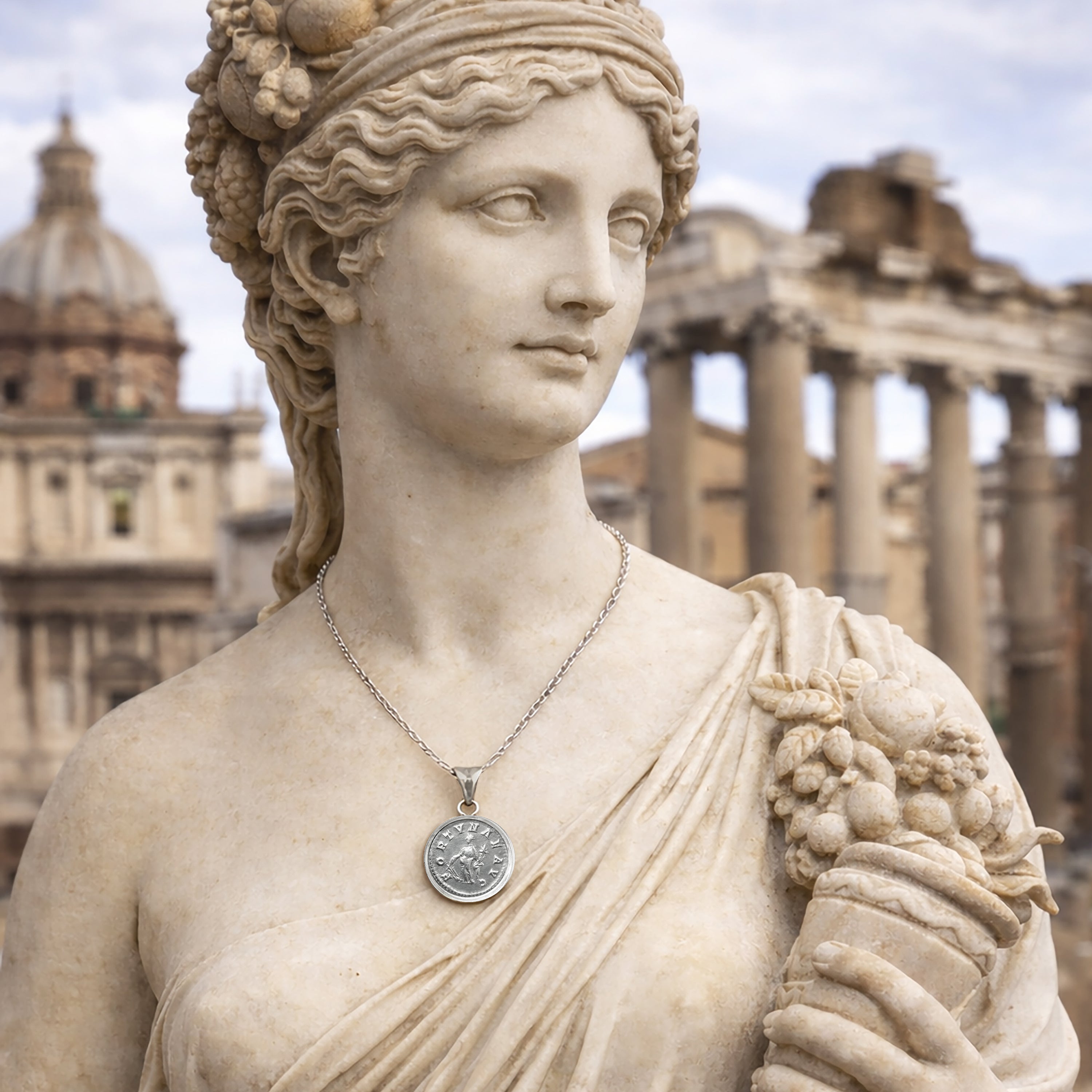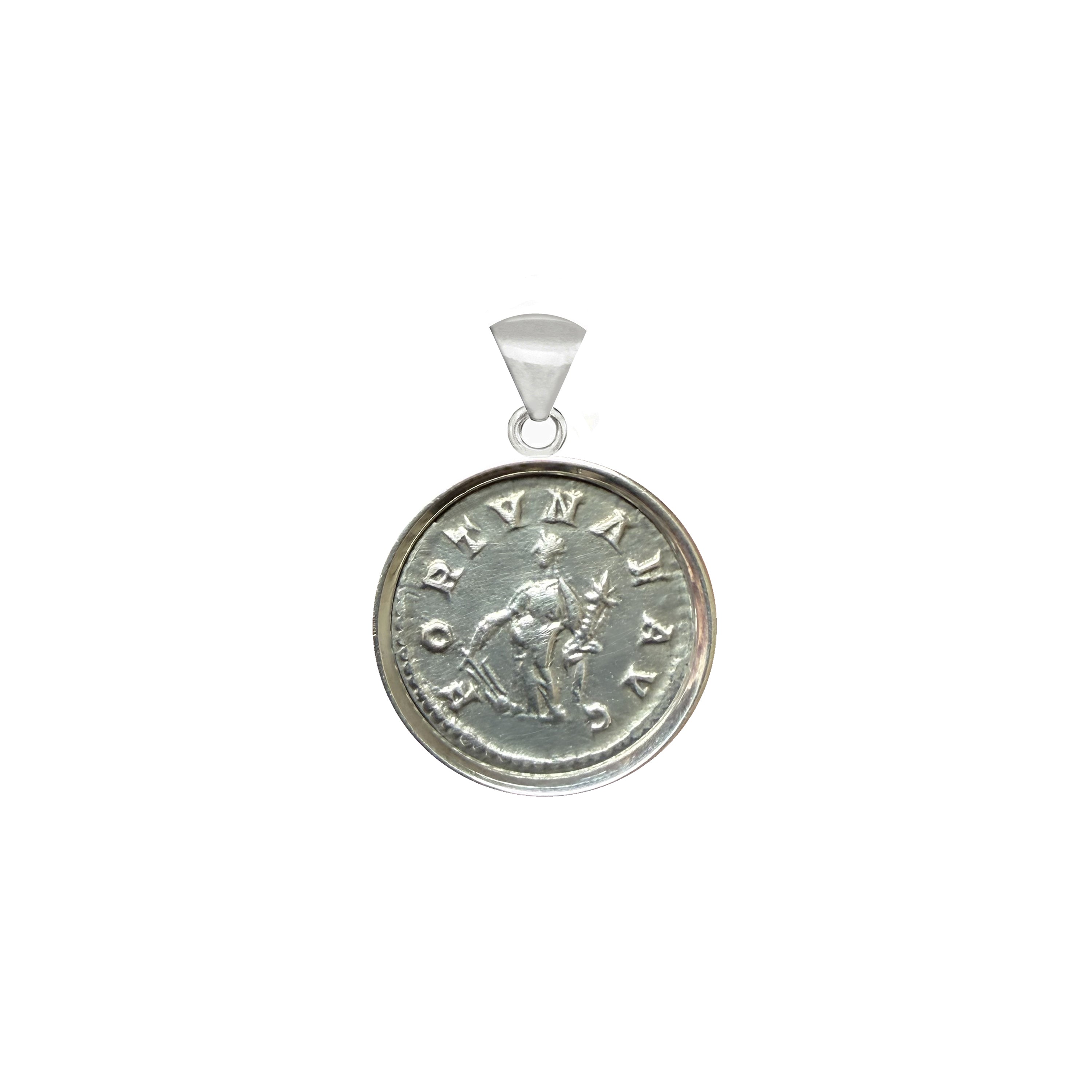 An authentic Roman silver coin from the 3rd century AD, depicting the goddess Fortuna on the obverse and the bust of Emperor Elagabalus on the reverse, has been beautifully set in this handcrafted sterling silver pendant by our skilled goldsmiths.