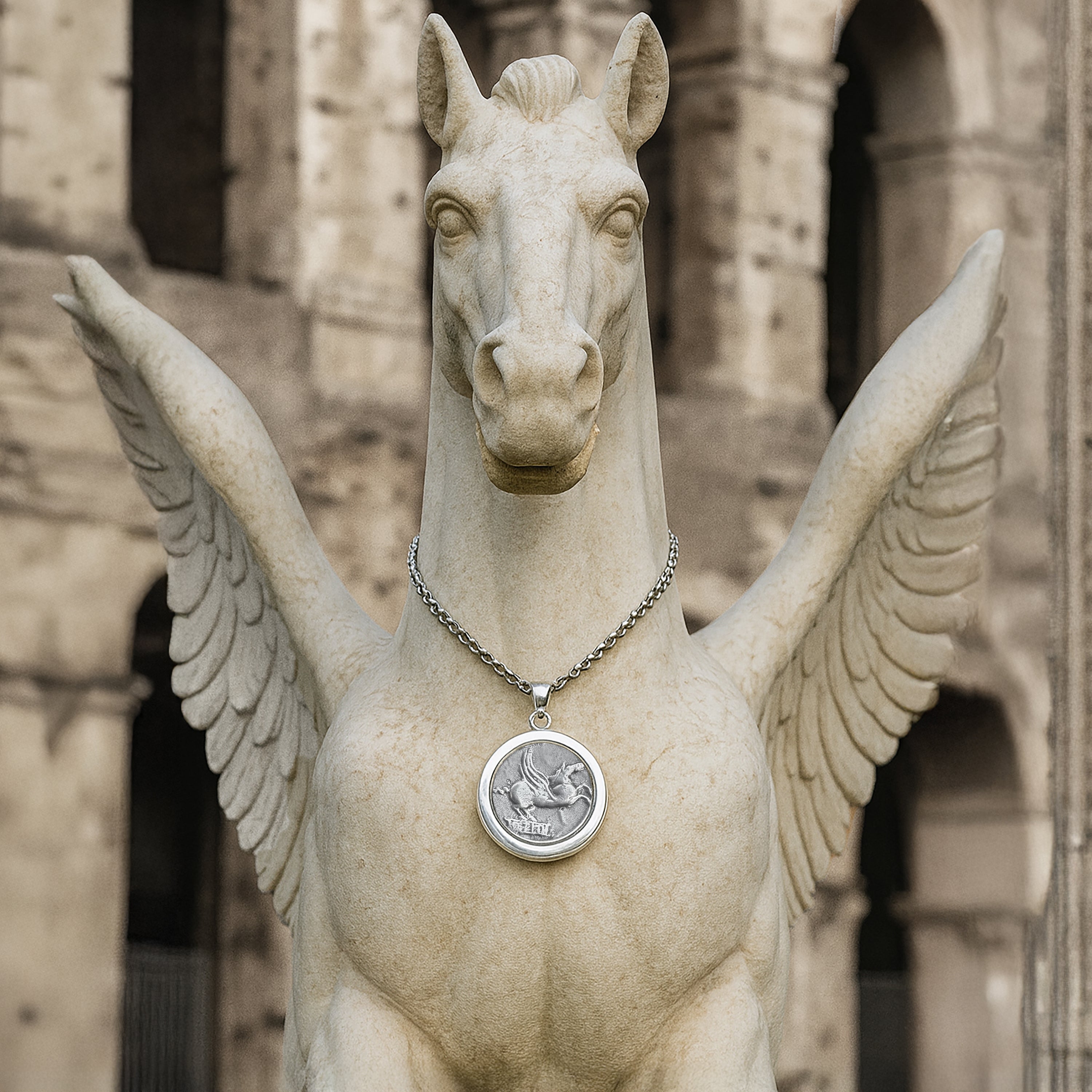 This sterling silver pendant holds an authentic Greek coin dating back to 90 BC, featuring a depiction of Pegasus, the legendary winged horse. On the reverse side of the coin, you can see Mutinus Titius, an ancient Roman deity associated with marriage and fertility, resembling the deity Priapus. The Temple of Mutinus Titius was located on the Velia hill and is believed to have existed from the founding of Rome until the 1st century BC.