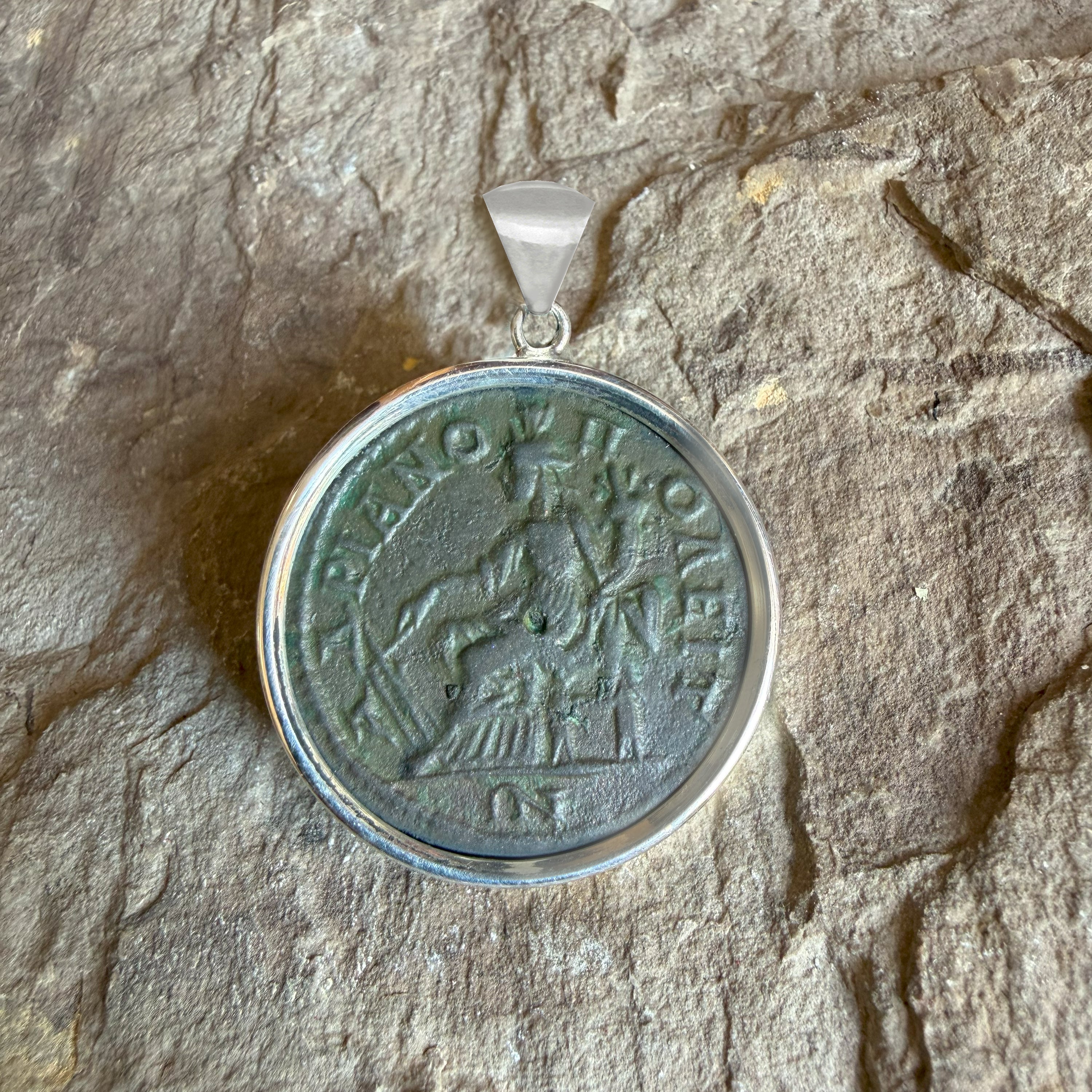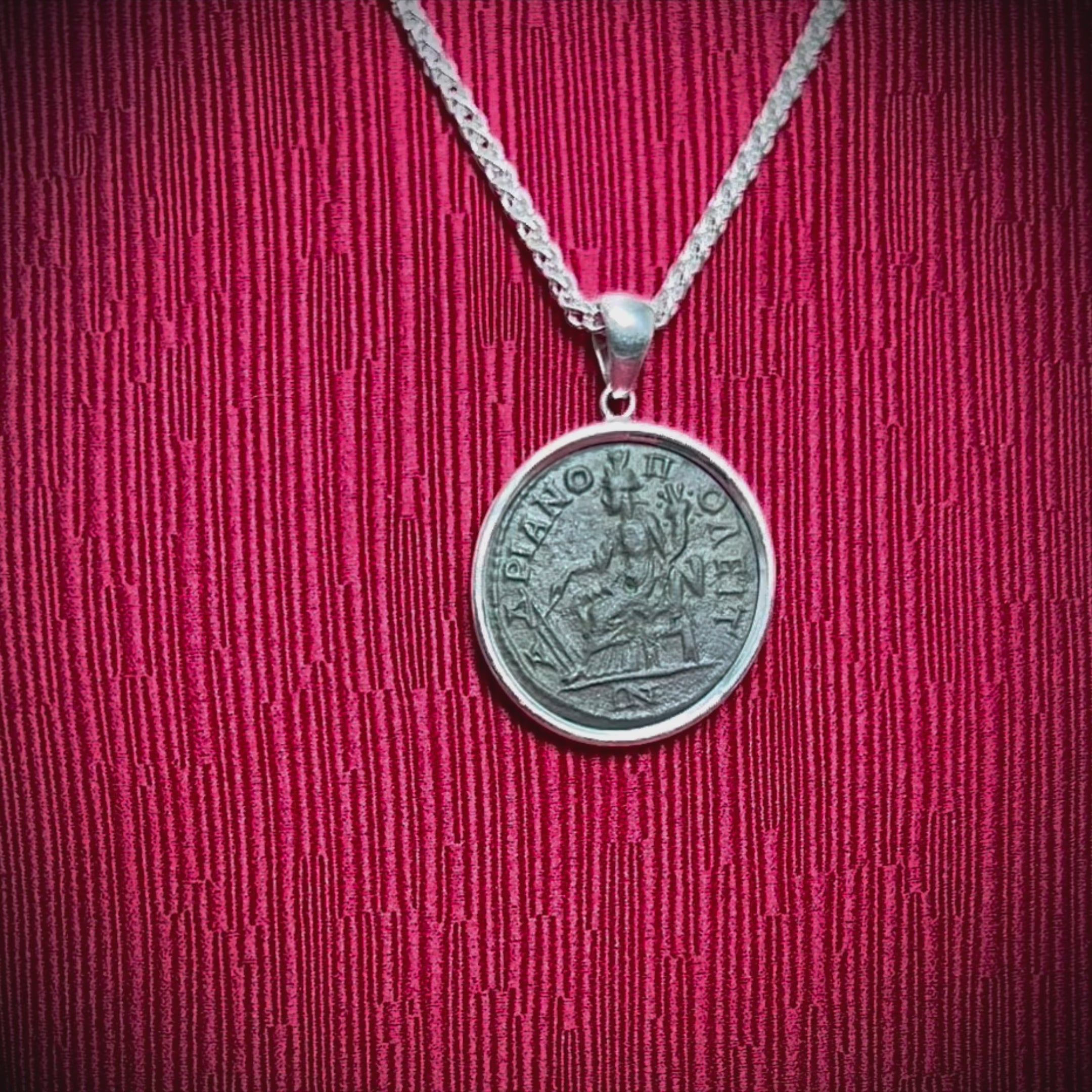 An authentic Roman bronze coin from the 3rd century AD, depicting the goddess Fortuna seated on a throne on the obverse and Emperor Gordian III on the reverse, has been beautifully set in this handcrafted sterling silver pendant by our skilled goldsmiths.