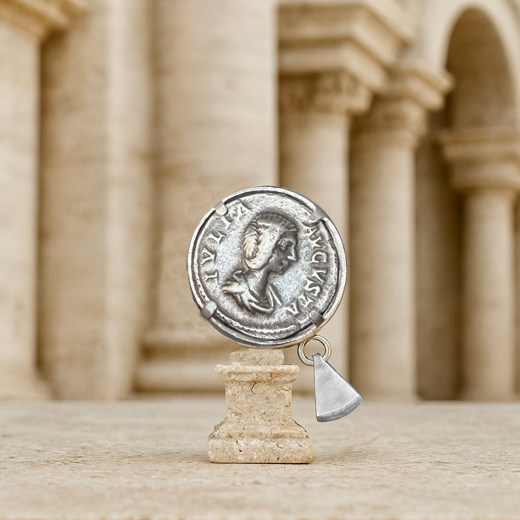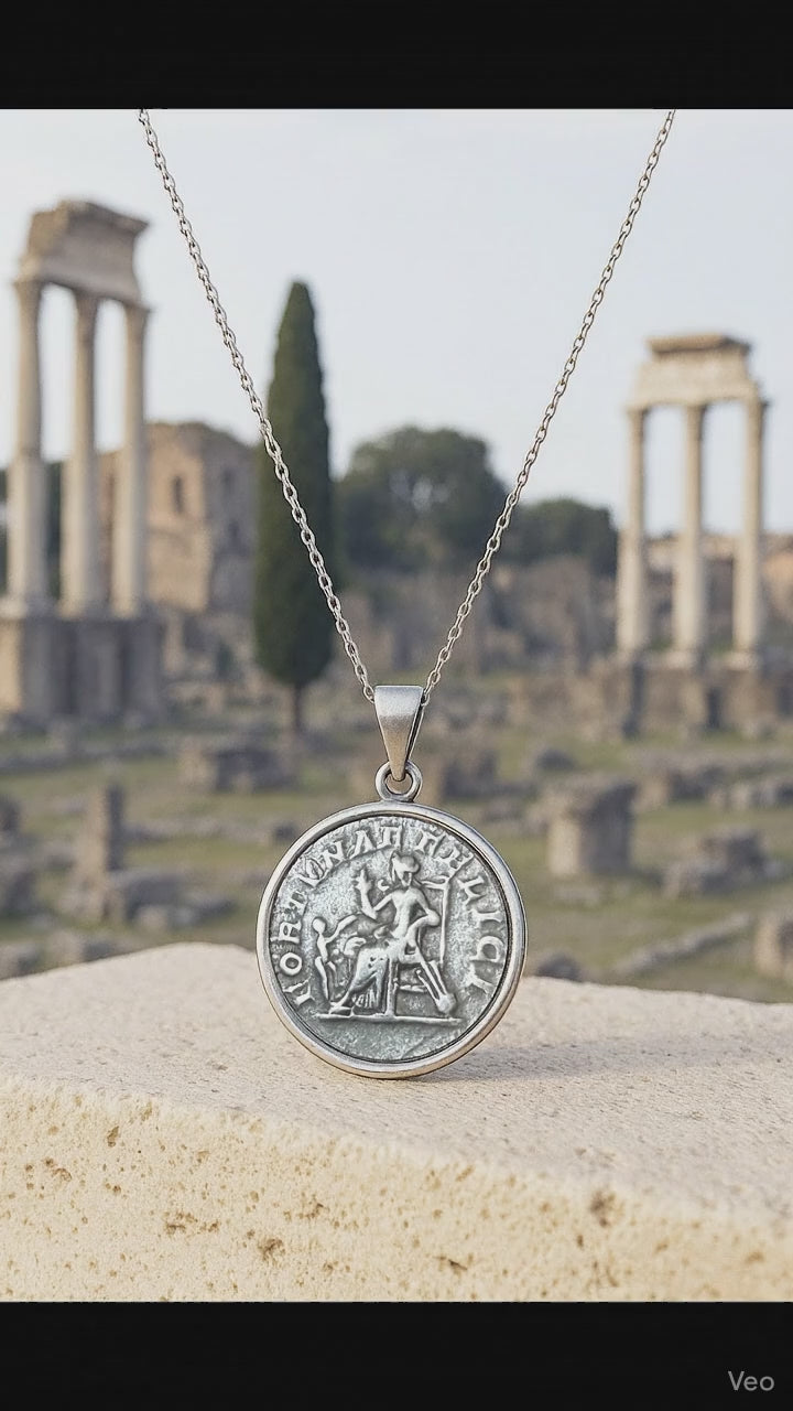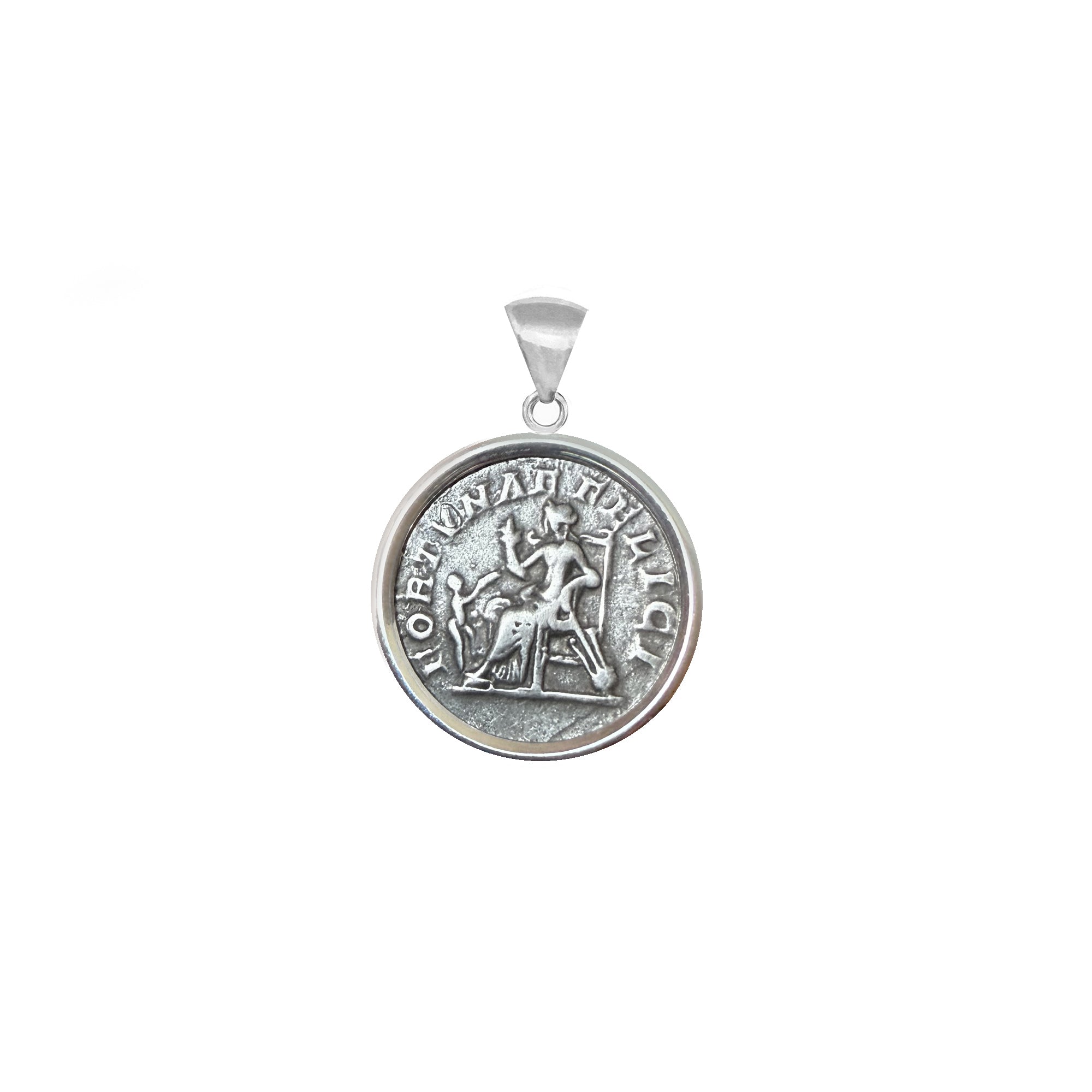 An authentic Roman silver coin from the 3rd century AD, depicting the goddess Fortuna seated on a throne on the obverse and the bust of Julia Domna on the reverse, has been beautifully set in this handcrafted sterling silver pendant by our skilled goldsmiths.