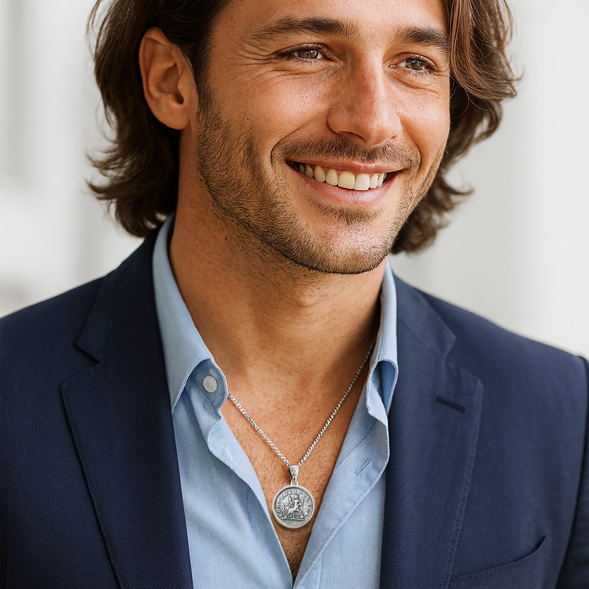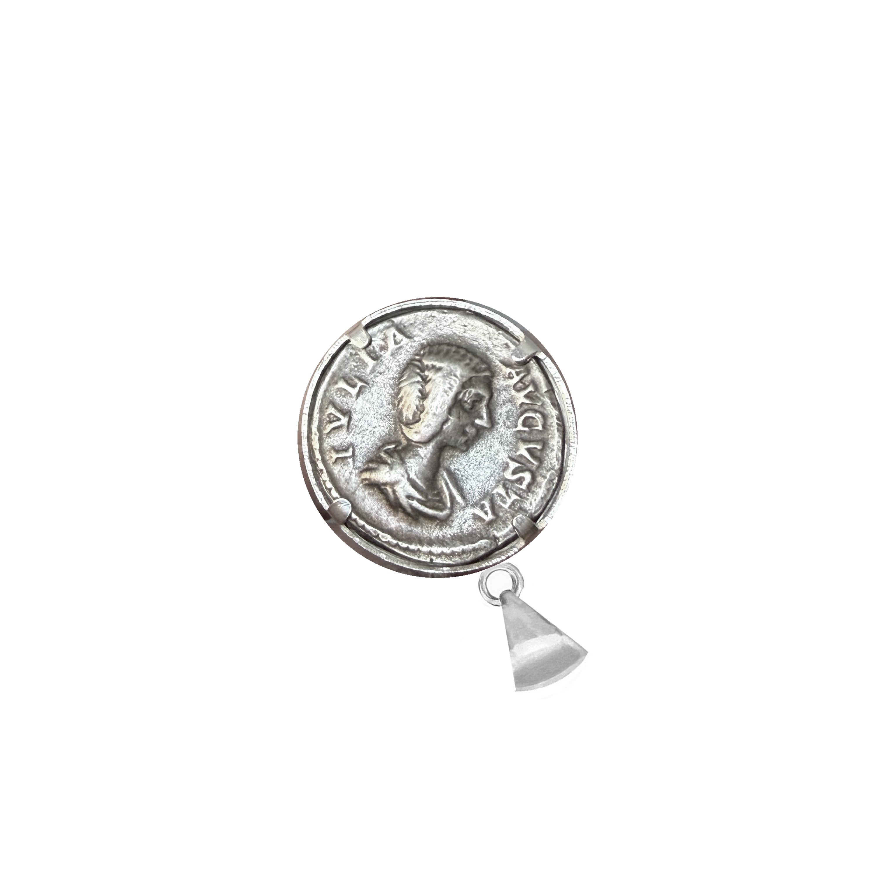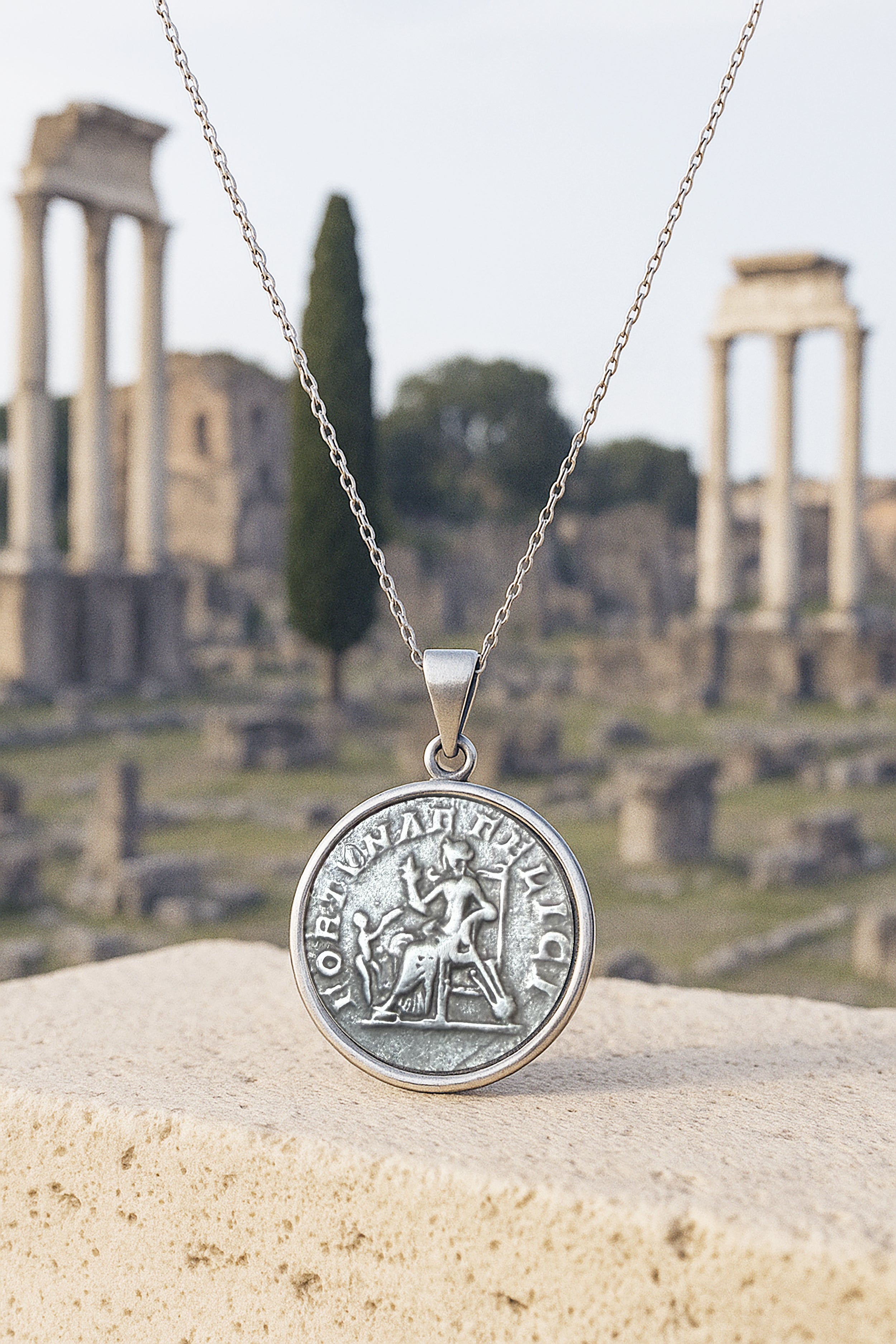 An authentic Roman silver coin from the 3rd century AD, depicting the goddess Fortuna seated on a throne on the obverse and the bust of Julia Domna on the reverse, has been beautifully set in this handcrafted sterling silver pendant by our skilled goldsmiths.