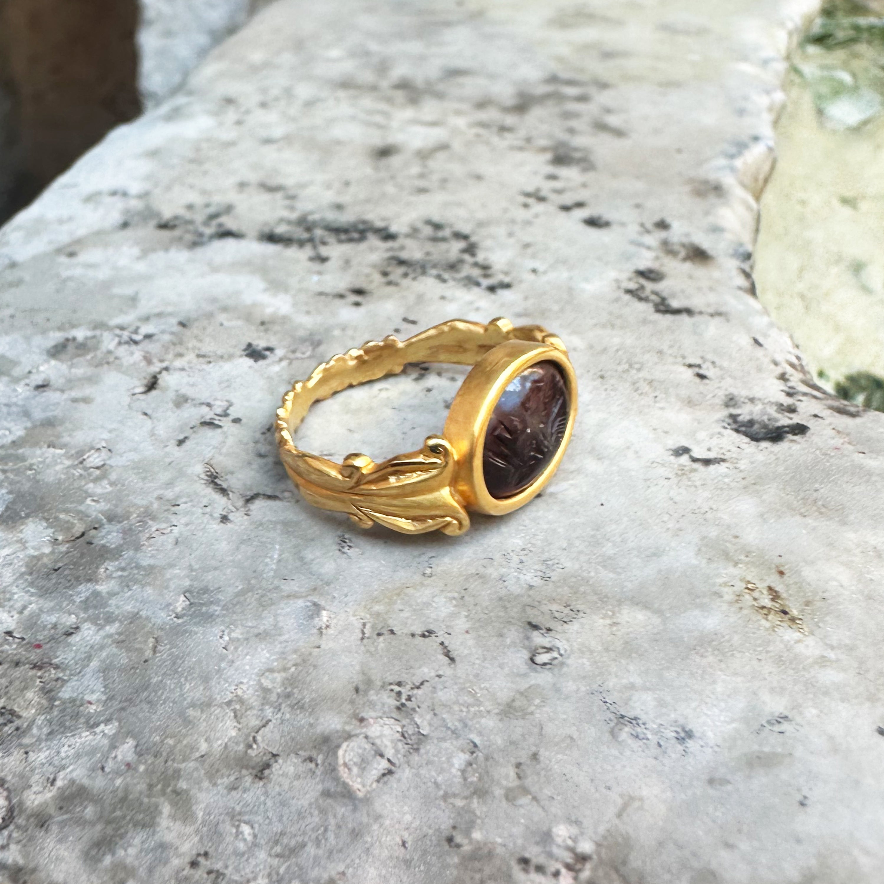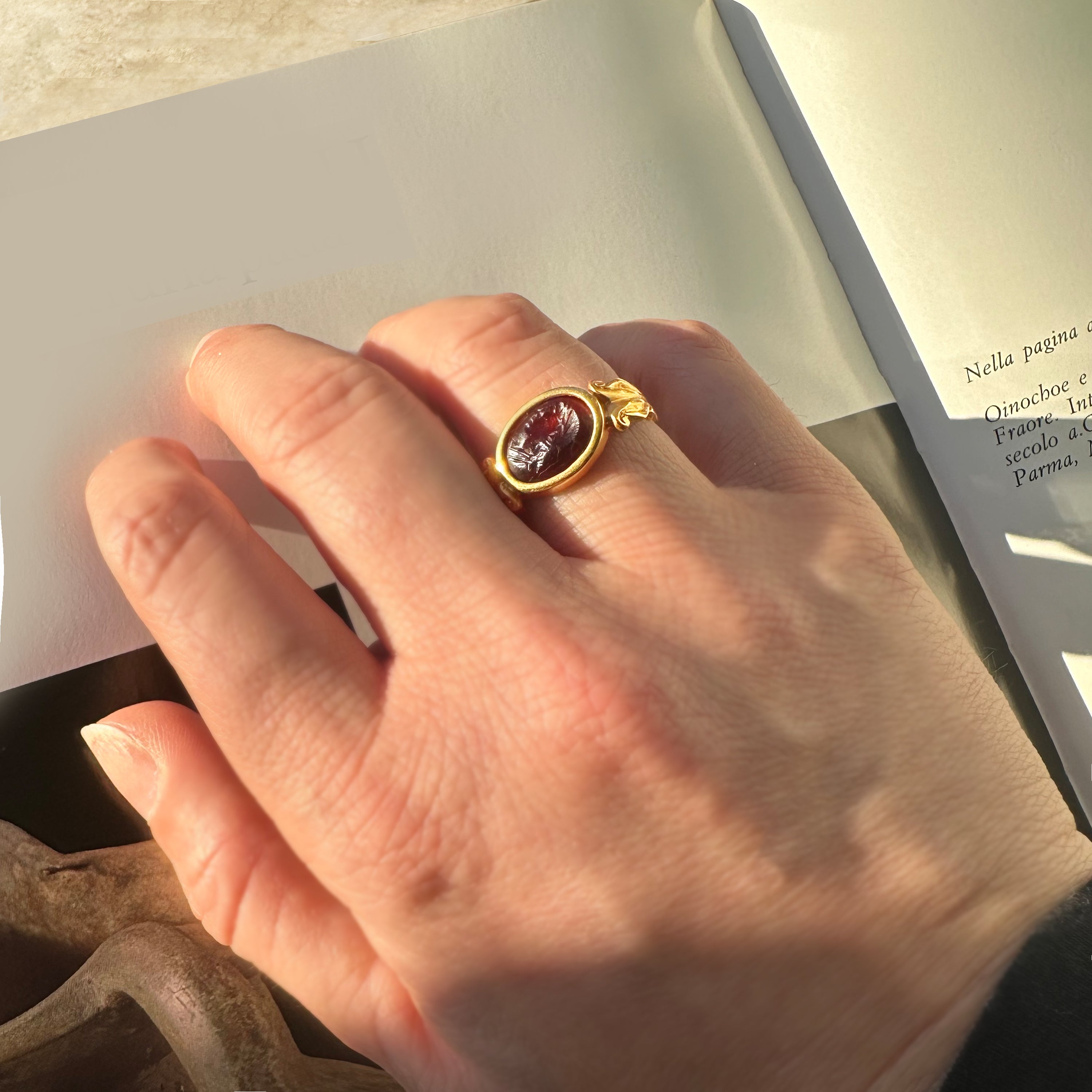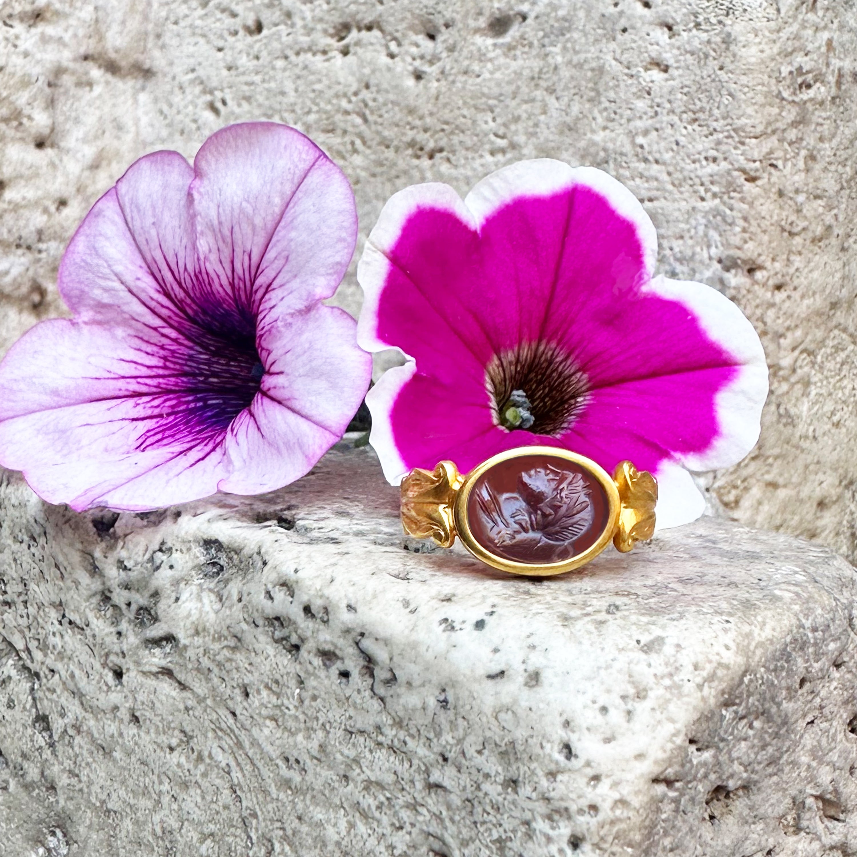 This exquisite 18 kt gold ring showcases a remarkable Roman intaglio on garnet, which dates back to the 1st-2nd century AD. The intaglio depicts the Greek God Apollo, a multifaceted deity in Greek mythology, associated with many aspects of life.