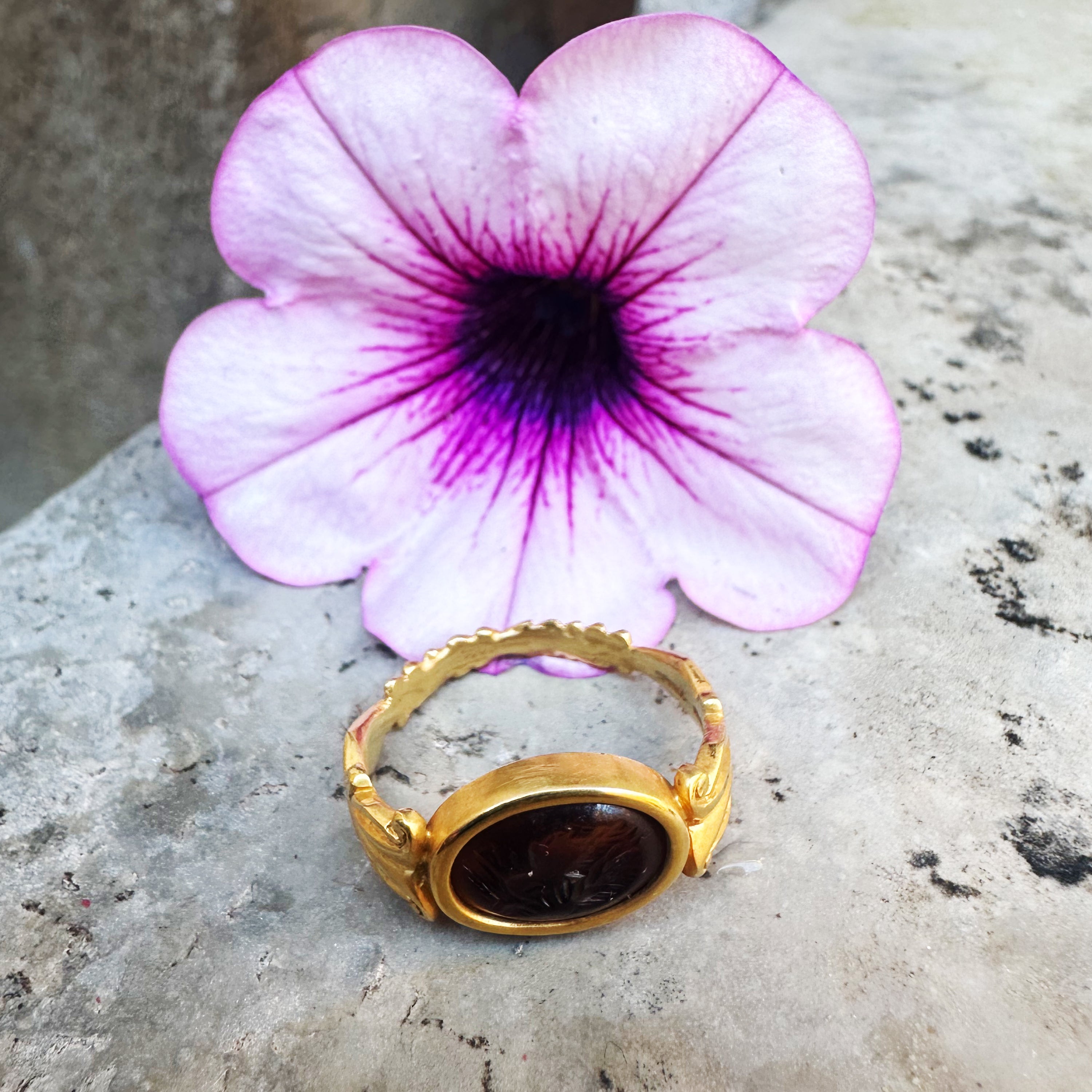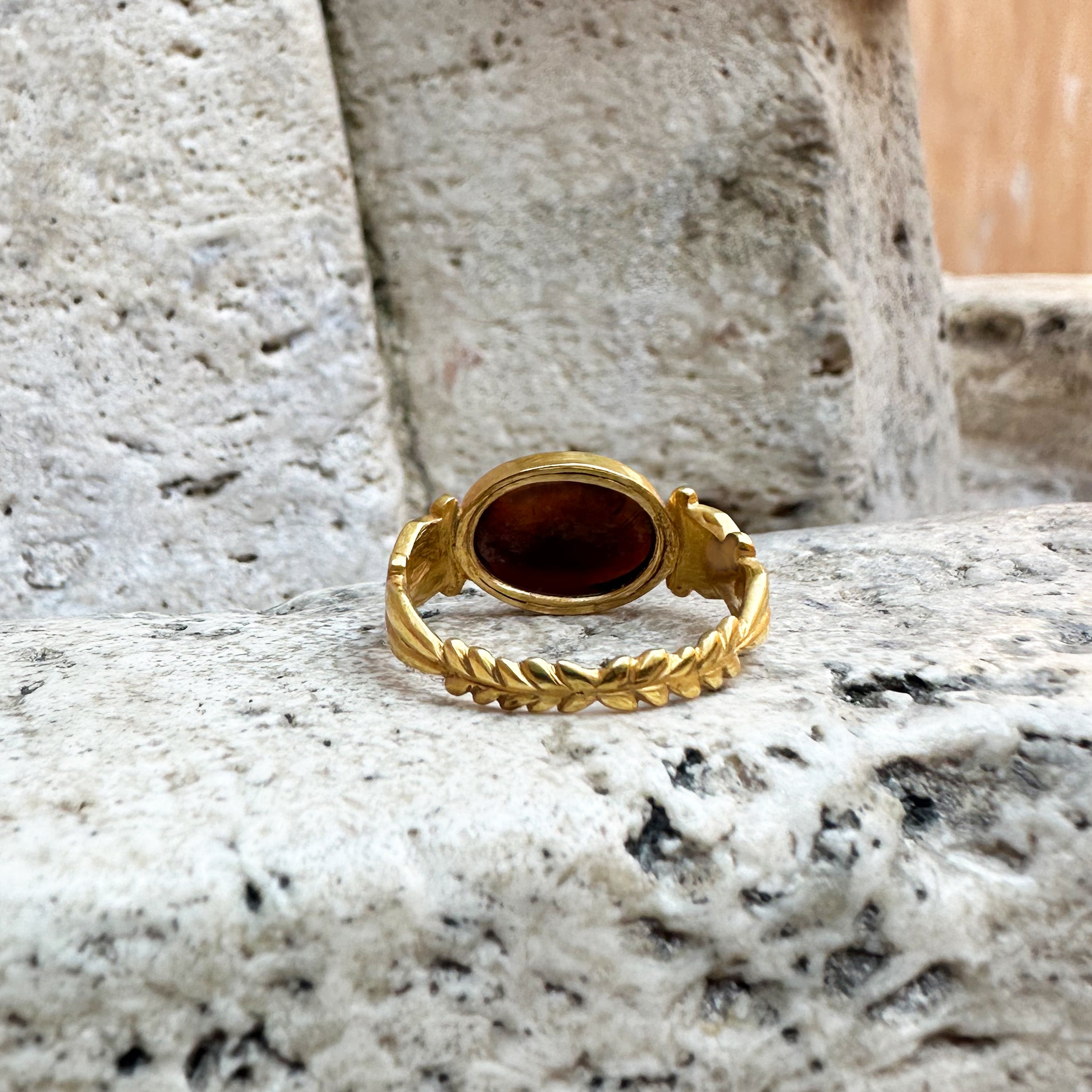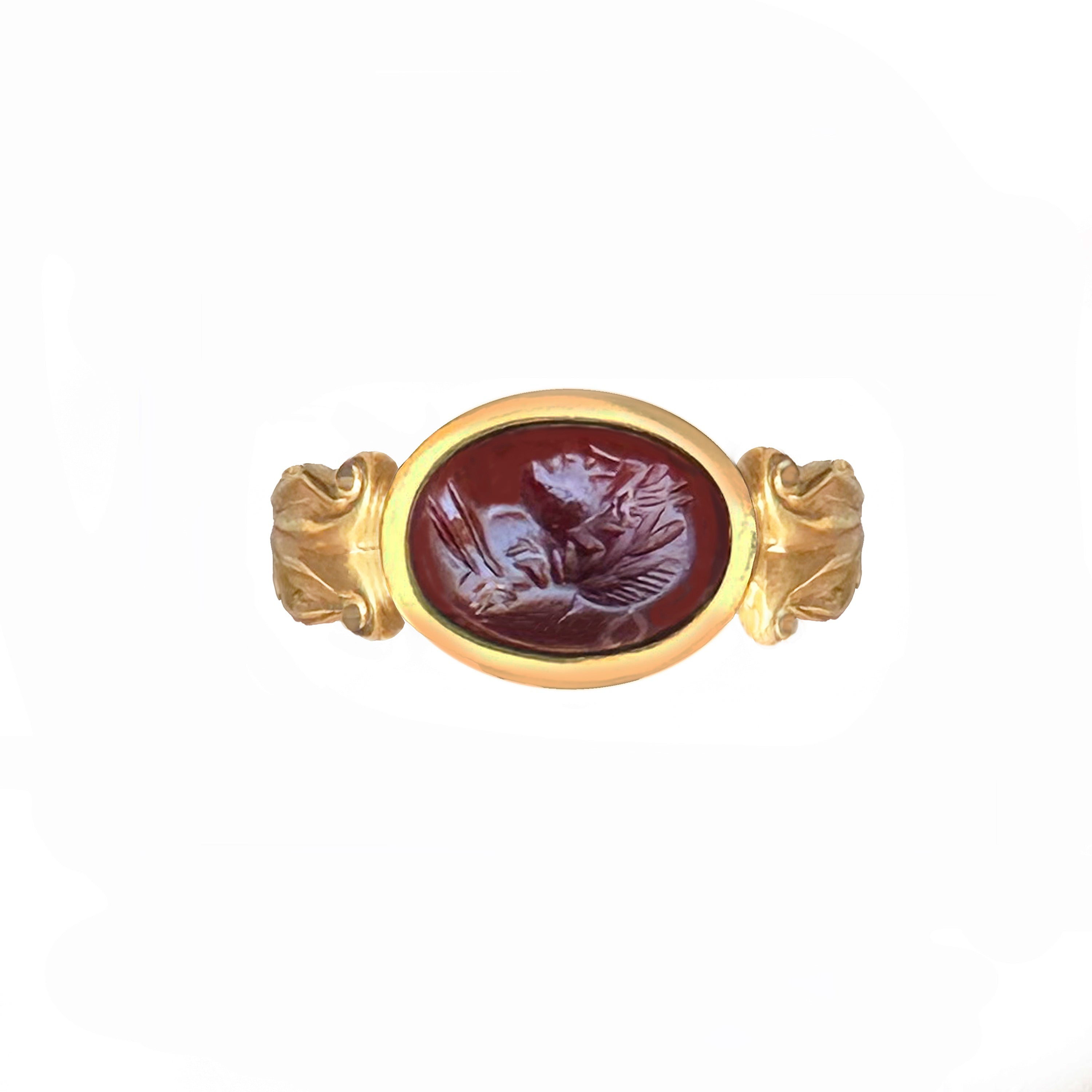 This exquisite 18 kt gold ring showcases a remarkable Roman intaglio on garnet, which dates back to the 1st-2nd century AD. The intaglio depicts the Greek God Apollo, a multifaceted deity in Greek mythology, associated with many aspects of life.
