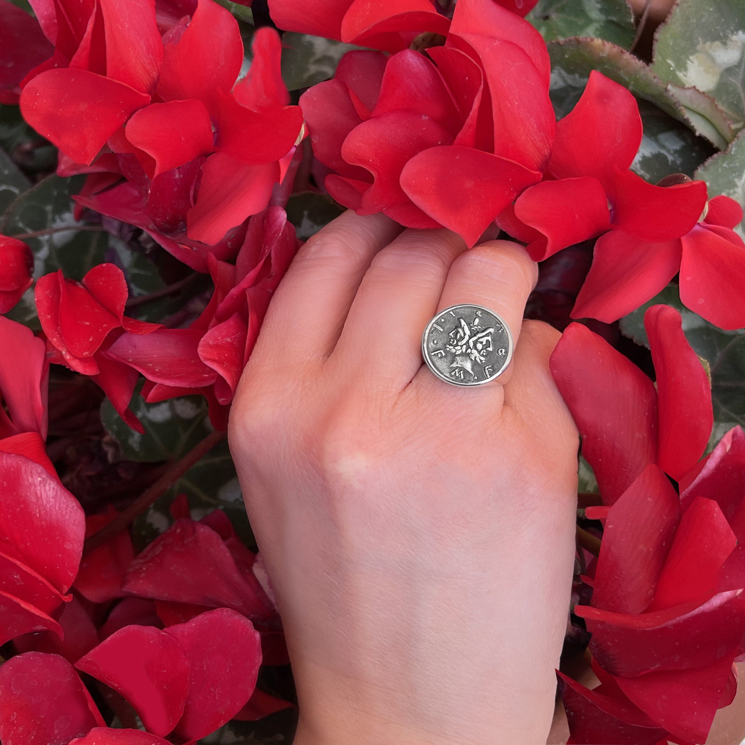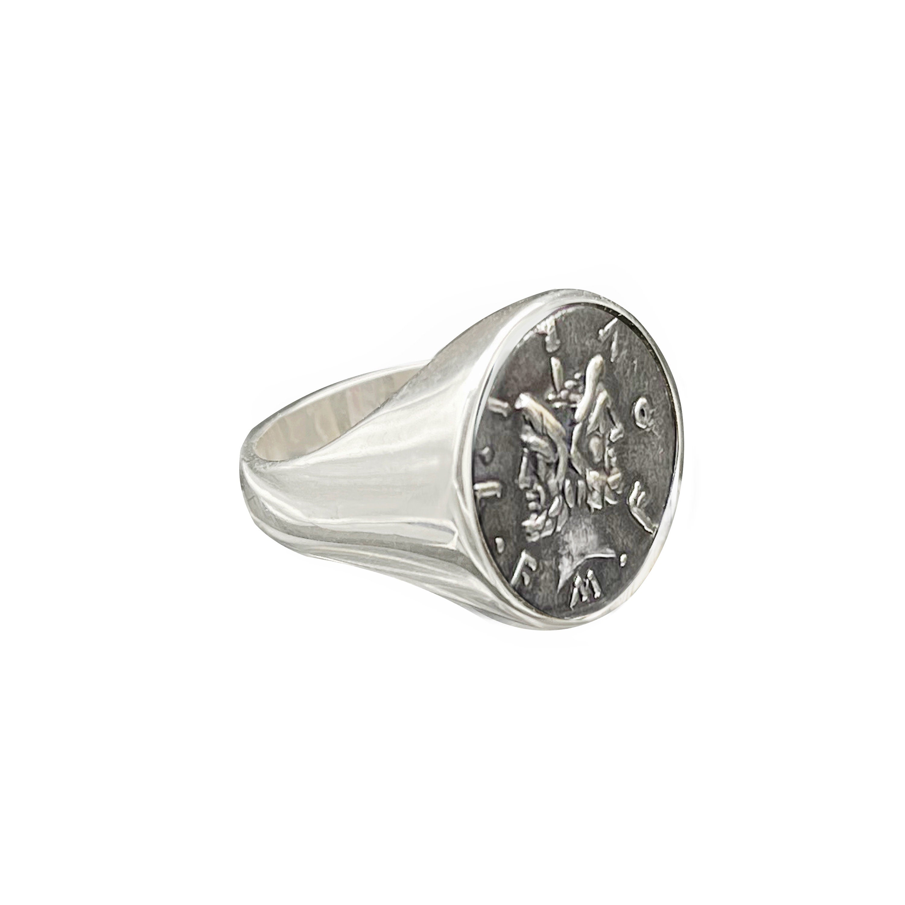 This sterling silver ring showcases an authentic Roman coin from the 2nd century, featuring a depiction of the two-faced God Janus. Janus was revered in ancient Roman religion and myth as the god of beginnings, transitions, time, and duality. With his two faces, he symbolizes the ability to look to the future and the past. While it is commonly believed that January is named after Janus, ancient Roman farmers' almanacs attribute the tutelary deity of the month to Juno.