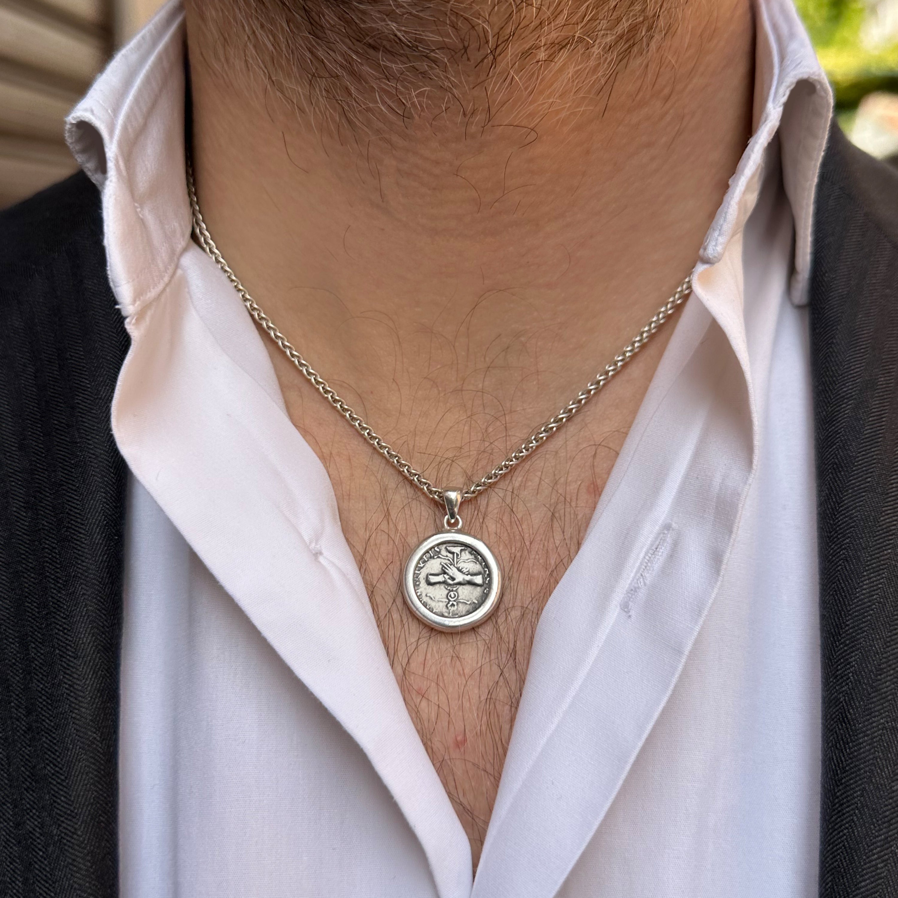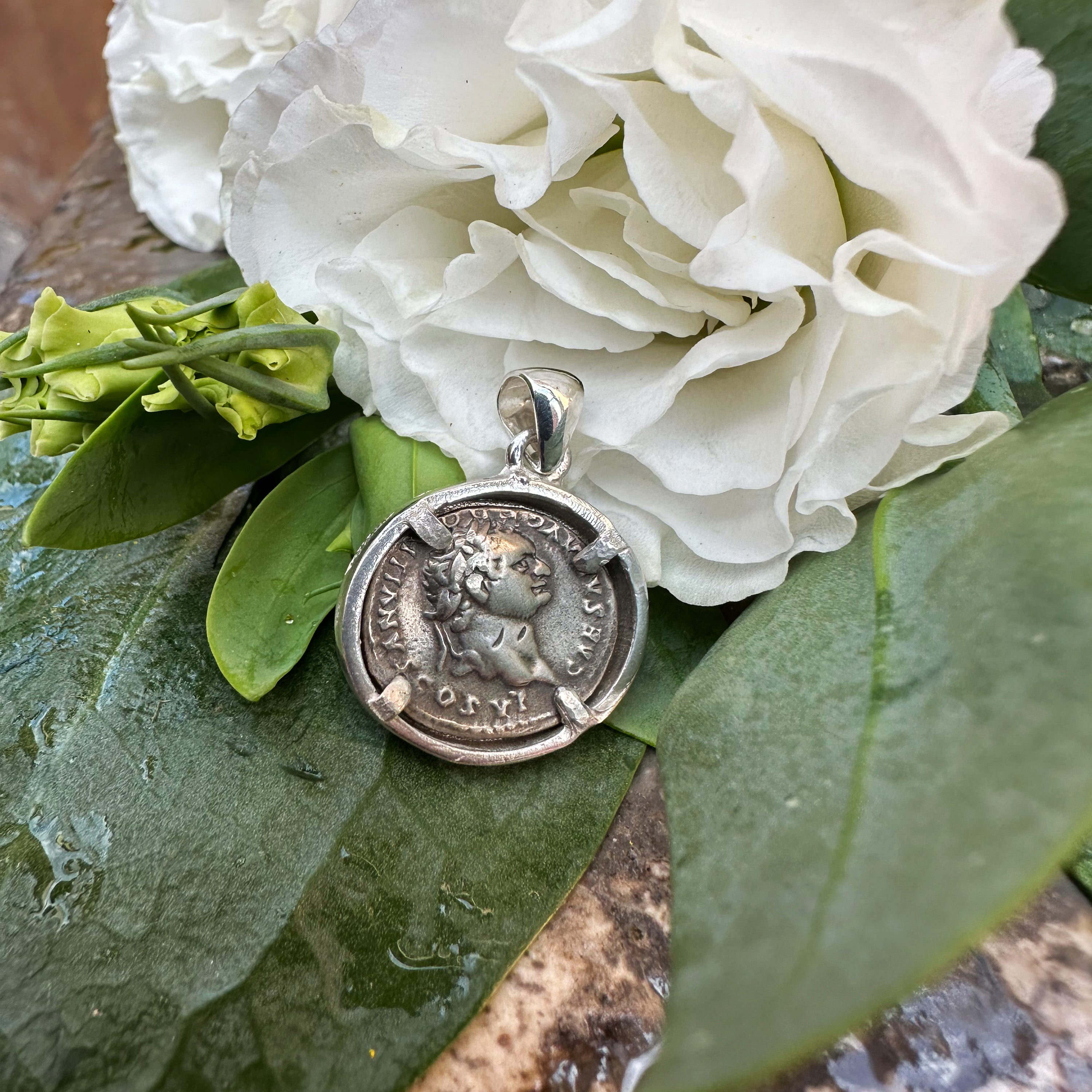 This sterling silver pendant features an authentic Roman coin minted during the reign of Emperor Domitian (AD 81–96).