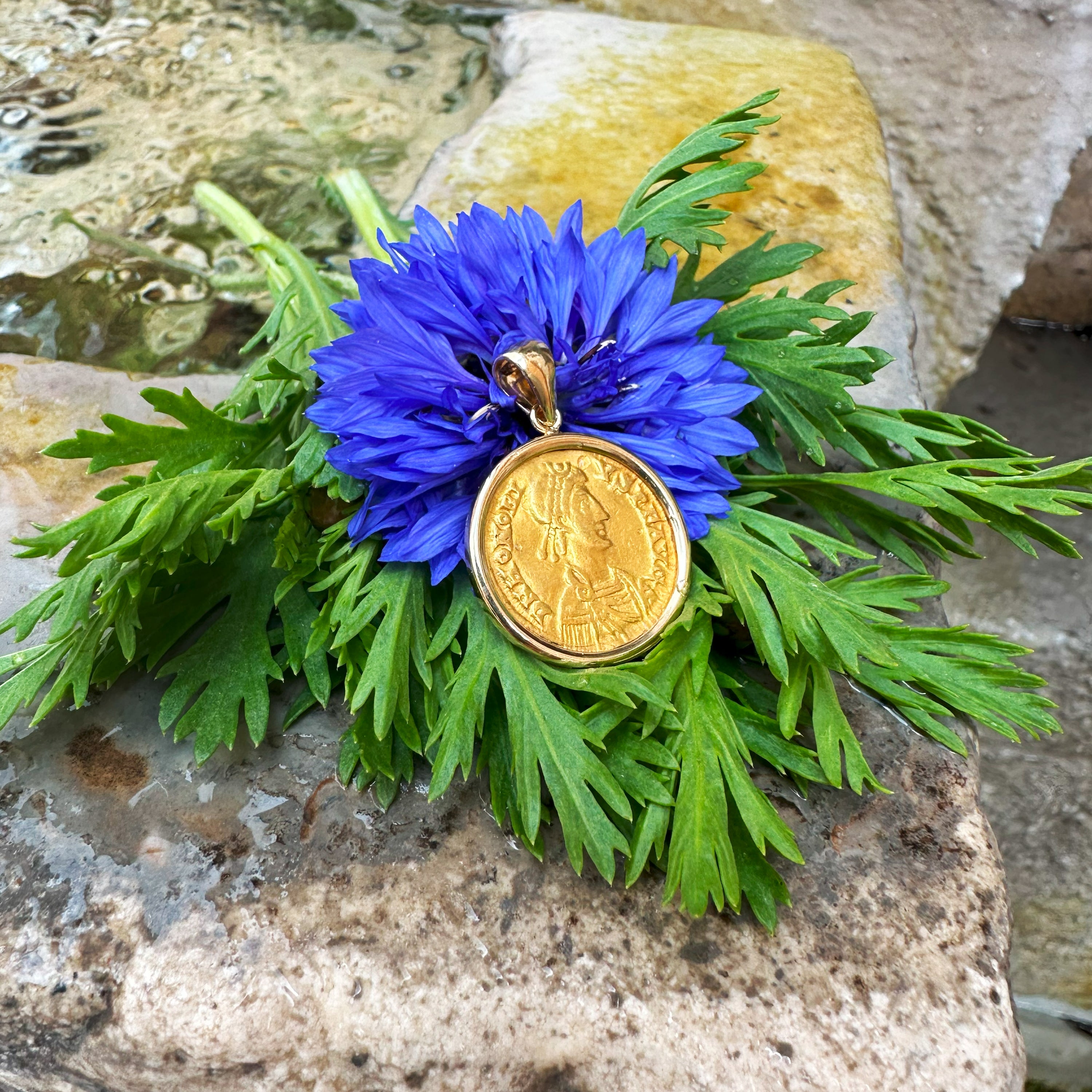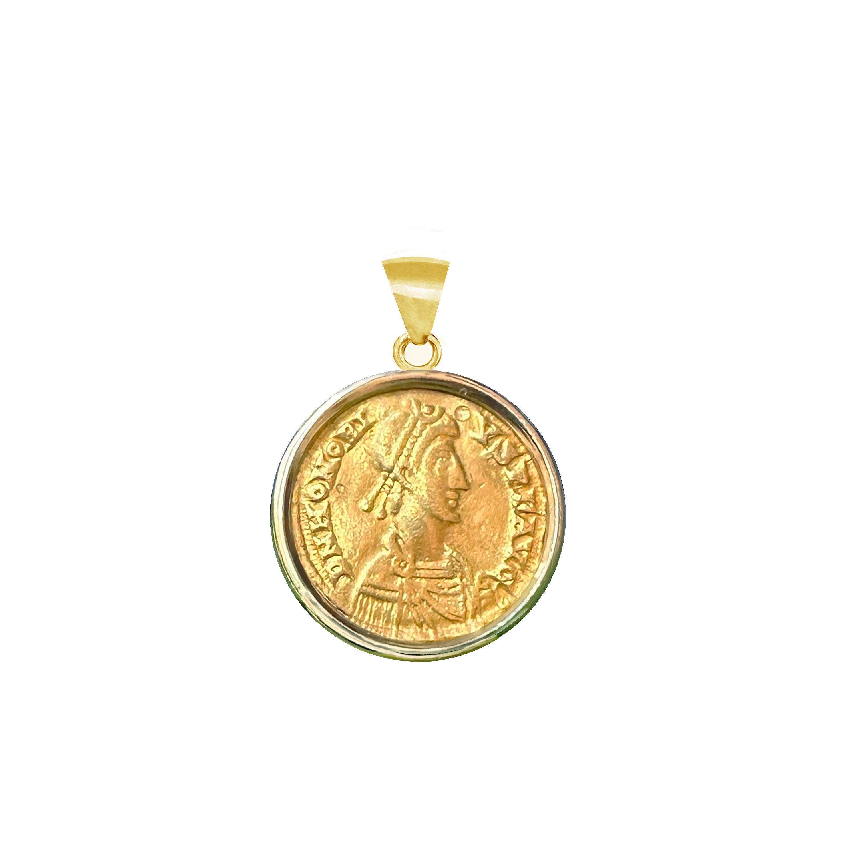 This pendant showcases an authentic 24 Kt Roman solidus from the reign of Emperor Honorius (393–423 AD), set in an elegant 18 Kt gold frame.