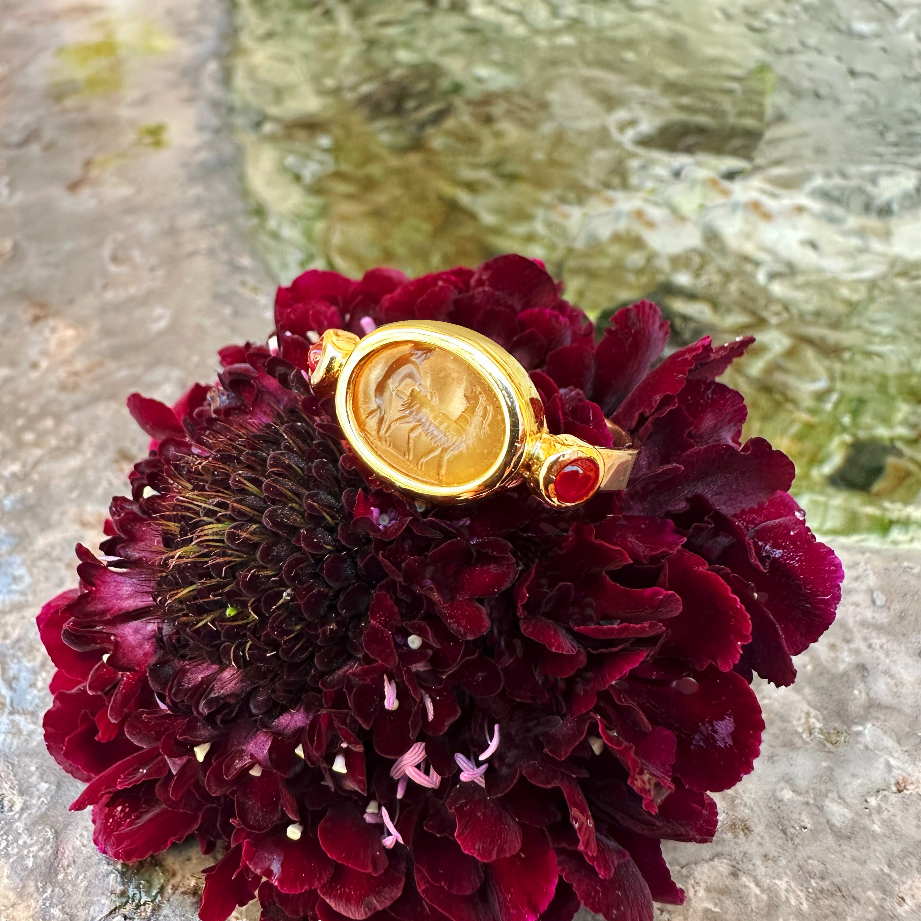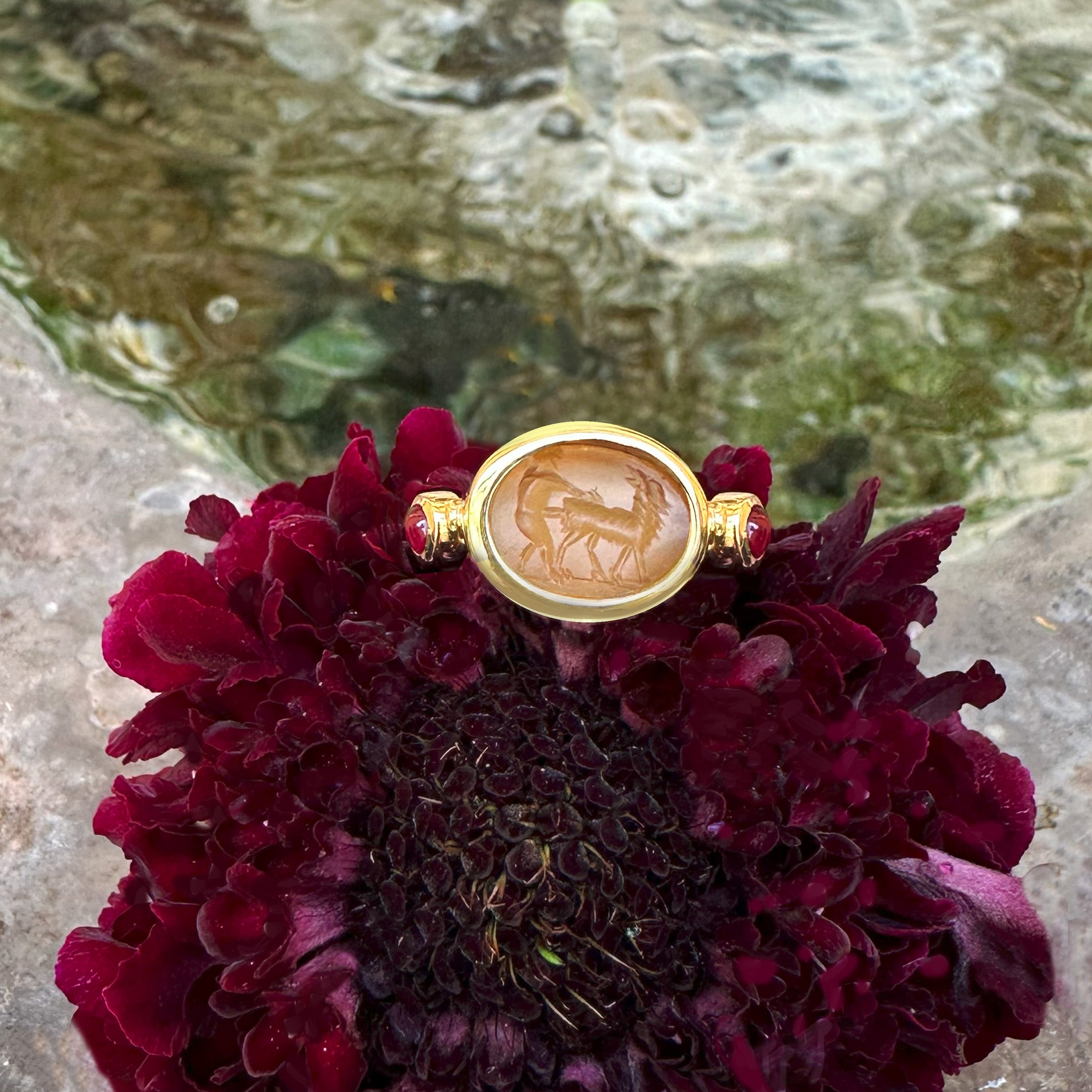 An authentic Roman carnelian from the 1st-2nd century AD has been set in this 18 kt gold ring. which depicts a faun, a woodland deity, and a goat—a classical motif rich in symbolism and mythological meaning.