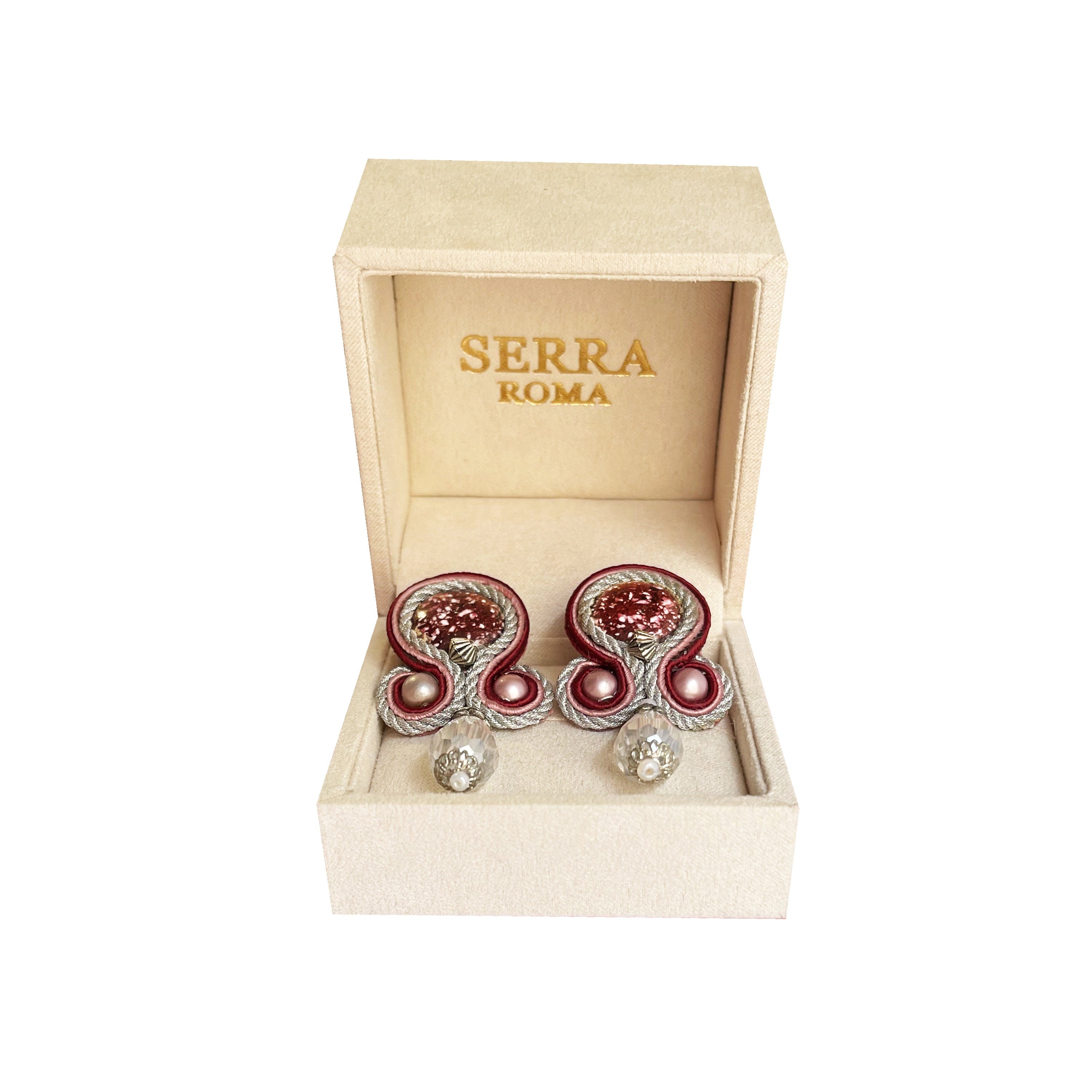 These earrings are made entirely by hand with the ancient soutache technique and have a fragment of an ancient Roman marble, red porphyry, set in the center. Soutache is a form of embroidery of ancient origins. Initially it was not used to make bijoux but to embellish the clothes of the Tsars, the cloaks of the emperors, or the military uniforms of the highest graduates. Over time, this particular technique also established itself in Italy and the first dresses embroidered with this technique were those of the Popes. Today, the soutache technique is also used to make splendid bijoux. The red porphyry ,punctuated with white or pink inclusions, had its quarries in Egypt, and was already used in the Ptolemaic era. In Rome, with Trajan, the extraction and use of porphyry became usual. It was used in sculpture, for statues, sarcophagi, floor inlays, so much that Diocletian made of it the exclusive ornament of his palaces.