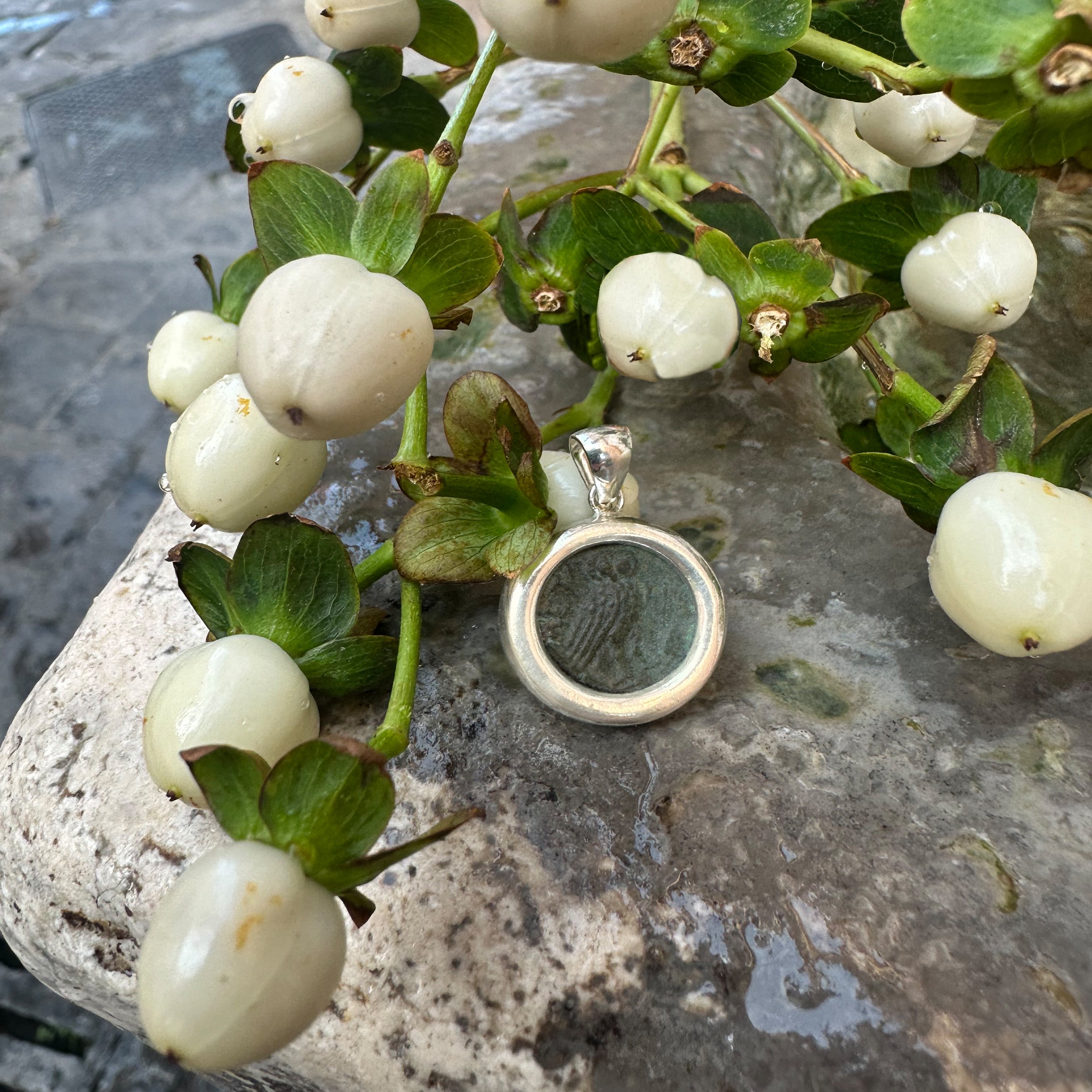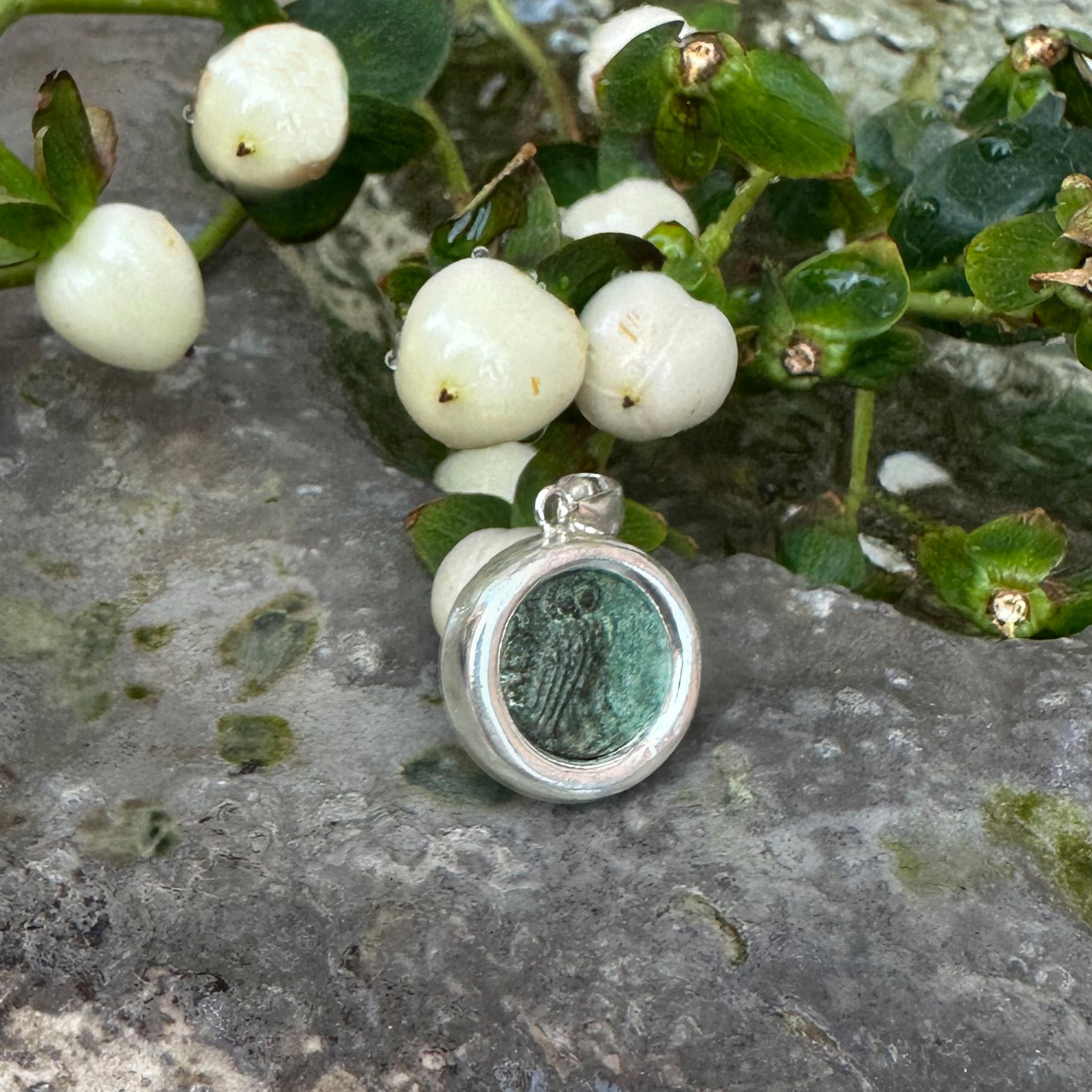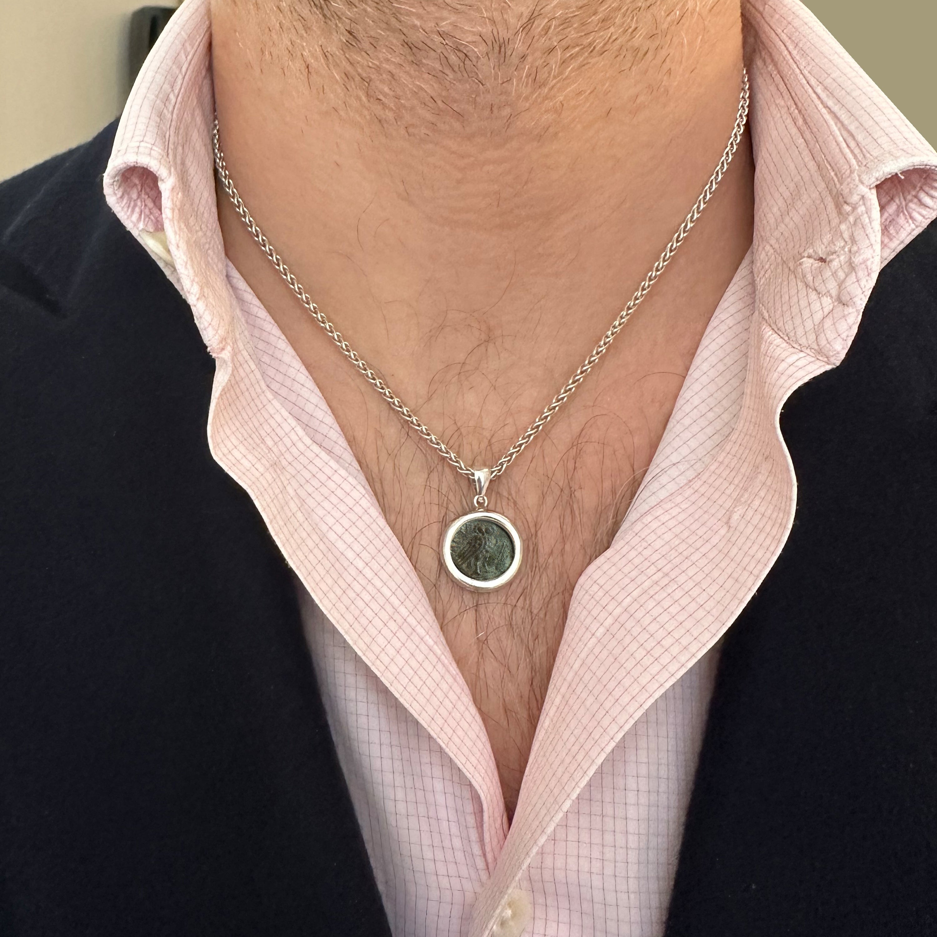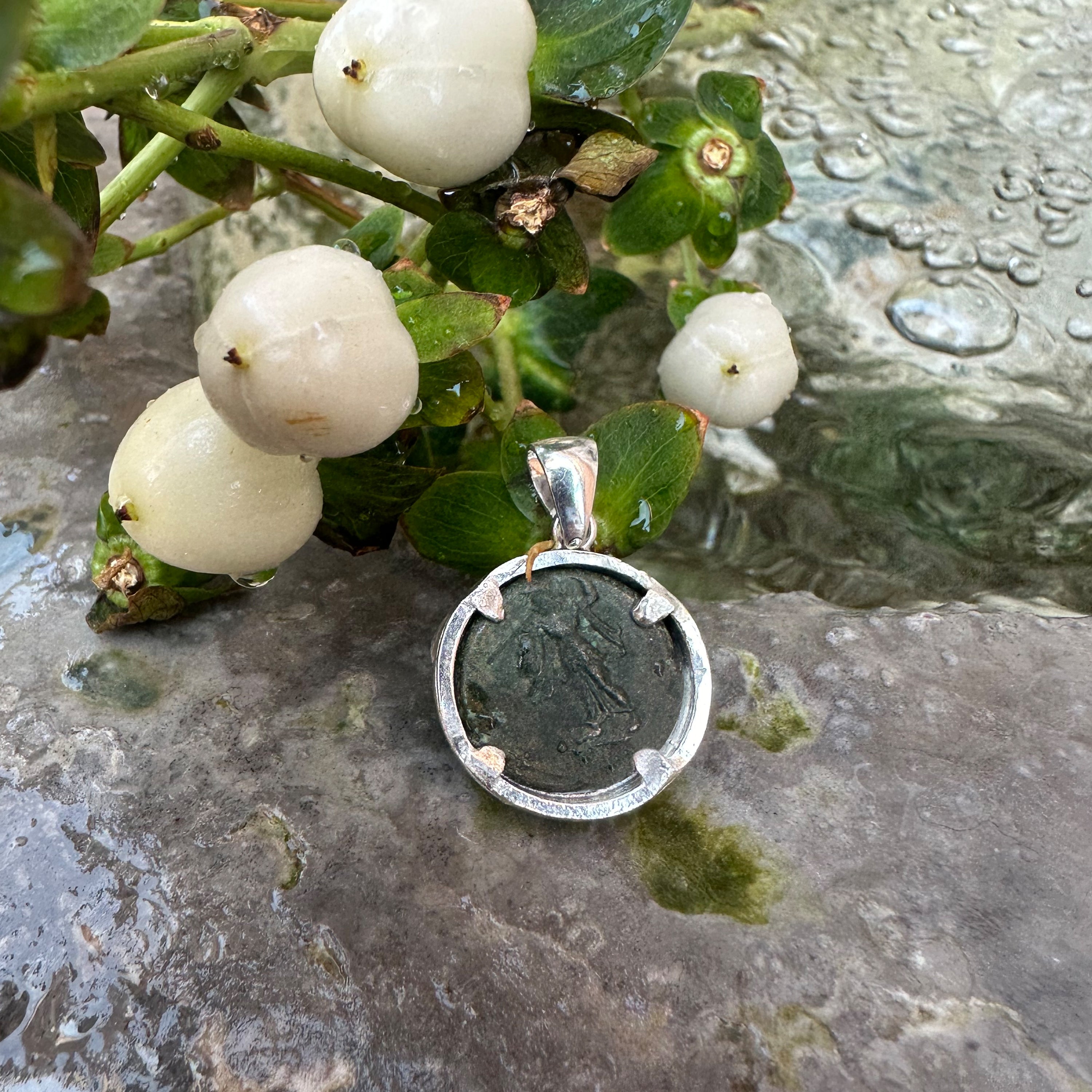 Set into this sterling silver pendant is an authentic Greek bronze coin from 225 BC. depicting an owl catching a lizard. On the reverse of the coin Athena moving towards left with a spear.