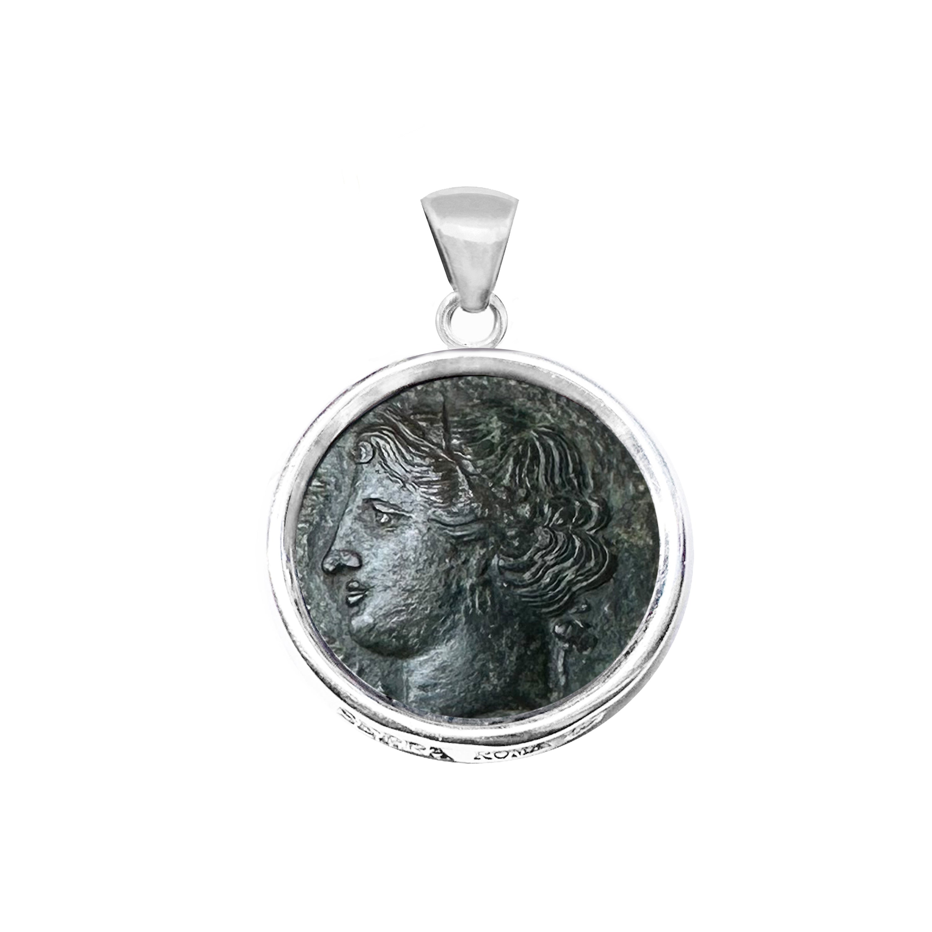 Set in this sterling silver pendant is an authentic Greek coin from the time of Hieron II, 3rd century BC, depicting Persephone; on the back we can see a bull.