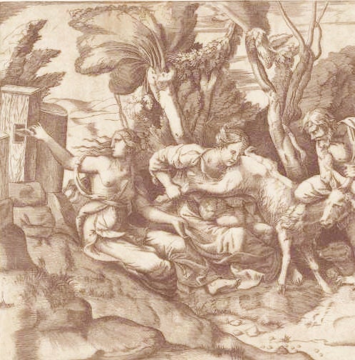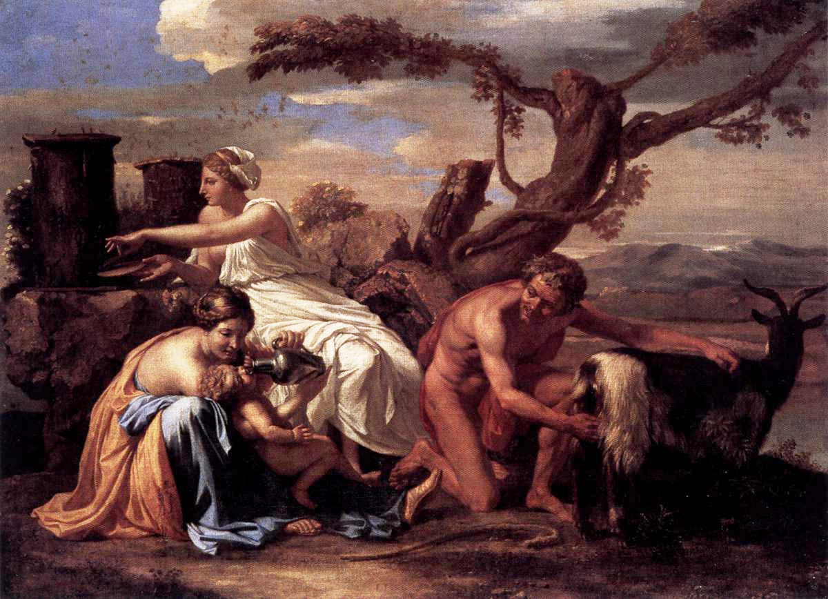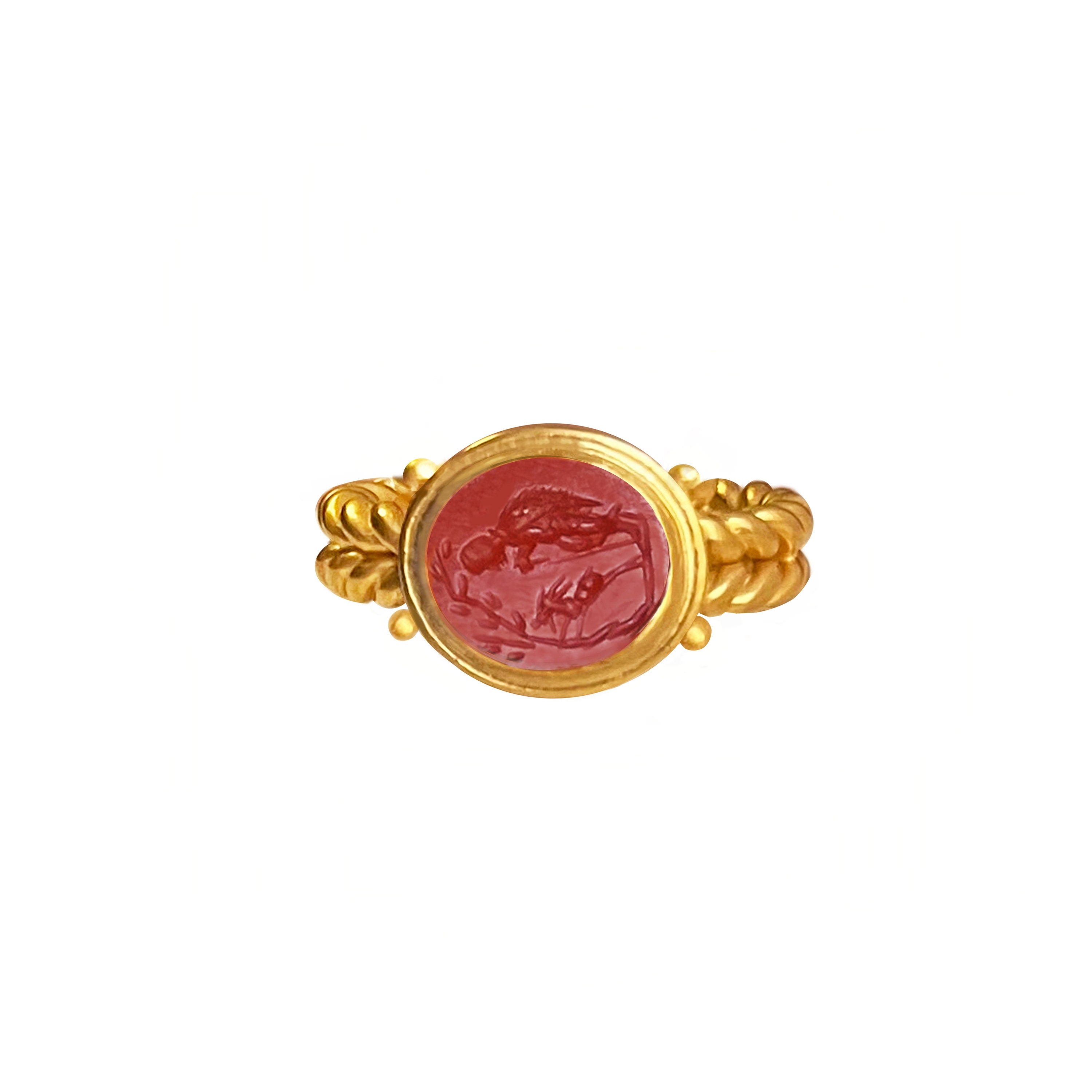 An authentic Roman carnelian from the 1st-2nd century AD has been set in this 18 kt gold ring. which depicts the goat Amalthea resting with the two front legs on a tree, and a shepherd behind her. The mythology says that Jupiter was the son of Cronus, the god who devoured his children because it was prophesied that one of them would usurp him. Jupiter's mother Rhea fled to Crete where she gave birth to him in a cave. Jupiter was placed in a cradle hanging from a tree on the slopes of Mount Ida in Crete and fed with wild honey and milk from the goat Amalthea. In a famous painting by Poussin, a nymph holds Jupiter in her arms, holding a jug of milk to her lips, while another collects honey and a shepherd milks the goat Amalthea.