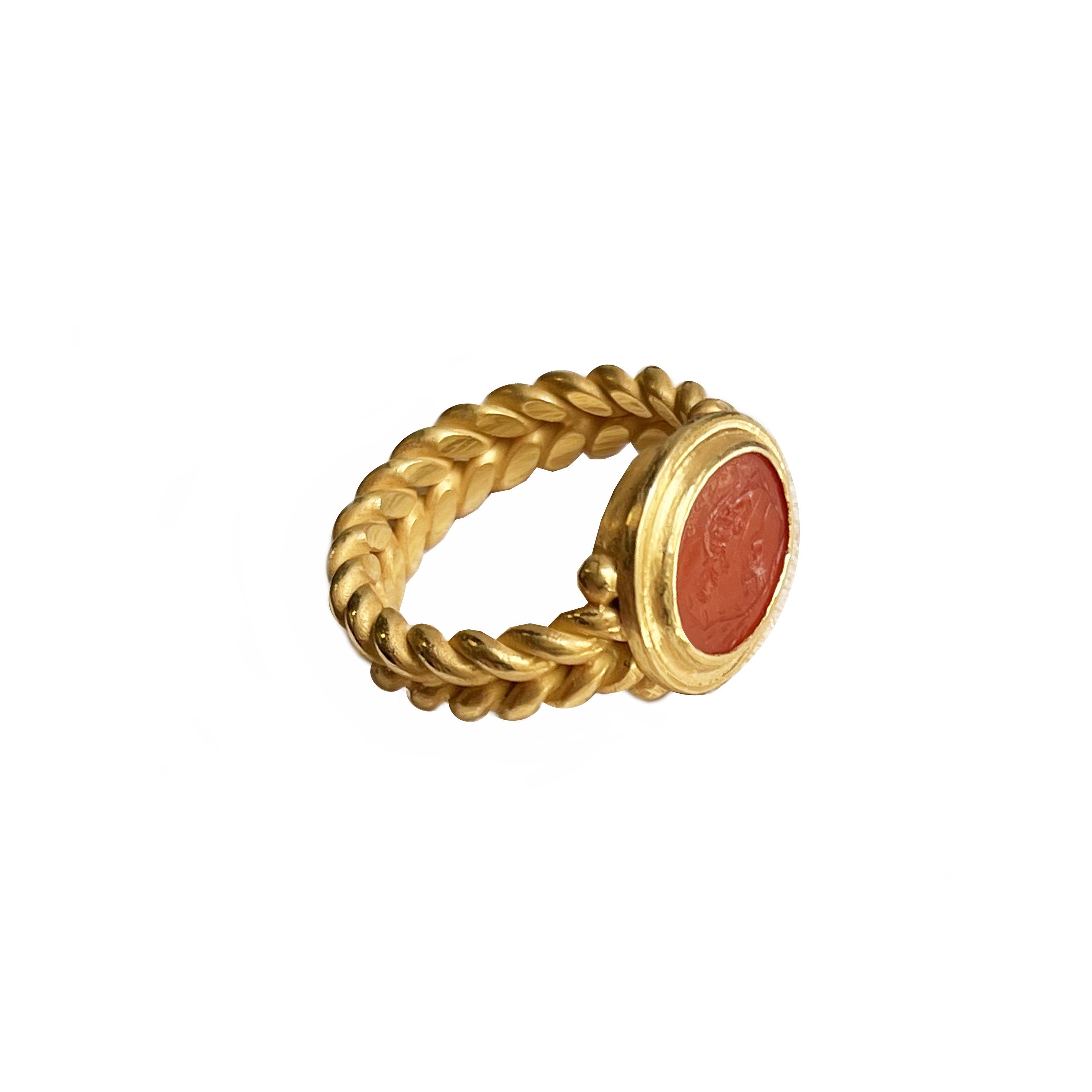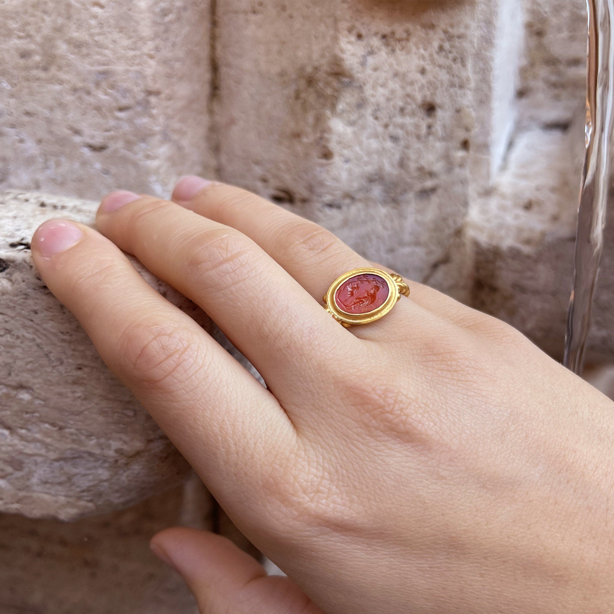 Authentic Roman Carnelian Intaglio 18Kt Gold Ring depicting Amalthea