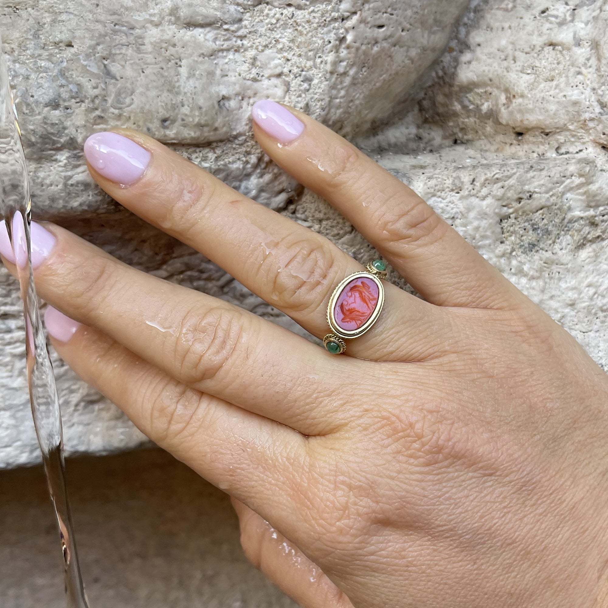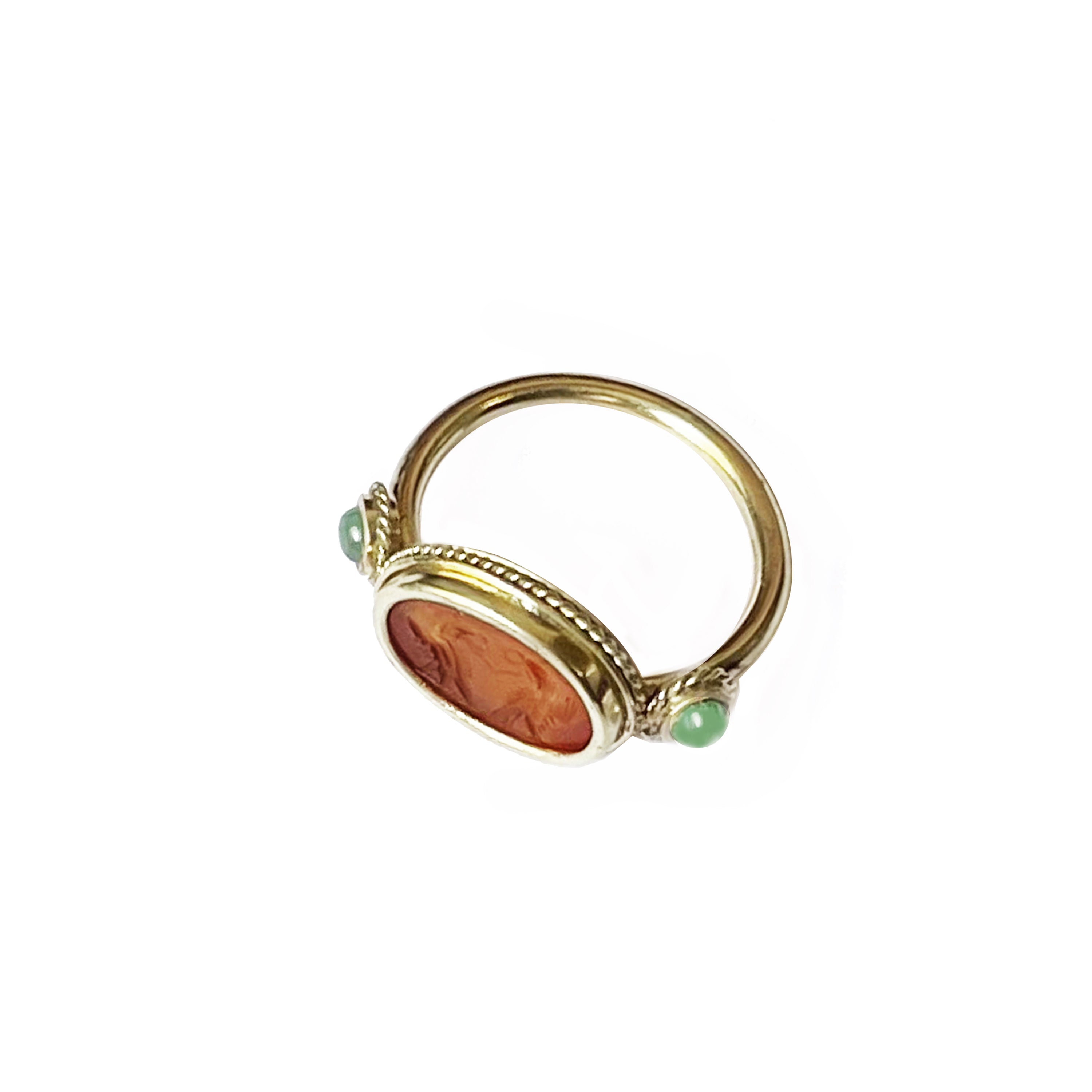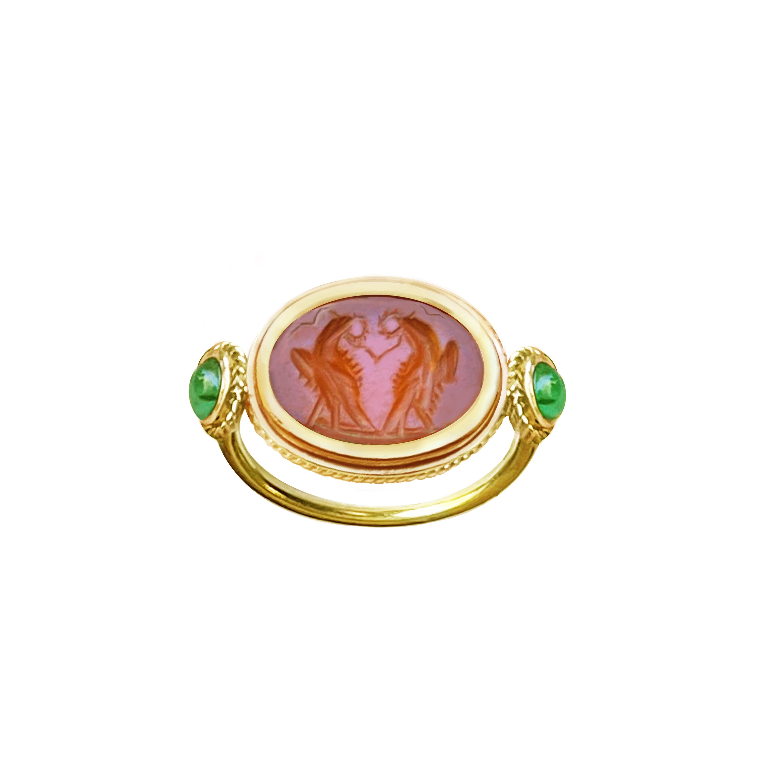 This ring features a Roman intaglio on carnelian from the 2nd to 3rd century AD, depicting two eagles with laurel wreaths.