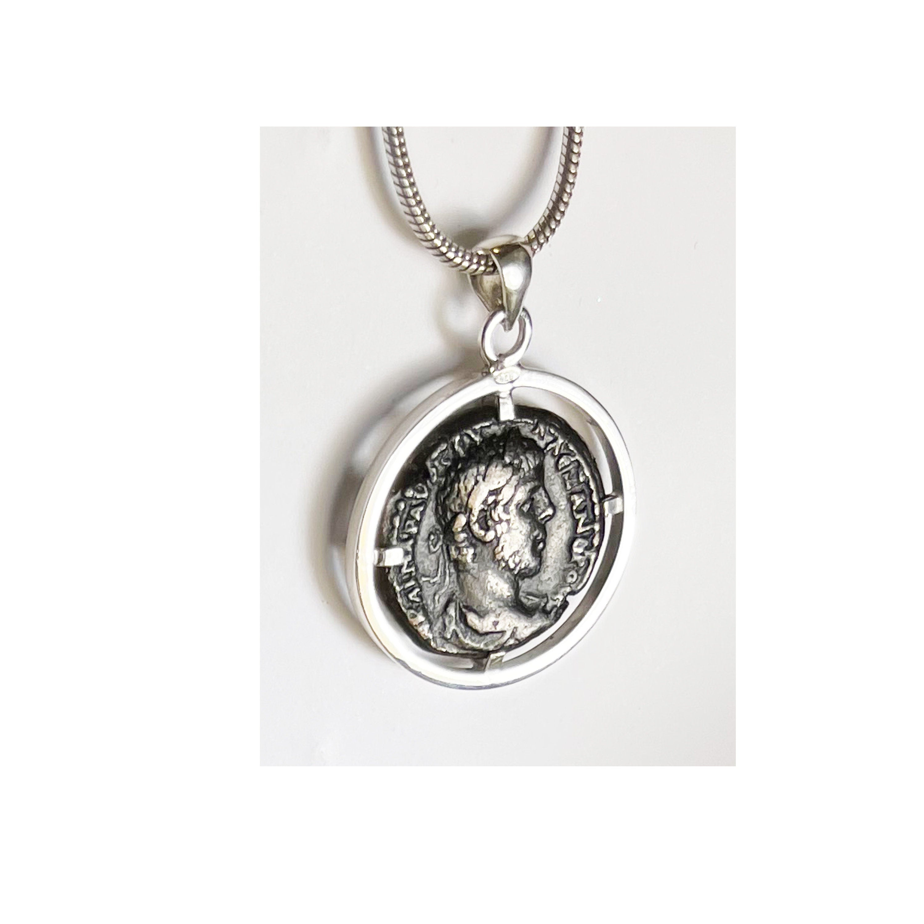 Set within this sterling silver pendant is an authentic Roman bronze coin, dating back to the reign of Emperor Septimius Severus in the 3rd century AD. One side of the coin features Helios, the Sun god, depicted with a radiant head, while the other side portrays the likeness of the Emperor himself.