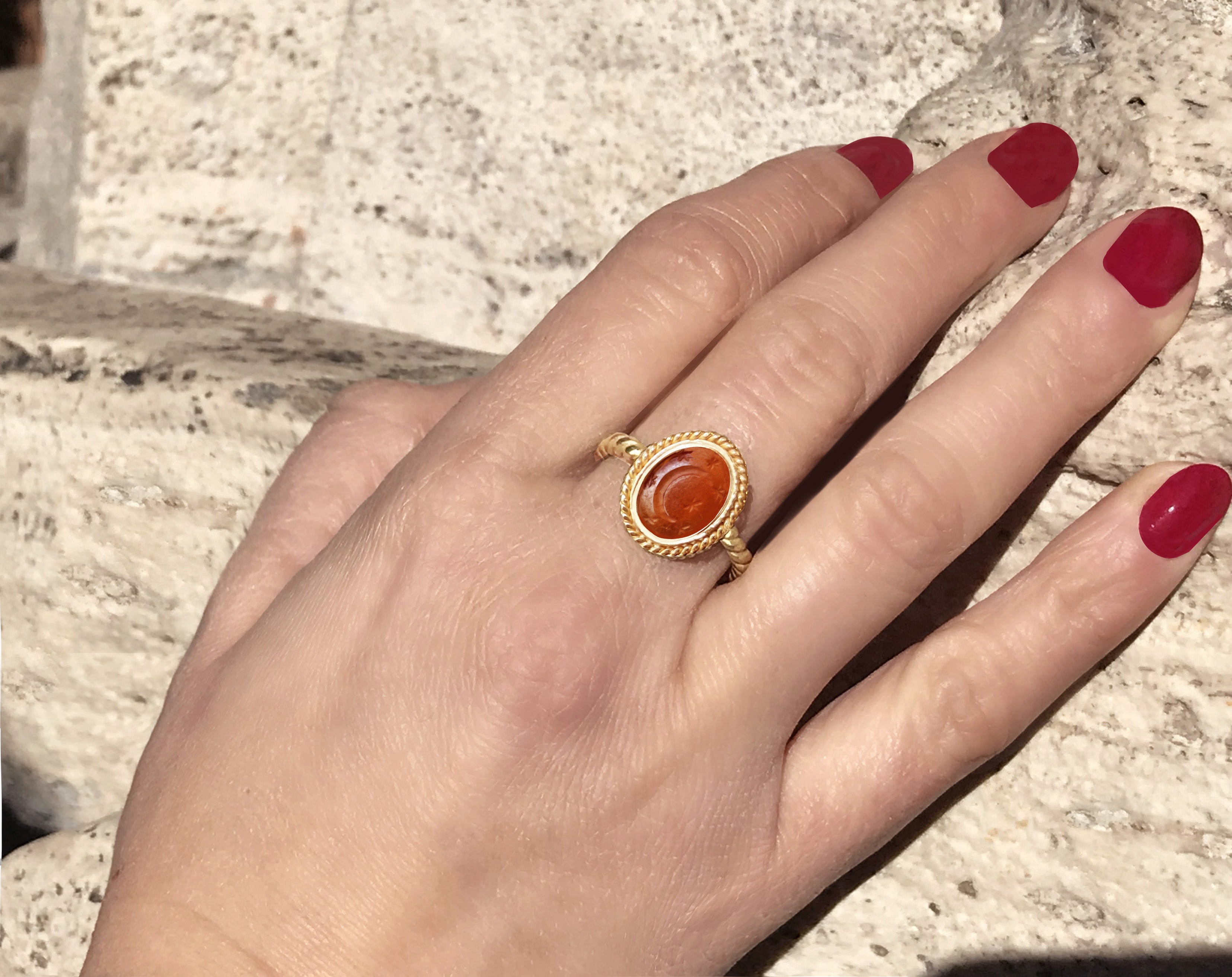 • Handmade 100% Made in Italy • Authentic Intaglio 2nd cent AD • Gemstone: Carnelian • Size: 7 US Adjustable • Band material: 18 kt Gold • Order Processing Time: 1 Business Day • Worldwide Delivery Time: 1-5 Business Days