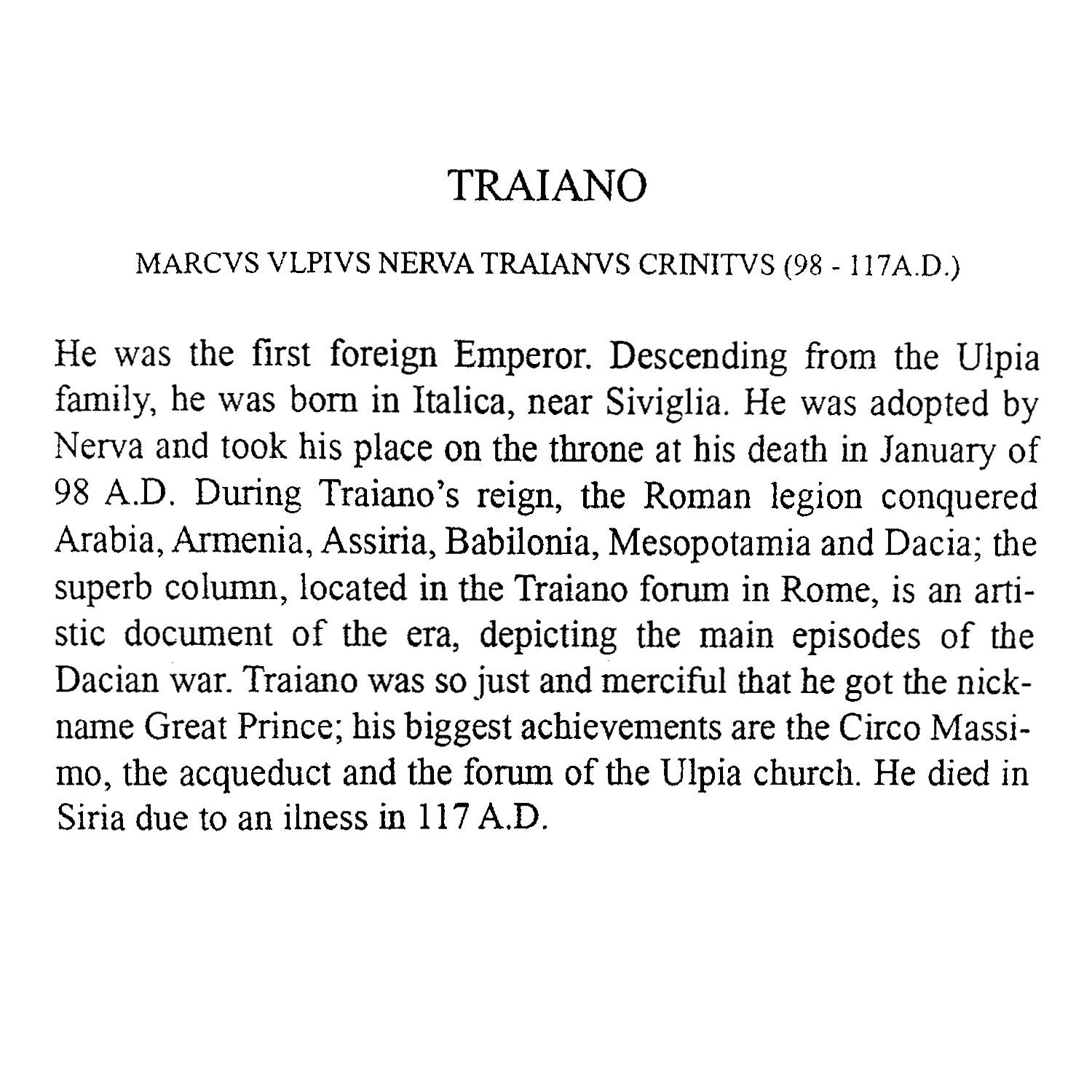 Trajan ( 18 September 53 – 8 August 117) was Roman emperor from 98 to 117. Officially declared by the Senate optimus princeps ("best ruler"), Trajan is remembered as a successful soldier-emperor who presided over the greatest military expansion in Roman history, leading the empire to attain its maximum territorial extent by the time of his death. He is also known for his philanthropic rule, overseeing extensive public building programs and implementing social welfare policies, which earned him his enduring reputation as the second of the Five Good Emperors who presided over an era of peace and prosperity in the Mediterranean world.