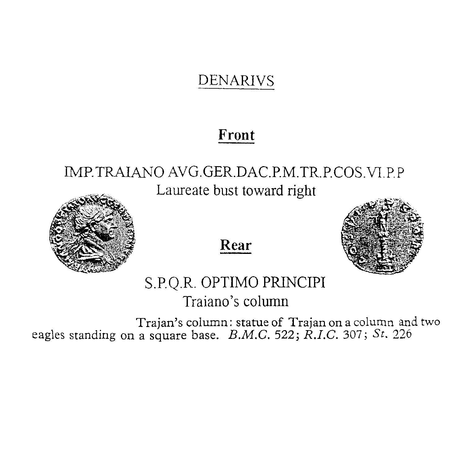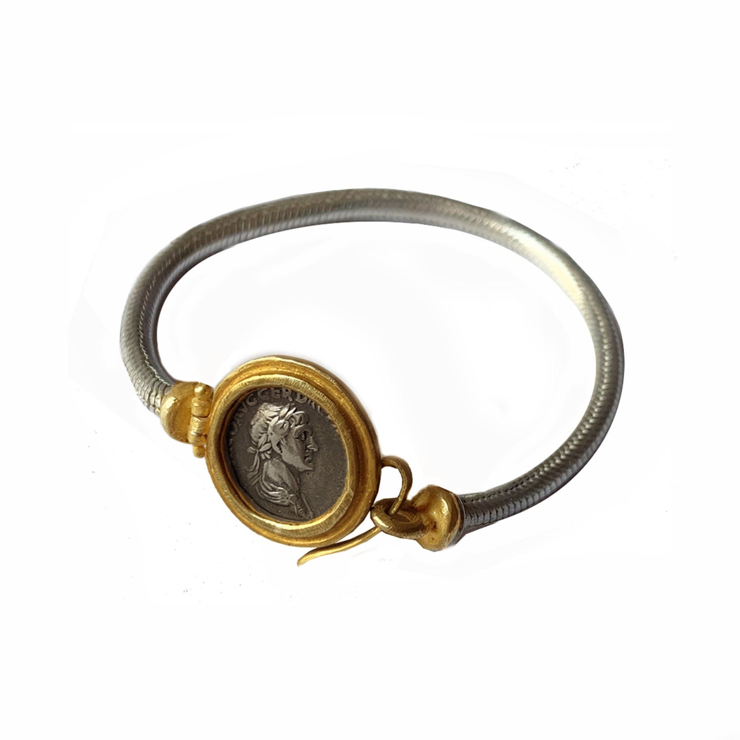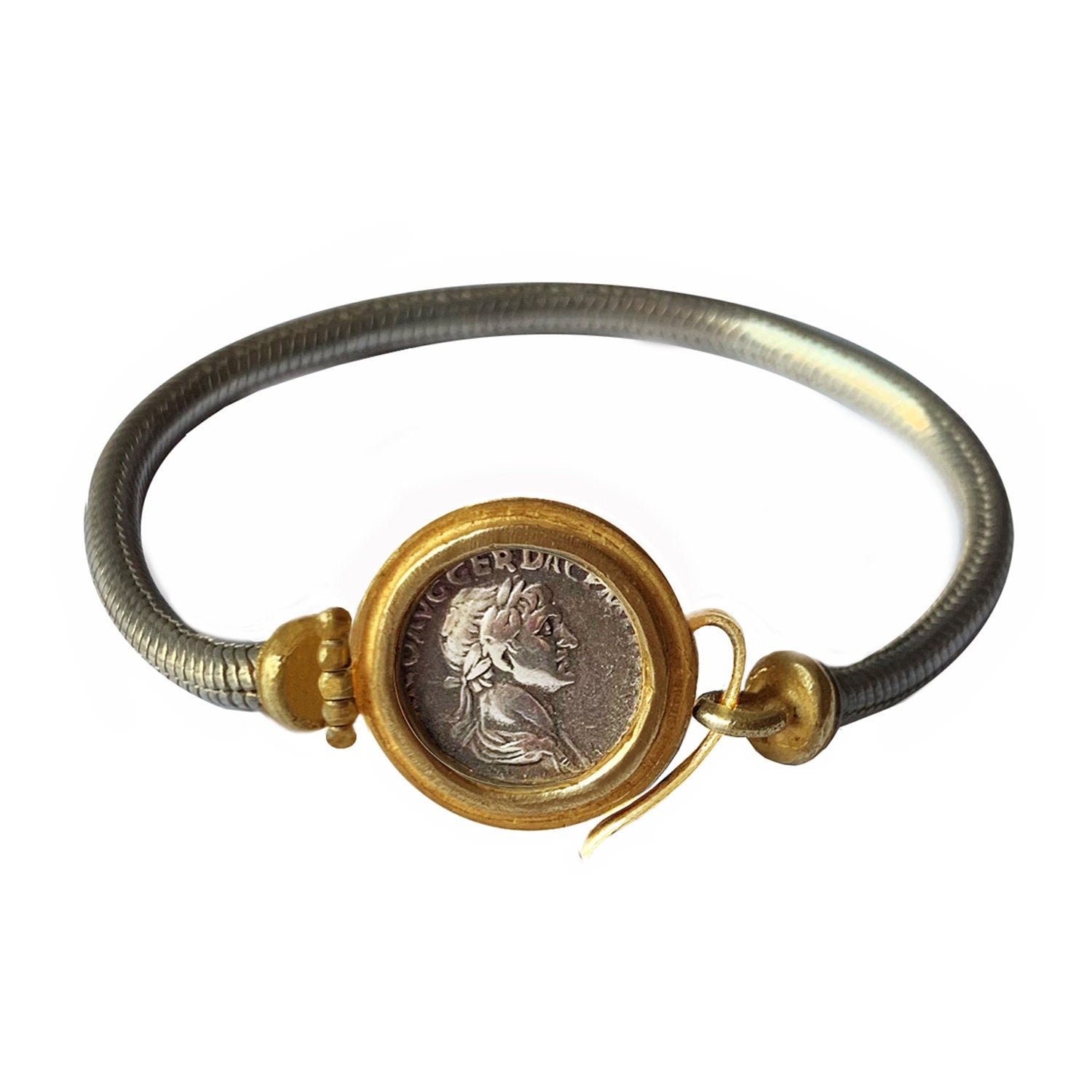 The silver bracelet has an authentic Roman coin depicting Emperor Trajan. In the reverse side of the coins we can see Trajan's column.