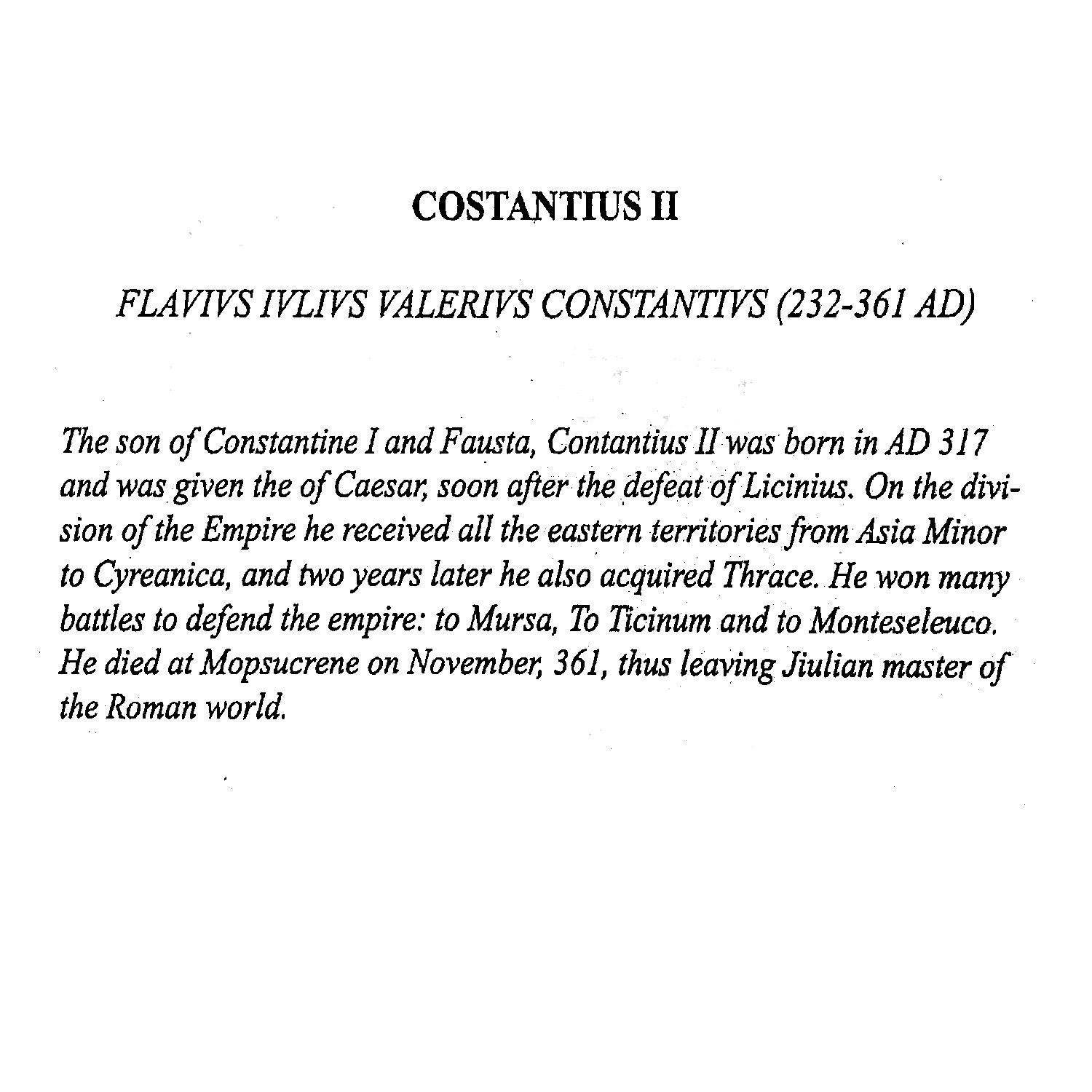 Constantius II ruled the Roman Empire between 337-361 CE. He was the second son of Constantine the Great and Fausta. Constantius was a devout follower of Arianism Christianity. Ruling for 24 years, he was the longest reigning son of Constantine and therefore, arguably, the most successful.