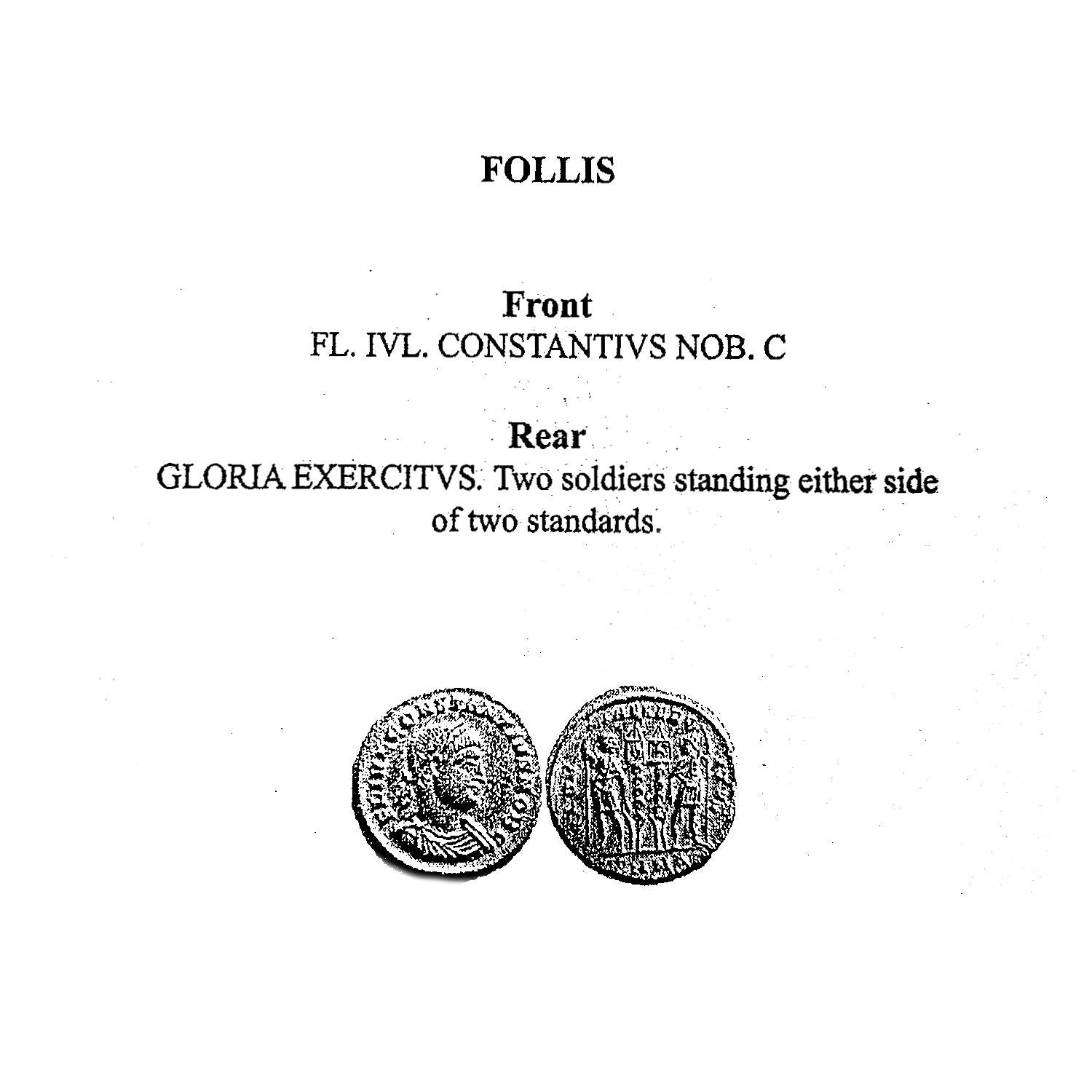 The silver bracelet has an authentic roman bronze coin ( Follis- 3th century A.D.) depicting Emperor Constantius II. In the reverse side of the coin there are two soldiers standing either side of two standards.