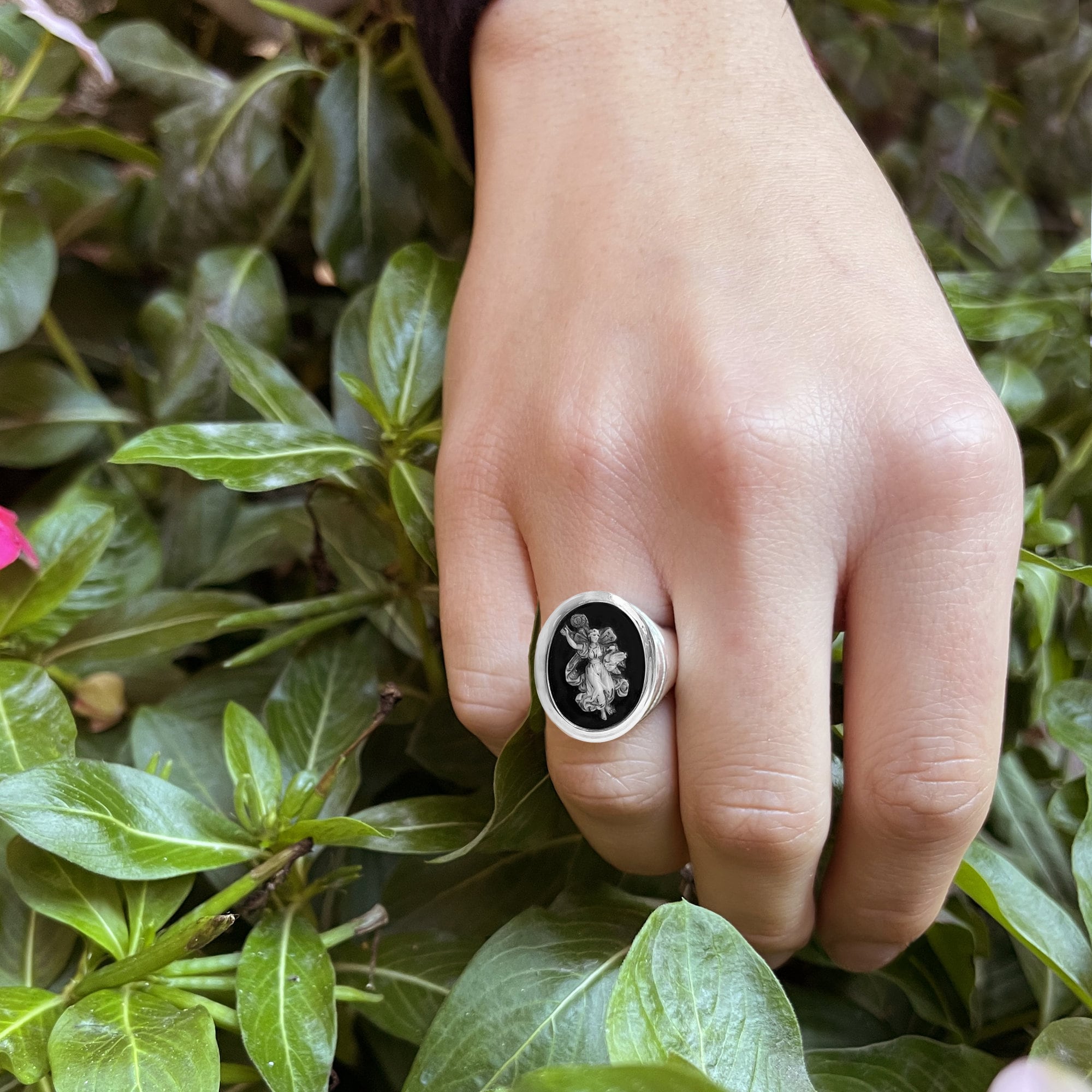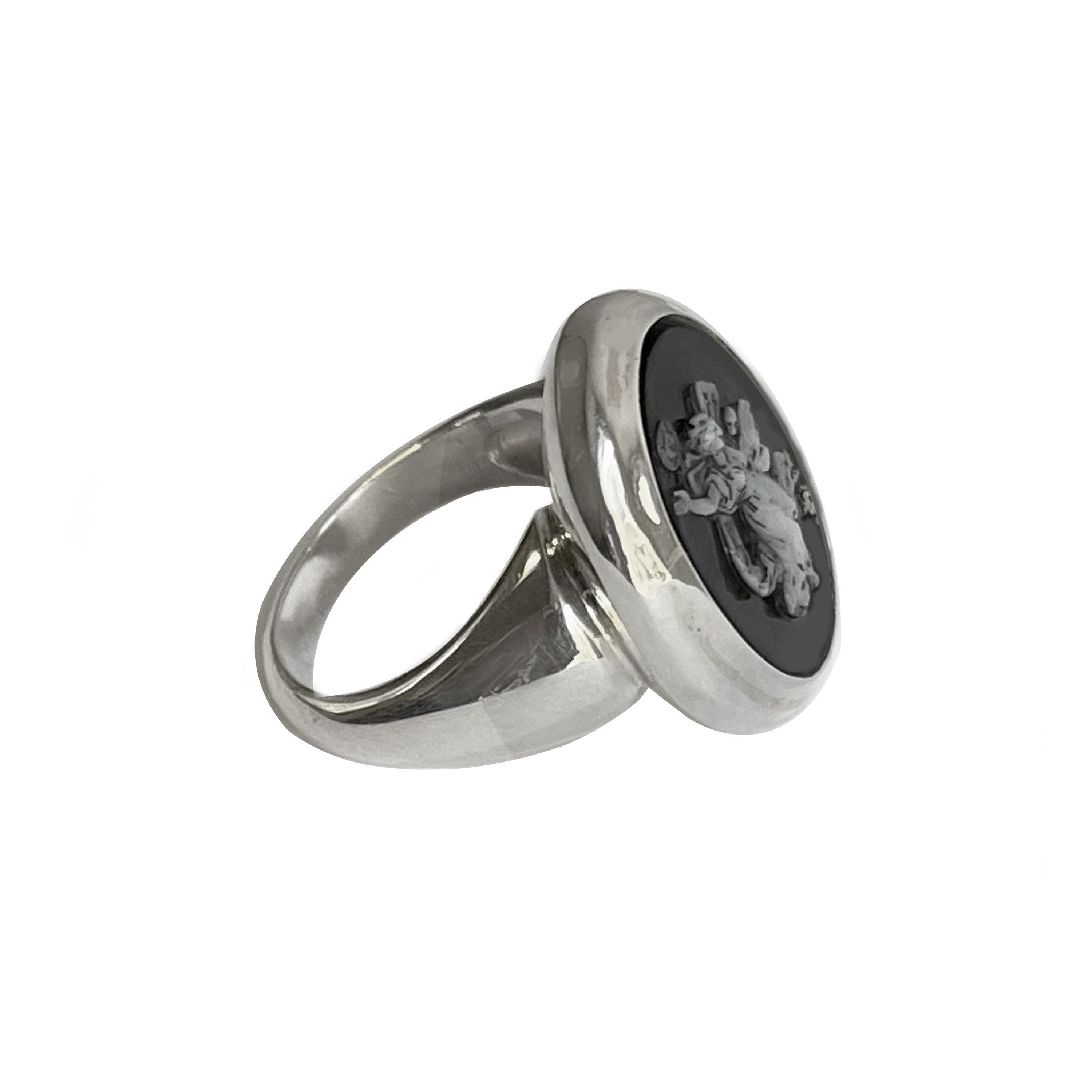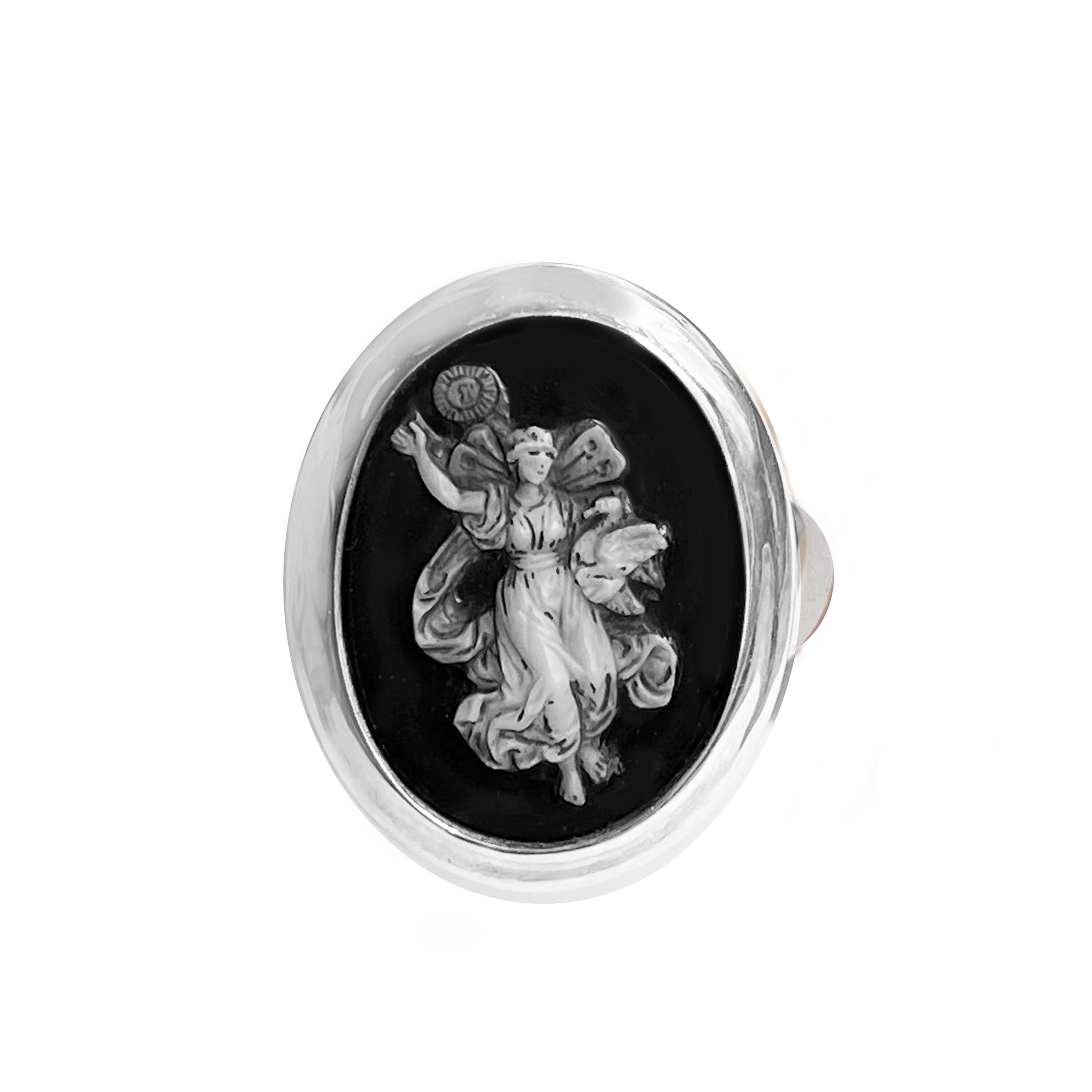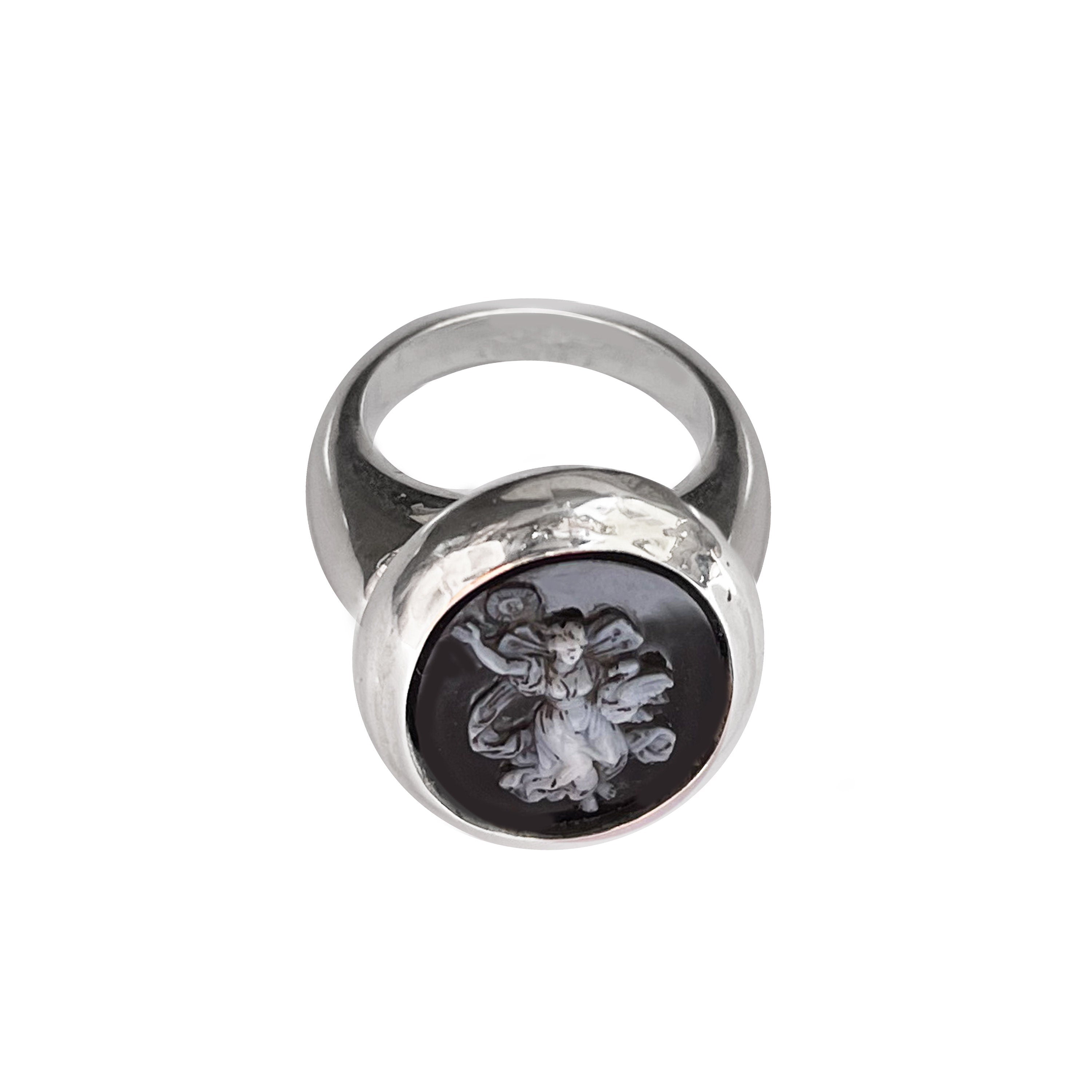Two-layered Agate Roman Cameo Silver Ring depicting the Goddess Nike