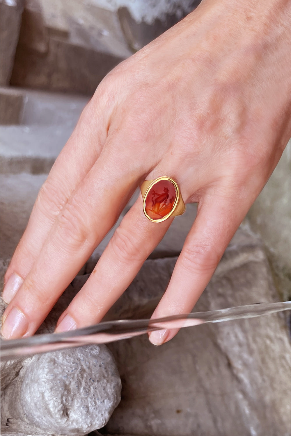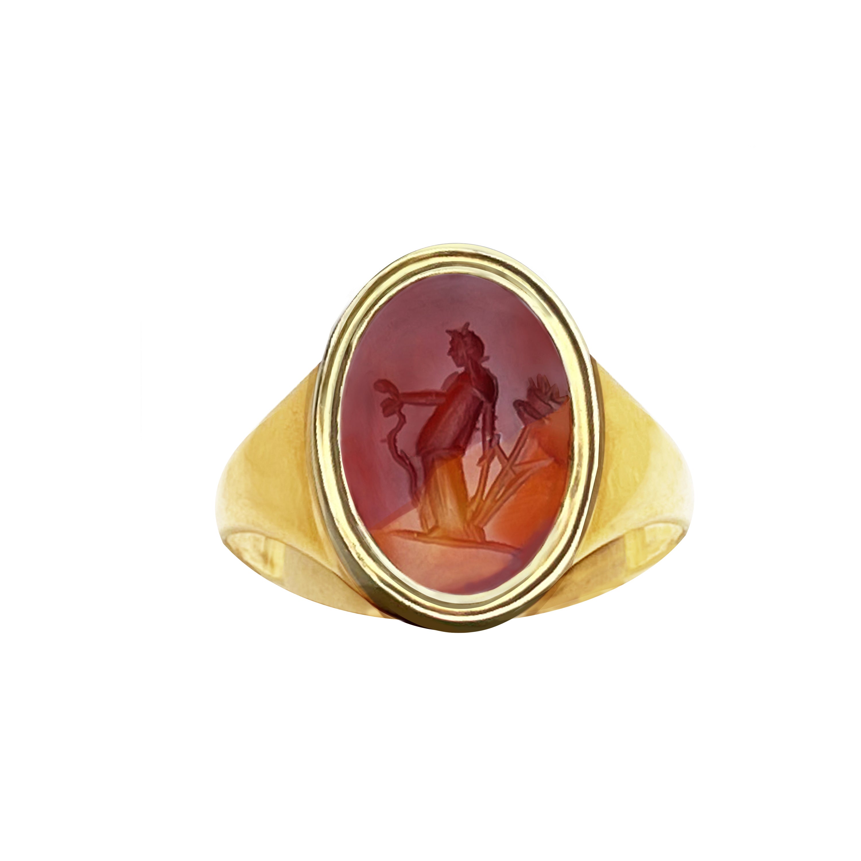 Authentic Roman Carnelian Intaglio 18Kt Gold Ring depicting Goddess Vesta