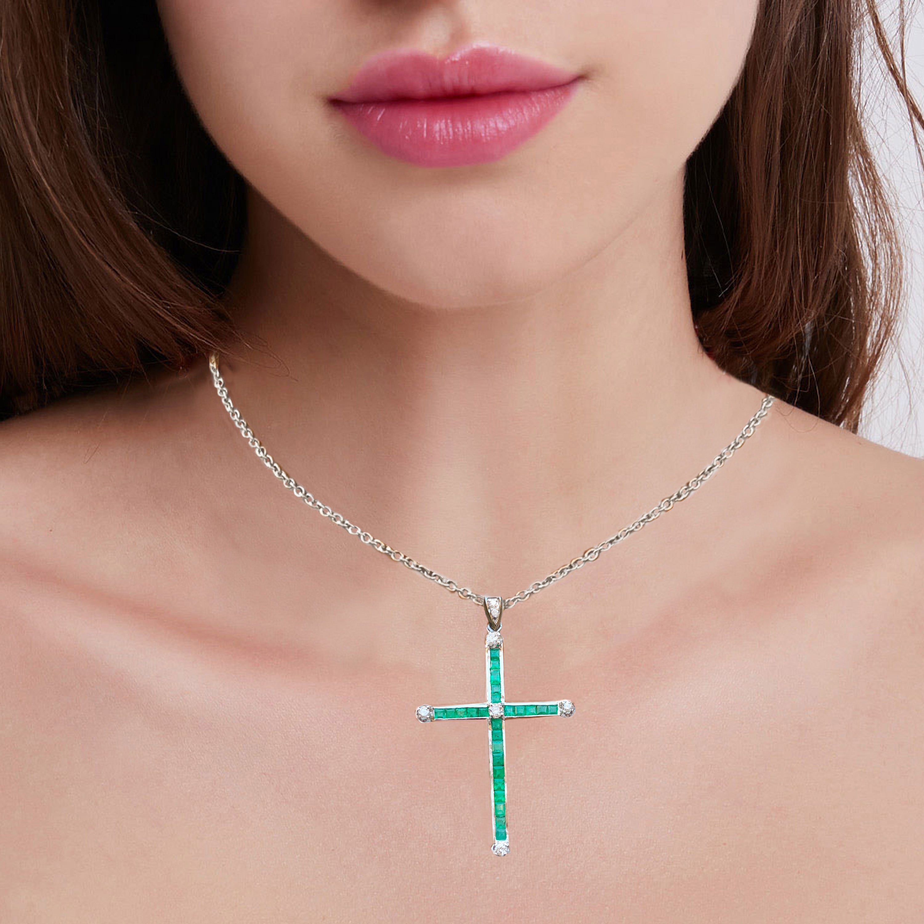 Vintage Pure Square Emerald and Diamond Cross Pendant in 18 Kt White Gold