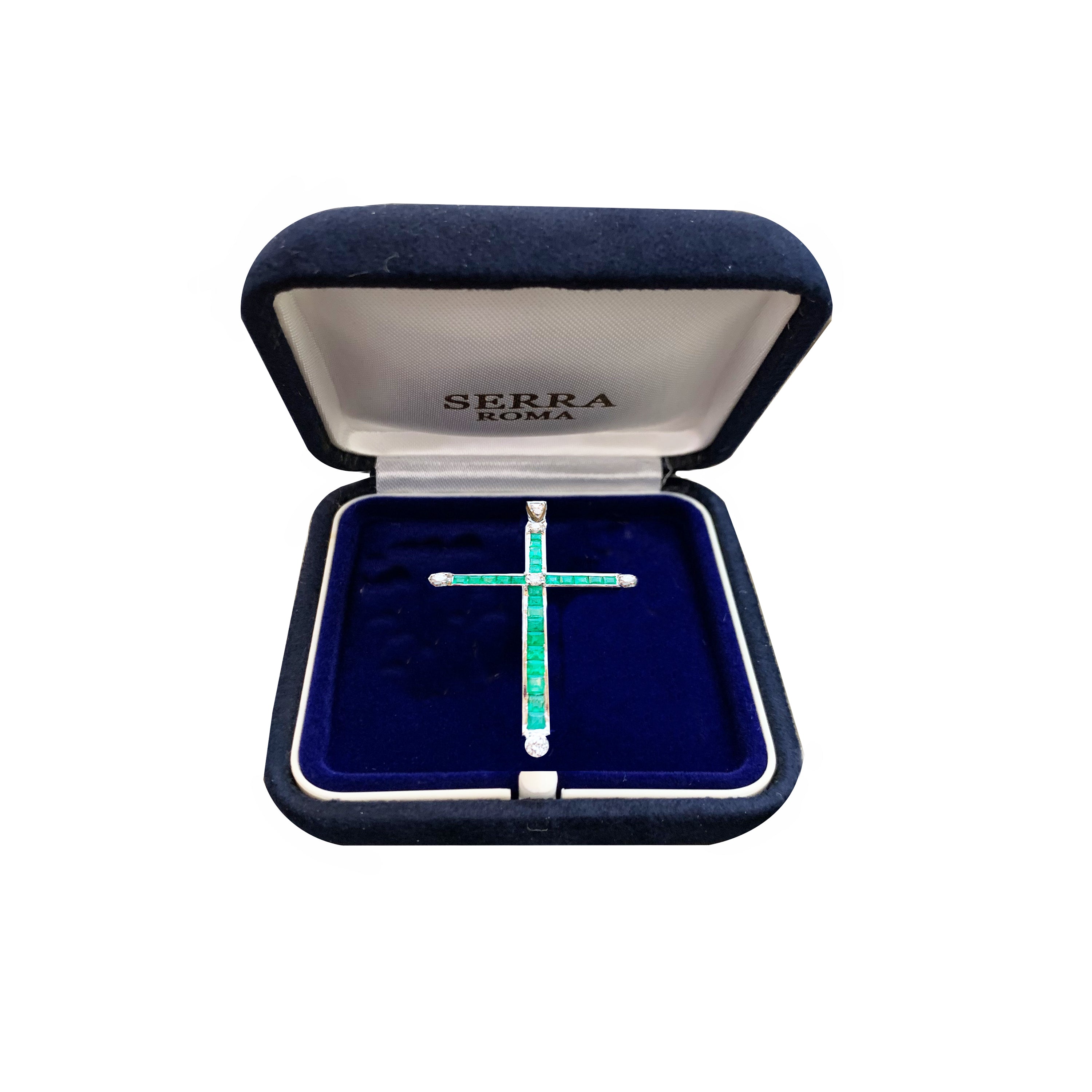 Crafted with meticulous attention to detail, this exquisite cross pendant showcases a harmonious blend of emeralds and diamonds set in 18K white gold. Handcrafted in Italy, this vintage piece exudes timeless elegance.