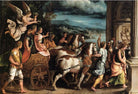 In classical iconography, the winged Victory is with him on the chariot and surrounds his head with a laurel wreath, while she holds the scepter in her hand.