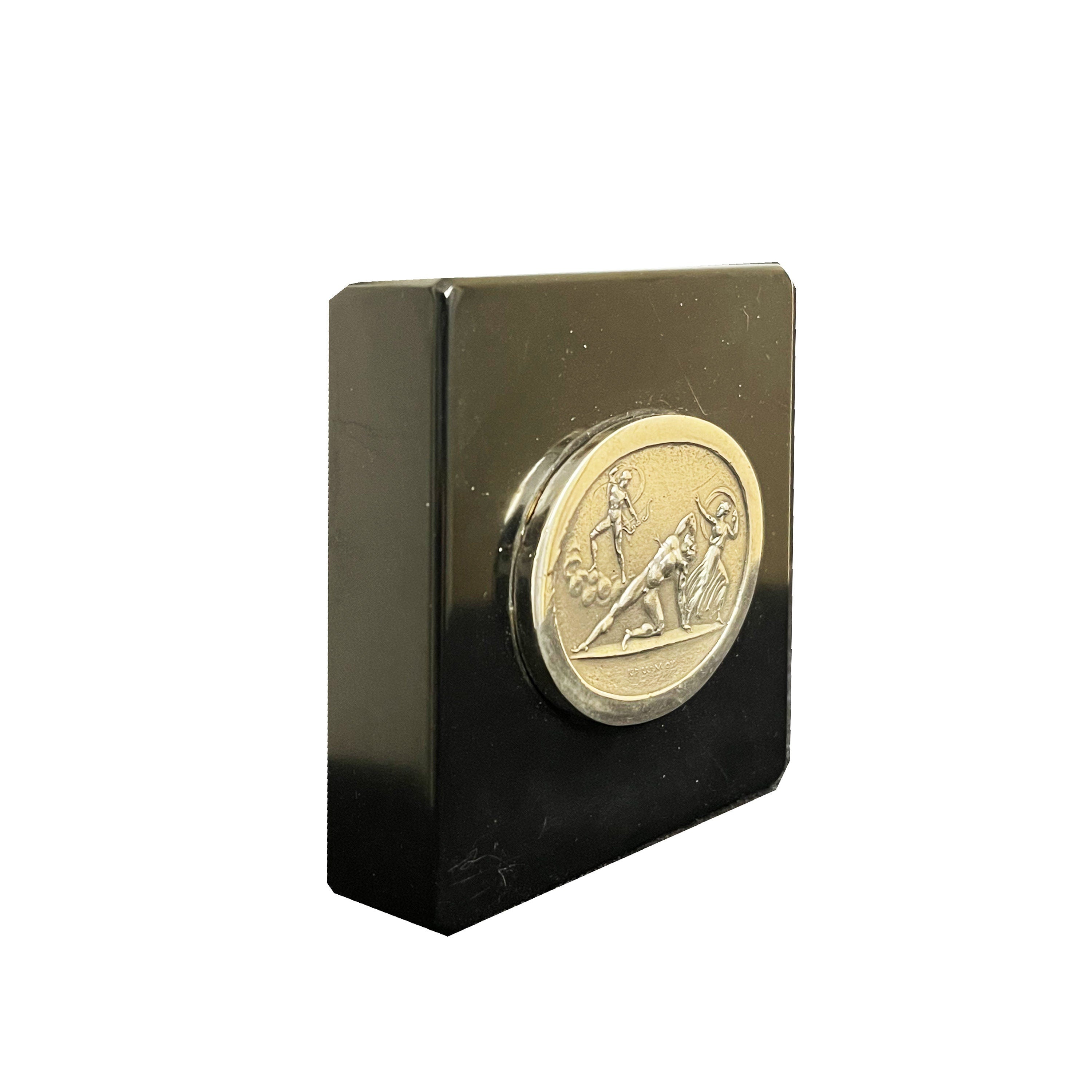 Sterling silver and marble paperweight depicting goddess Artemis, Orion and his wife Eos.