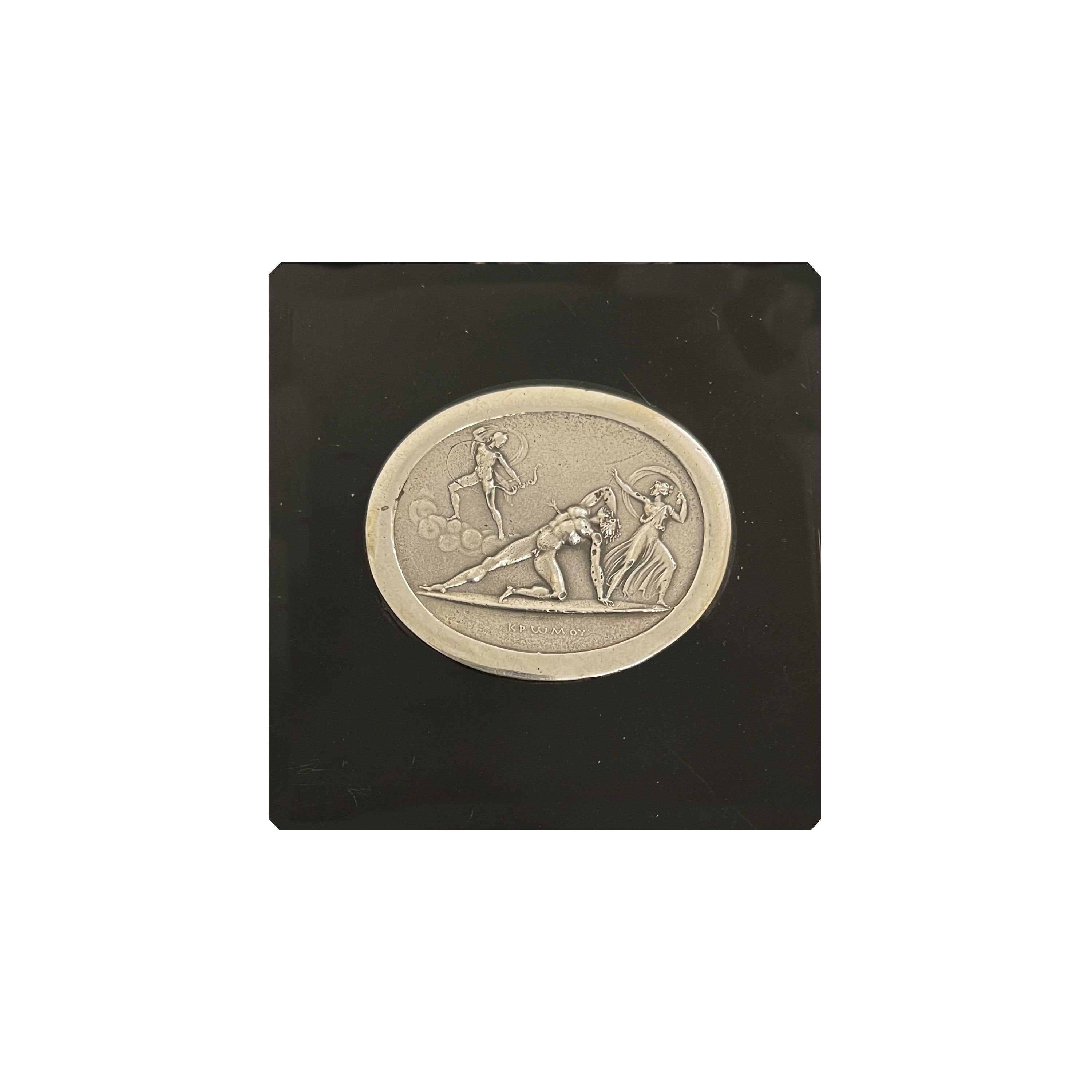 This 925 silver plaque on black Belgian marble depicts three characters: the goddess Artemis shooting an arrow, the giant Orion and, on the right, his wife Eos ( Aurora )
