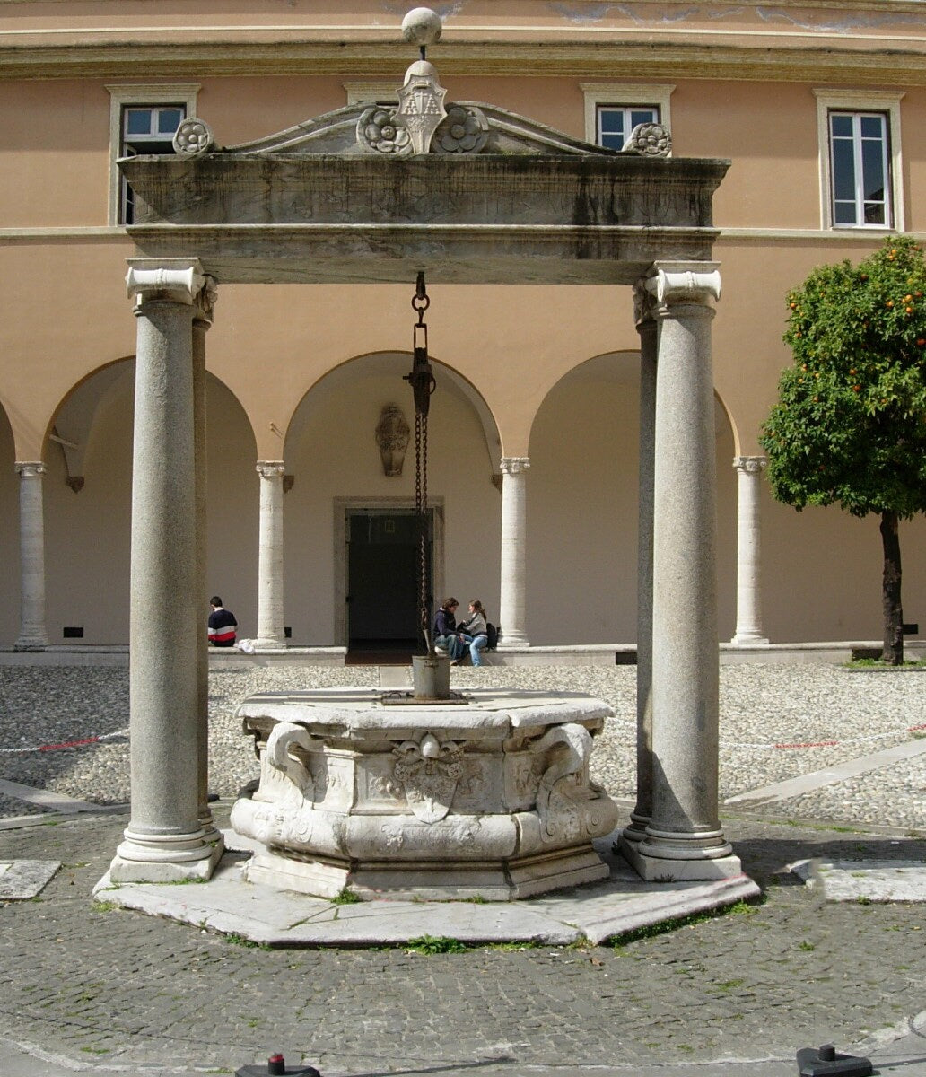 The characteristic well (symbol of the Faculty of Engineering), and in the center of the courtyard of the Basilica, framed in an aedicule set on coupled Ionic columns that support the entablature and the tympanum. Here we find the Roverian references: the name of Cardinal Sisto, under whom it was initiated, and the coat of arms are placed on the tympanum, while the inscription on the entablature recalls the Cardinal Leonardo with whom it was completed, probably in 1517. The project is attributed to Antonio da Sangallo, who created it with the collaboration of Simone Mosca.