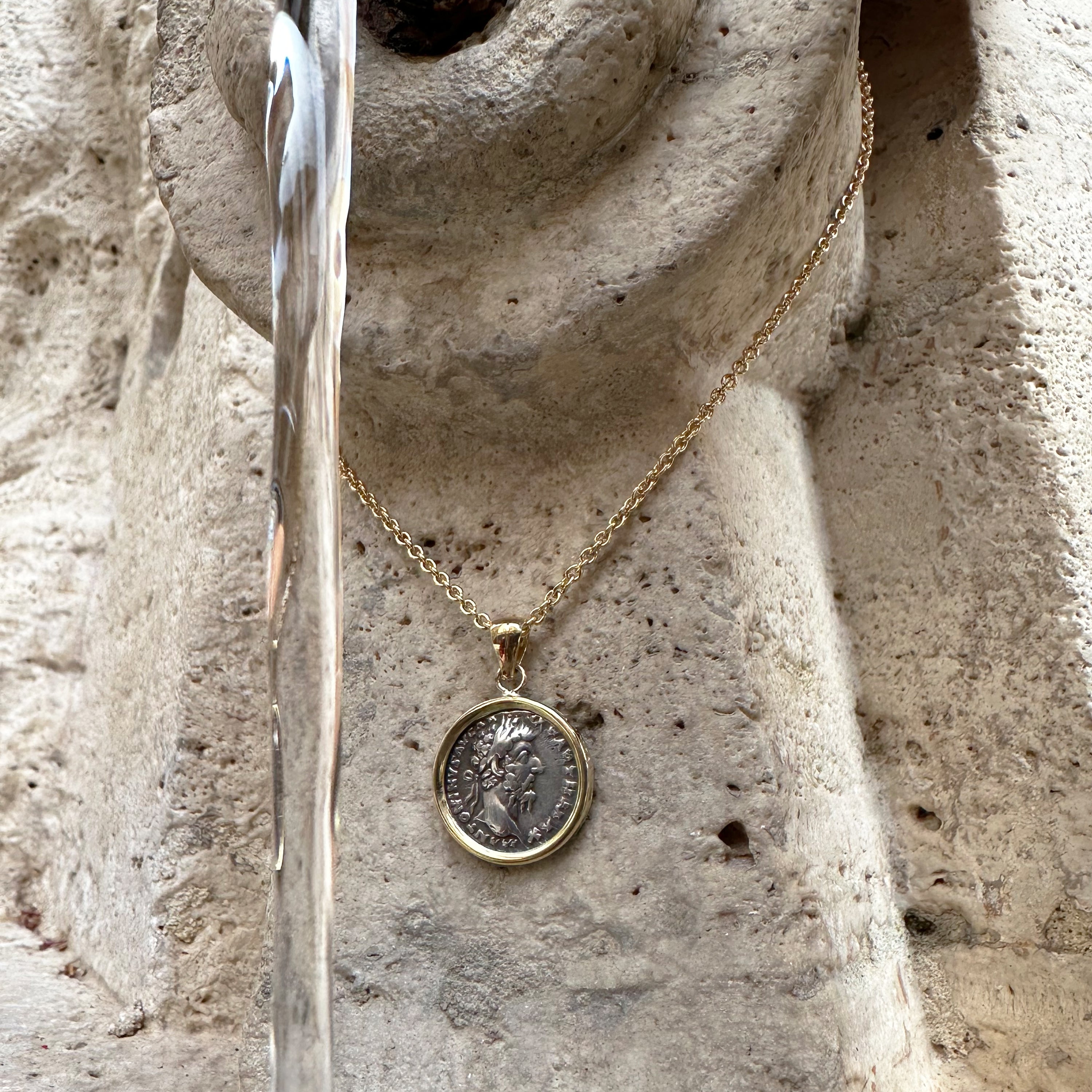This exquisite pendant features an original Roman coin dating back to the 2nd century AD, showcasing Emperor Marcus Aurelius. Crafted from 18 Kt gold, it is a testament to the timeless beauty and historical significance of ancient Roman art. The coin's reverse side displays a depiction of Goddess Fortune.